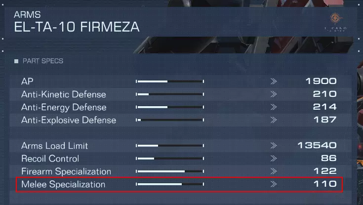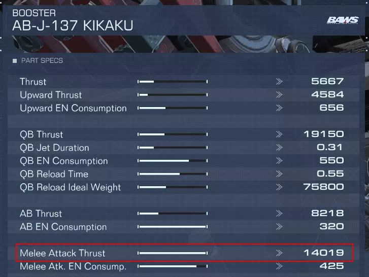 所有手臂部件都有一个名为【近战专精】的特定属性,你可以通过按下【显示切换】按钮来查看任意部件的完整属性面板。你能获得的早期高【近战专精】手臂之一是菲尔梅萨手臂。 对于混合流派build,你需要将手臂更换为平衡【枪械专精】和【近战专精】属性的部件。虽然【枪械专精】不像【近战专精】那样直接增加伤害,但它确实能提高远程武器的 accuracy,因此你应根据自己对近战和远程的使用需求来平衡这两项属性。 推进器方面,我们需要重点关注你使用的推进器类型。在我看来,近战的首选强化配件是KIKAKU,它拥有最高的【近战攻击突刺】属性,该属性决定了你使用近战武器攻击敌人时向前突进的距离。