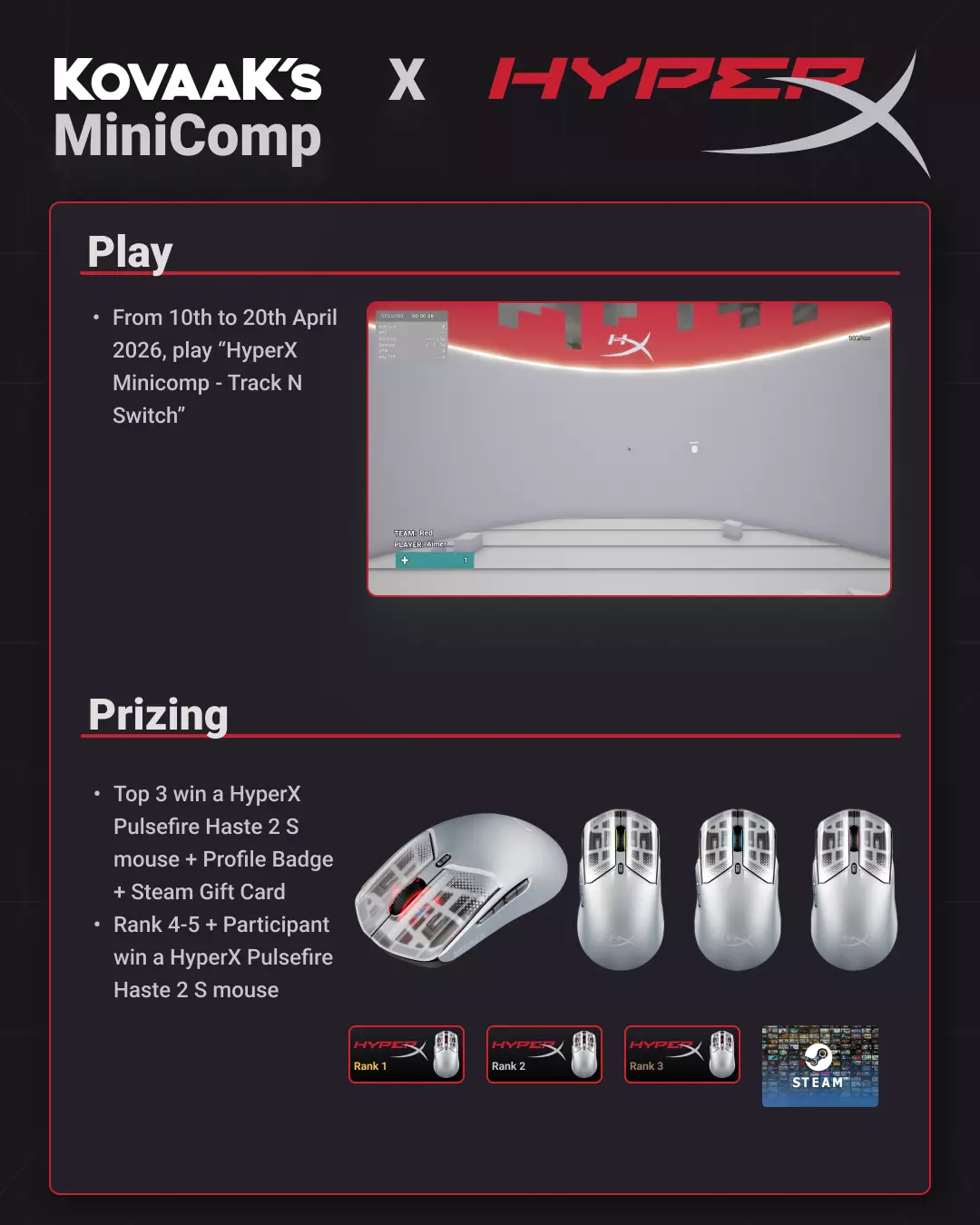 🔥《KovaaK's》x HyperX 迷你锦标赛现已开启! 参与【HyperX Minicomp - Track N Switch】场景并提交分数,截止日期…