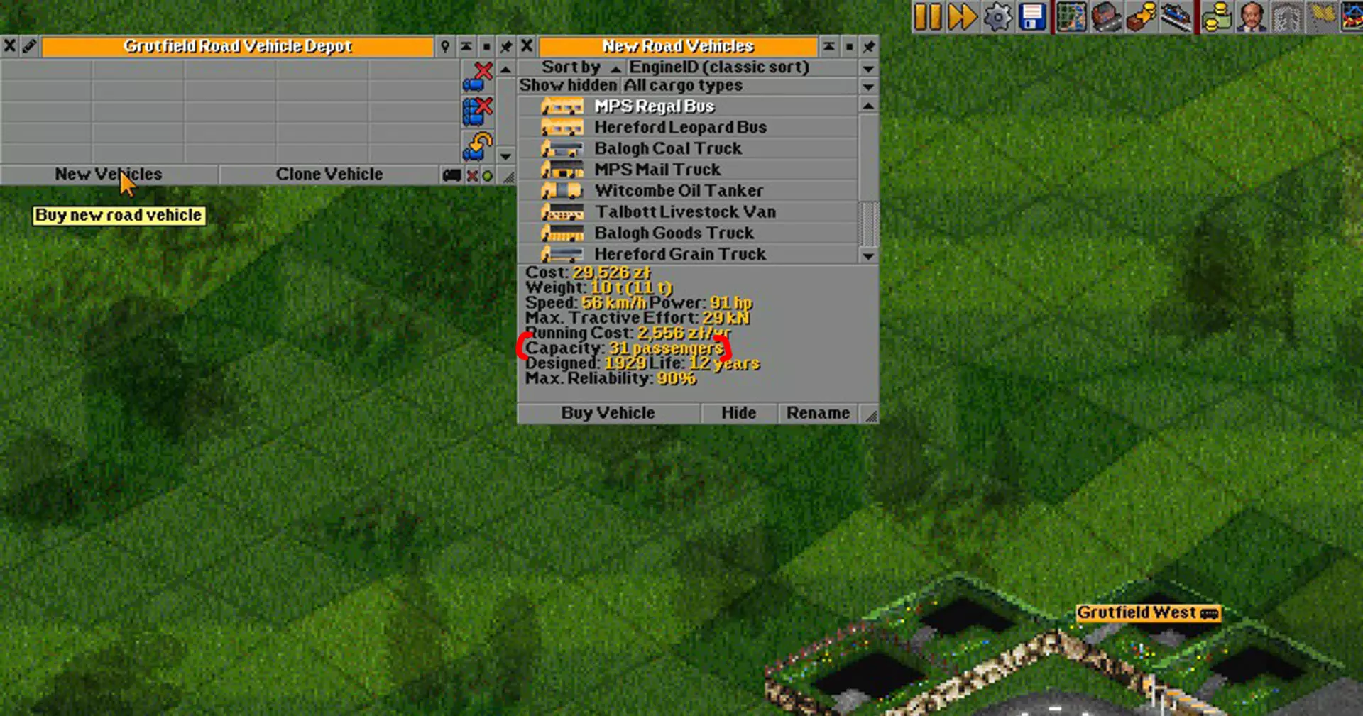 购买车辆 点击【新车】并选择想要的巴士。 原版游戏中有2辆巴士可供选择。 你还可以在参数中查看巴士的载客量(截图中红色括号所示部分)。 点击【购买车辆】。