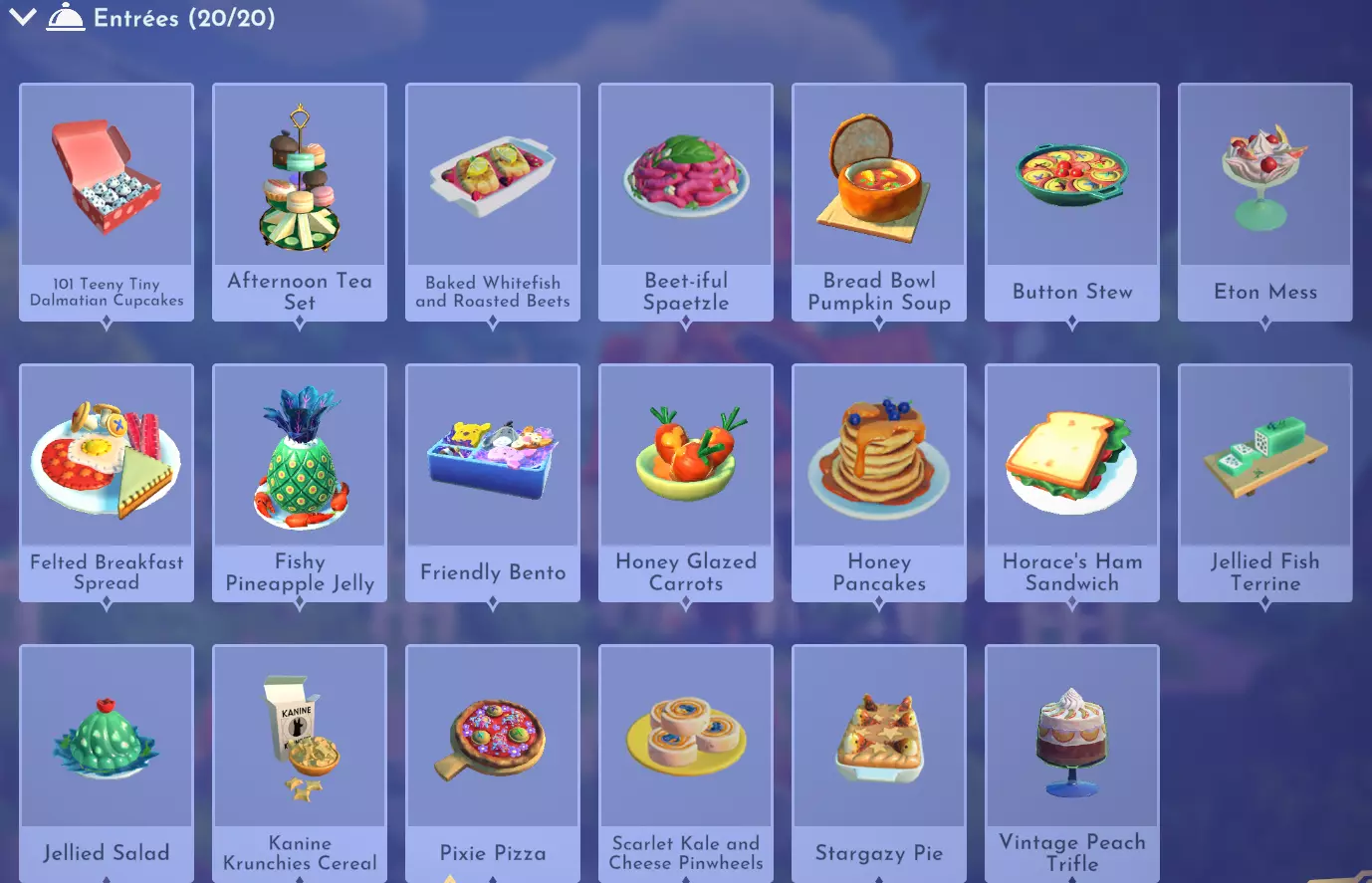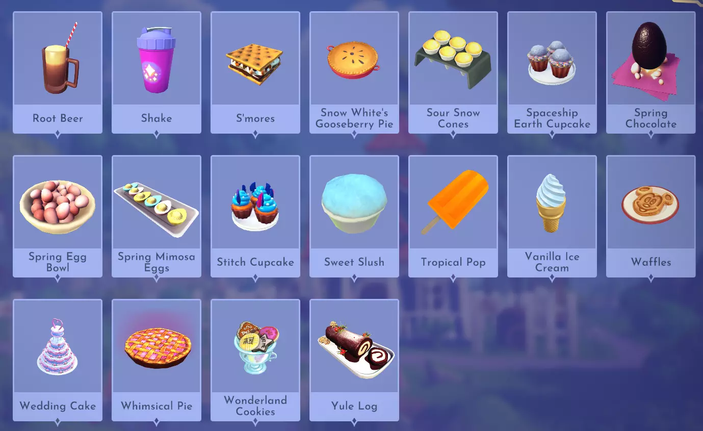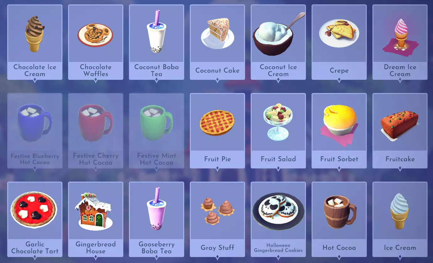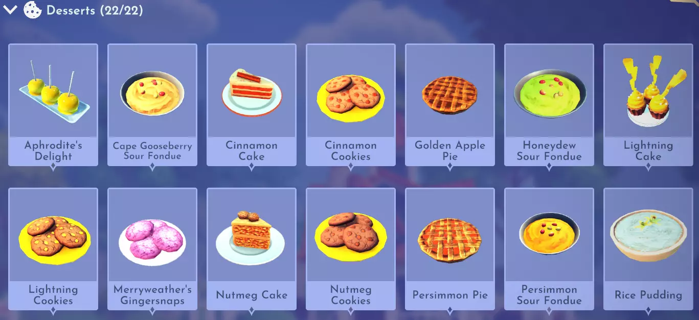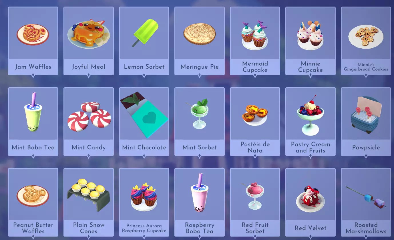 "My Hero" Cookie Sweet (ex. cocoa bean) + wheat + butter Apple Pie Apple + wheat + butter Apple Sorbet Apple + sugarcane + slush ice Aurora's Cake Wheat + egg + sugarcane + milk + fruit (ex. raspberry) Banana Ice Cream Banana + milk + sugarcane + slush ice Banana Pie Banana + wheat + butter Banana Split Banana + milk + sugarcane + slush ice + sweet (ex. sugarcane) Beignets Egg + wheat + canola + sugarcane Berry Salad Raspberry + gooseberry + blueberry Birthday Cake Egg + butter + sugarcane + wheat + cocoa bean Biscuits Sugarcane + wheat + butter Blueberry Pie Blueberry + wheat + butter Boba Tea Milk + sugarcane Candy Sweet (ex. sugarcane) Caramel Apples Apple + sugarcane Carrot Cake Carrot + sugarcane + wheat + egg Cheesecake Cheese + wheat + sugarcane + fruit (ex. raspberry) Cherry Pie Cherry + wheat + butter Cheshire Cat Tail Sugarcane + cocoa bean + egg + wheat Chocolate Chip Cookie Cocoa bean + butter + wheat + sugarcane Chocolate Ice Cream Milk + slush ice + sugarcane + cocoa bean Chocolate Waffles Cocoa bean + milk + wheat + egg Coconut Boba Tea Coconut + milk + sugarcane Coconut Cake Coconut + sugarcane + wheat + egg Coconut Ice Cream Coconut + milk + sugarcane + slush ice Crepe Milk + vanilla + wheat + egg Dream Ice Cream Dreamlight fruit + slush ice + milk Festive Blueberry Hot Cocoa Milk + sugarcane + festive cocoa bean + blueberry Festive Cherry Hot Cocoa Milk + sugarcane + festive cocoa bean + cherry Festive Mint Hot Cocoa Milk + sugarcane + festive cocoa bean + mint Fruit Salad Fruit (ex. raspberry) Fruit Sorbet Fruit (ex. raspberry) + slush ice Fruit Cake Fruit (ex. raspberry) + fruit (ex. raspberry) + fruit (ex. raspberry) + wheat Garlic Chocolate Tart Garlic + cocoa bean + egg + wheat + cheese Gingerbread House Ginger + egg + vanilla + sugarcane + wheat Gooseberry Boba Tea Gooseberry + milk + sugarcane Gray Stuff Sugarcane + cocoa bean + dairy (ex. butter) Halloween Gingerbread Cookies Pumpkin + wheat + ginger Hot Cocoa Sugarcane + cocoa bean + milk Ice Cream Milk + slush ice + sugarcane Jam Waffles Fruit (ex. raspberry) + wheat + egg + milk Joyful Meal Banana + blueberry + raspberry + wheat Lemon Sorbet Lemon + slush ice Meringue Pie Lemon + wheat + egg + butter Mermaid Cupcake Butter + milk + wheat + sugarcane + scallop Minnie Cupcake Butter + milk + wheat + sugarcane + apple Minnie's Gingerbread Cookies Ginger + wheat Mint Boba Tea Mint + milk + sugarcane Mint Candy Mint + sugarcane Mint Chocolate Mint + cocoa bean + butter + sugarcane Mint Sorbet Mint + slush ice Pastry Cream and Fruits Sugarcane + fruit (ex. raspberry) + fruit (ex. raspberry) + fruit (ex. raspberry) + milk Pawpsicle Fruit (ex. raspberry) + slush ice + sugarcane Peanut Butter Waffles Peanut + egg + wheat + milk Plain Snow Cones Slush ice Princess Aurora Raspberry Cupcake Butter + milk + wheat + sugarcane + raspberry Raspberry Boba Tea Raspberry + milk + sugarcane Red Fruit Pie Fruit (ex. raspberry) + wheat + butter Red Fruit Sorbert Raspberry + gooseberry + slush ice + sugarcane Roasted Marshmallows Pink marshmallow + pink marshmallow + blue marshmallow + blue marshmallow Root Beer Ginger + sugarcane + vanilla Shake Dairy (ex. milk) S'mores Pink marshmallow + blue marshmallow + wheat + wheat Snow White's Gooseberry Pie Gooseberry + wheat + butter Sour Snow Cones Lemon + slush ice + sugarcane Spaceship Earth Cupcake Butter + milk + wheat + sugarcane + coconut Spring Chocolate Sugarcane + cocoa bean + spring V-EGG-etable Spring Egg Bowl Sugarcane + cocoa bean + spring V-EGG-etable + egg-cellent fruit + wild spring egg Spring Mimosa Eggs Basil + spring V-EGG-etable + egg-cellent fruit + wild spring egg Stitch Cupcake Butter + milk + wheat + sugarcane + blueberry Sweet Slush Sweet (ex. sugarcane) + slush ice Tropical Pop Fruit (ex. raspberry) + coconut + sugarcane + slush ice Vanilla Ice Cream Vanilla + milk + sugarcane + slush ice Waffles Sweet (ex. sugarcane) + egg + wheat + milk Wedding Cake Vanilla + sugarcane + butter + wheat + egg Whimsical Pie Dreamlight fruit + wheat + butter Wonderland Cookies Vanilla + sugarcane + butter + wheat Yule Log Cocoa bean + cherry + vanilla + wheat Ingredients (A Rift in Time DLC) Vegetables