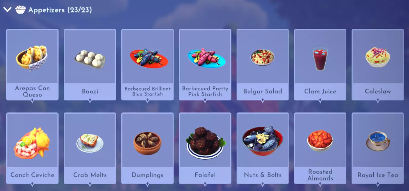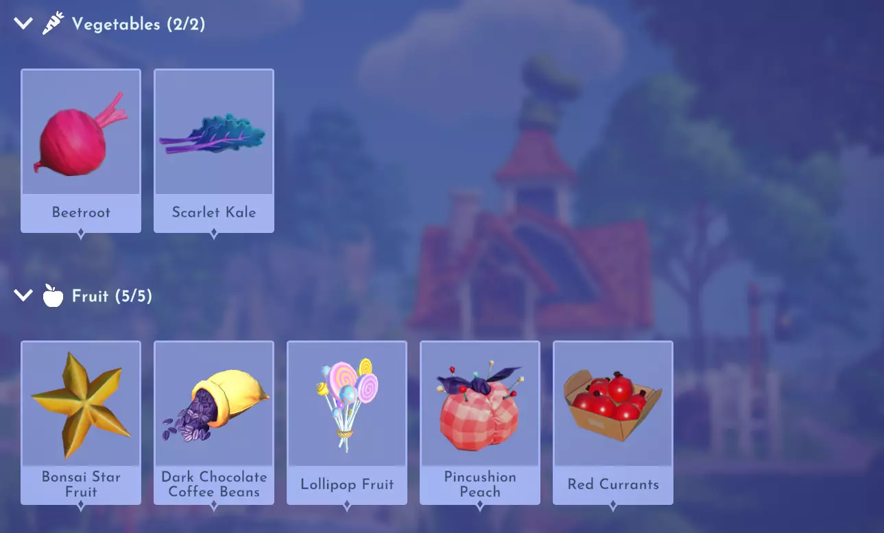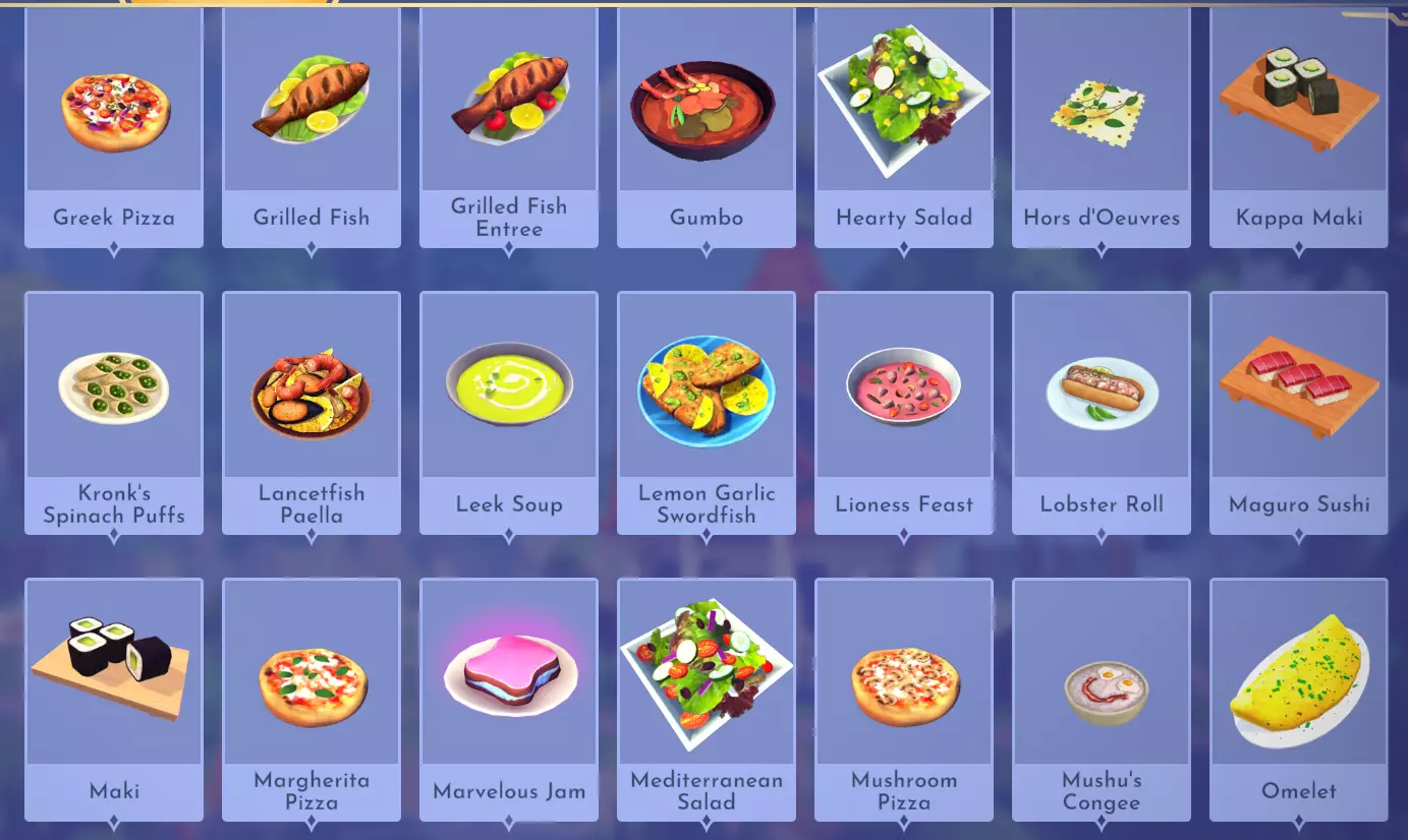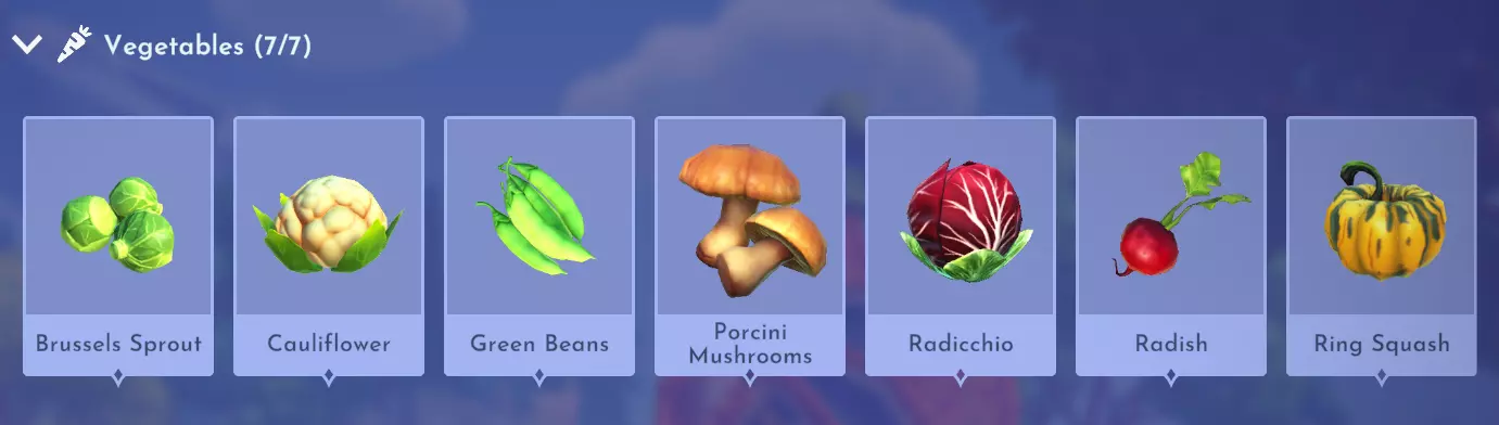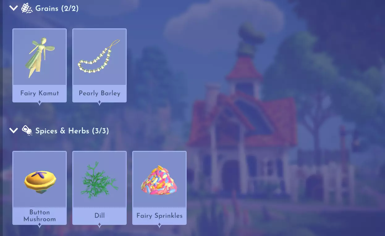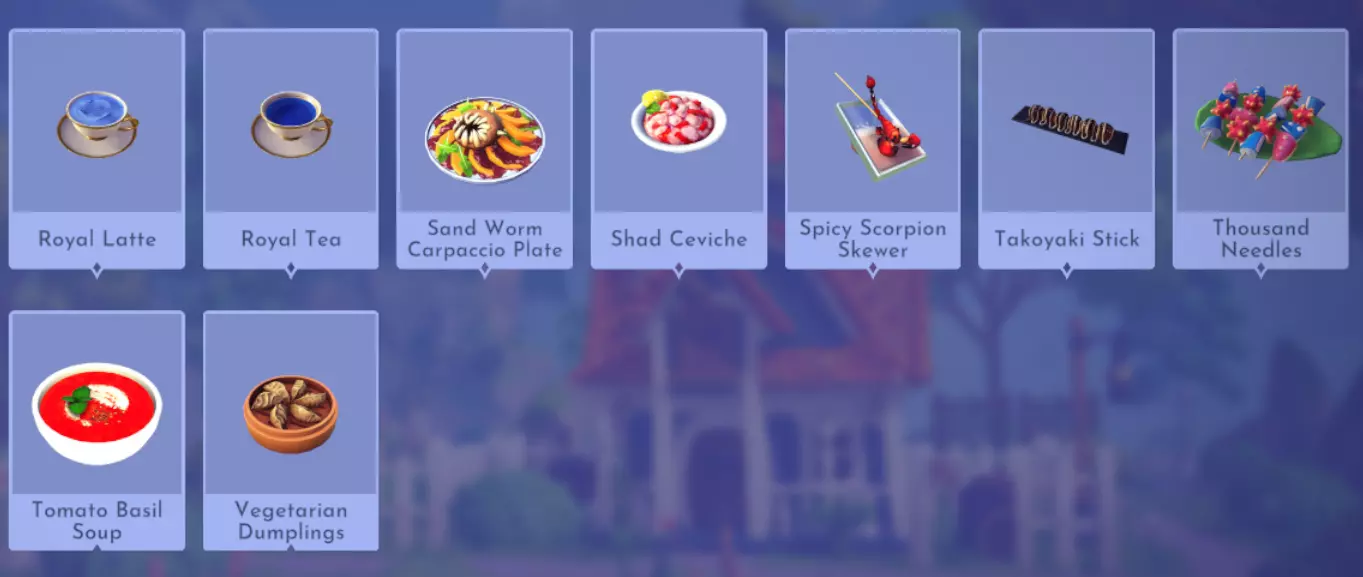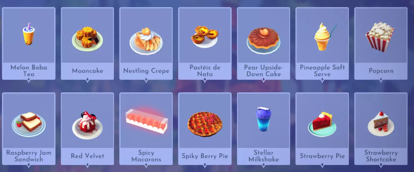 "My Hero" Cookie Sweet (ex. cocoa bean) + wheat + butter Apple Pie Apple + wheat + butter Apple Sorbet Apple + sugarcane + slush ice Aurora's Cake Wheat + egg + sugarcane + milk + fruit (ex. raspberry) Banana Ice Cream Banana + milk + sugarcane + slush ice Banana Pie Banana + wheat + butter Banana Split Banana + milk + sugarcane + slush ice + sweet (ex. sugarcane) Beignets Egg + wheat + canola + sugarcane Berry Salad Raspberry + gooseberry + blueberry Birthday Cake Egg + butter + sugarcane + wheat + cocoa bean Biscuits Sugarcane + wheat + butter Blueberry Pie Blueberry + wheat + butter Boba Tea Milk + sugarcane Candy Sweet (ex. sugarcane) Caramel Apples Apple + sugarcane Carrot Cake Carrot + sugarcane + wheat + egg Cheesecake Cheese + wheat + sugarcane + fruit (ex. raspberry) Cherry Pie Cherry + wheat + butter Cheshire Cat Tail Sugarcane + cocoa bean + egg + wheat Chocolate Chip Cookie Cocoa bean + butter + wheat + sugarcane Chocolate Ice Cream Milk + slush ice + sugarcane + cocoa bean Chocolate Waffles Cocoa bean + milk + wheat + egg Coconut Boba Tea Coconut + milk + sugarcane Coconut Cake Coconut + sugarcane + wheat + egg Coconut Ice Cream Coconut + milk + sugarcane + slush ice Crepe Milk + vanilla + wheat + egg Dream Ice Cream Dreamlight fruit + slush ice + milk Festive Blueberry Hot Cocoa Milk + sugarcane + festive cocoa bean + blueberry Festive Cherry Hot Cocoa Milk + sugarcane + festive cocoa bean + cherry Festive Mint Hot Cocoa Milk + sugarcane + festive cocoa bean + mint Fruit Salad Fruit (ex. raspberry) Fruit Sorbet Fruit (ex. raspberry) + slush ice Fruit Cake Fruit (ex. raspberry) + fruit (ex. raspberry) + fruit (ex. raspberry) + wheat Garlic Chocolate Tart Garlic + cocoa bean + egg + wheat + cheese Gingerbread House Ginger + egg + vanilla + sugarcane + wheat Gooseberry Boba Tea Gooseberry + milk + sugarcane Gray Stuff Sugarcane + cocoa bean + dairy (ex. butter) Halloween Gingerbread Cookies Pumpkin + wheat + ginger Hot Cocoa Sugarcane + cocoa bean + milk Ice Cream Milk + slush ice + sugarcane Jam Waffles Fruit (ex. raspberry) + wheat + egg + milk Joyful Meal Banana + blueberry + raspberry + wheat Lemon Sorbet Lemon + slush ice Meringue Pie Lemon + wheat + egg + butter Mermaid Cupcake Butter + milk + wheat + sugarcane + scallop Minnie Cupcake Butter + milk + wheat + sugarcane + apple Minnie's Gingerbread Cookies Ginger + wheat Mint Boba Tea Mint + milk + sugarcane Mint Candy Mint + sugarcane Mint Chocolate Mint + cocoa bean + butter + sugarcane Mint Sorbet Mint + slush ice Pastry Cream and Fruits Sugarcane + fruit (ex. raspberry) + fruit (ex. raspberry) + fruit (ex. raspberry) + milk Pawpsicle Fruit (ex. raspberry) + slush ice + sugarcane Peanut Butter Waffles Peanut + egg + wheat + milk Plain Snow Cones Slush ice Princess Aurora Raspberry Cupcake Butter + milk + wheat + sugarcane + raspberry Raspberry Boba Tea Raspberry + milk + sugarcane Red Fruit Pie Fruit (ex. raspberry) + wheat + butter Red Fruit Sorbert Raspberry + gooseberry + slush ice + sugarcane Roasted Marshmallows Pink marshmallow + pink marshmallow + blue marshmallow + blue marshmallow Root Beer Ginger + sugarcane + vanilla Shake Dairy (ex. milk) S'mores Pink marshmallow + blue marshmallow + wheat + wheat Snow White's Gooseberry Pie Gooseberry + wheat + butter Sour Snow Cones Lemon + slush ice + sugarcane Spaceship Earth Cupcake Butter + milk + wheat + sugarcane + coconut Spring Chocolate Sugarcane + cocoa bean + spring V-EGG-etable Spring Egg Bowl Sugarcane + cocoa bean + spring V-EGG-etable + egg-cellent fruit + wild spring egg Spring Mimosa Eggs Basil + spring V-EGG-etable + egg-cellent fruit + wild spring egg Stitch Cupcake Butter + milk + wheat + sugarcane + blueberry Sweet Slush Sweet (ex. sugarcane) + slush ice Tropical Pop Fruit (ex. raspberry) + coconut + sugarcane + slush ice Vanilla Ice Cream Vanilla + milk + sugarcane + slush ice Waffles Sweet (ex. sugarcane) + egg + wheat + milk Wedding Cake Vanilla + sugarcane + butter + wheat + egg Whimsical Pie Dreamlight fruit + wheat + butter Wonderland Cookies Vanilla + sugarcane + butter + wheat Yule Log Cocoa bean + cherry + vanilla + wheat Ingredients (A Rift in Time DLC) Vegetables
