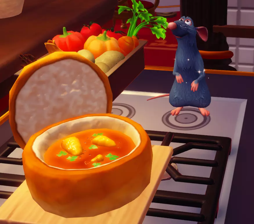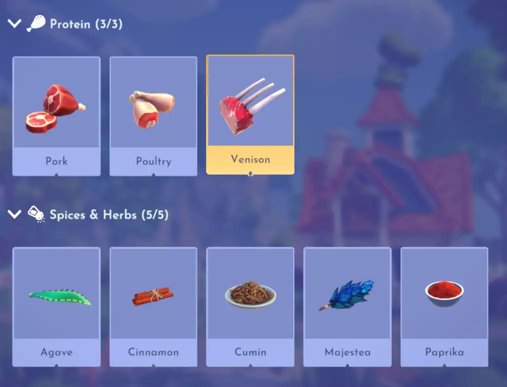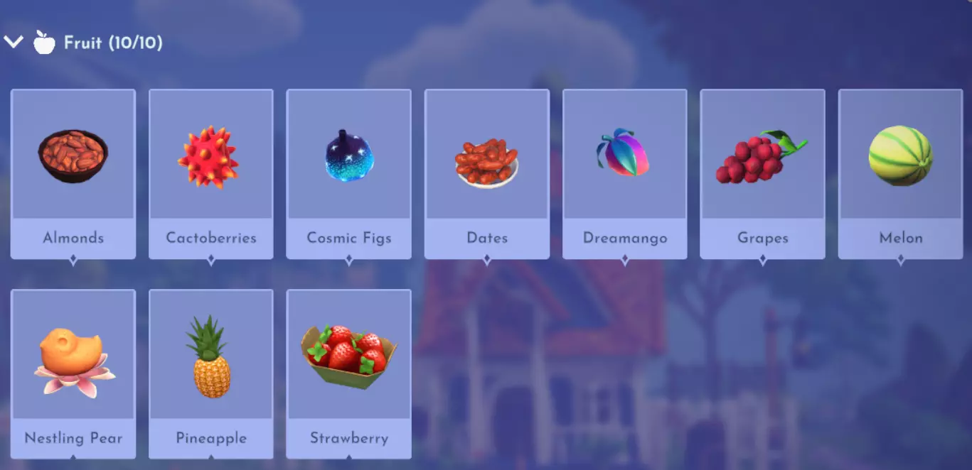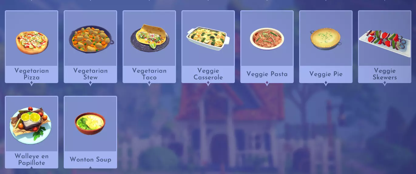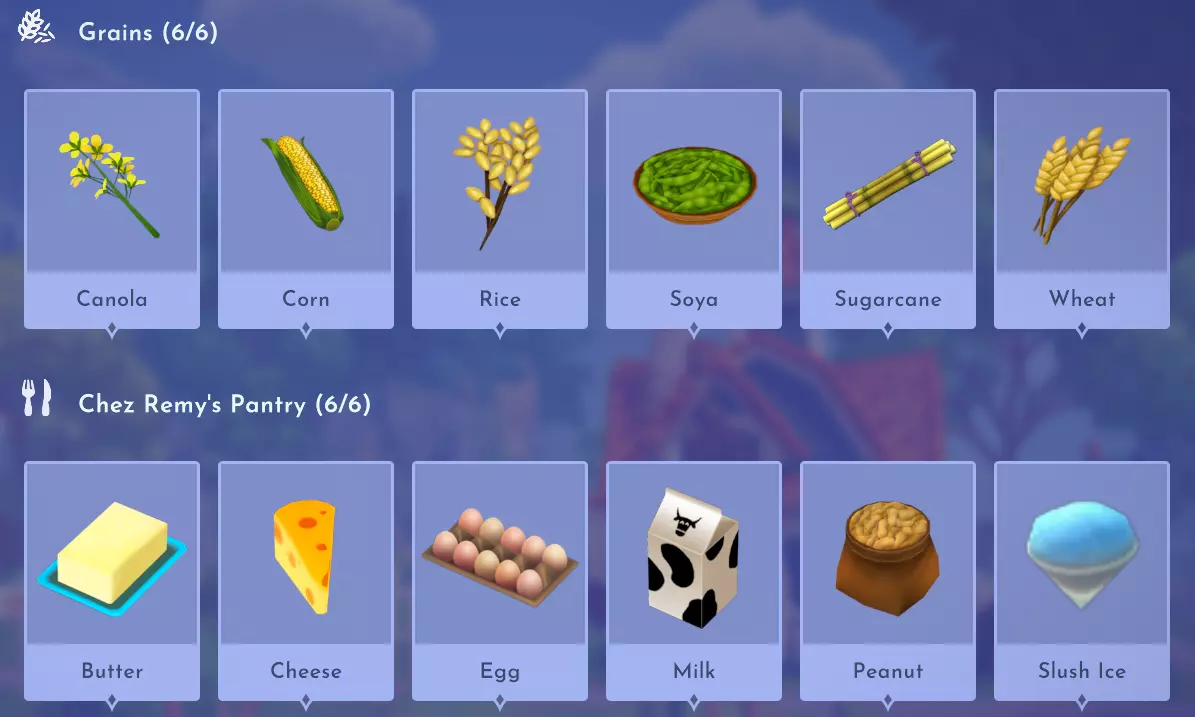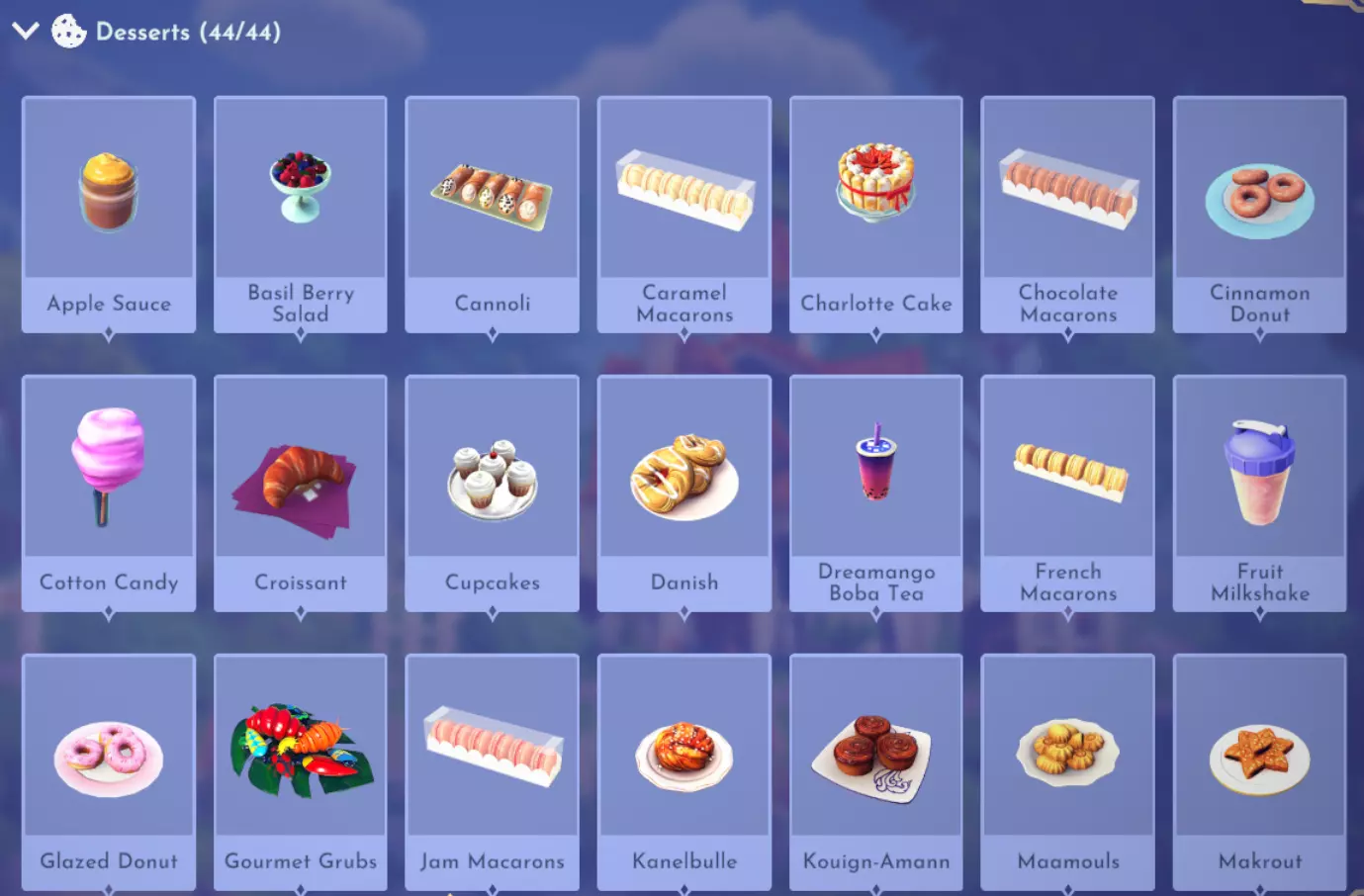 "My Hero" Cookie Sweet (ex. cocoa bean) + wheat + butter Apple Pie Apple + wheat + butter Apple Sorbet Apple + sugarcane + slush ice Aurora's Cake Wheat + egg + sugarcane + milk + fruit (ex. raspberry) Banana Ice Cream Banana + milk + sugarcane + slush ice Banana Pie Banana + wheat + butter Banana Split Banana + milk + sugarcane + slush ice + sweet (ex. sugarcane) Beignets Egg + wheat + canola + sugarcane Berry Salad Raspberry + gooseberry + blueberry Birthday Cake Egg + butter + sugarcane + wheat + cocoa bean Biscuits Sugarcane + wheat + butter Blueberry Pie Blueberry + wheat + butter Boba Tea Milk + sugarcane Candy Sweet (ex. sugarcane) Caramel Apples Apple + sugarcane Carrot Cake Carrot + sugarcane + wheat + egg Cheesecake Cheese + wheat + sugarcane + fruit (ex. raspberry) Cherry Pie Cherry + wheat + butter Cheshire Cat Tail Sugarcane + cocoa bean + egg + wheat Chocolate Chip Cookie Cocoa bean + butter + wheat + sugarcane Chocolate Ice Cream Milk + slush ice + sugarcane + cocoa bean Chocolate Waffles Cocoa bean + milk + wheat + egg Coconut Boba Tea Coconut + milk + sugarcane Coconut Cake Coconut + sugarcane + wheat + egg Coconut Ice Cream Coconut + milk + sugarcane + slush ice Crepe Milk + vanilla + wheat + egg Dream Ice Cream Dreamlight fruit + slush ice + milk Festive Blueberry Hot Cocoa Milk + sugarcane + festive cocoa bean + blueberry Festive Cherry Hot Cocoa Milk + sugarcane + festive cocoa bean + cherry Festive Mint Hot Cocoa Milk + sugarcane + festive cocoa bean + mint Fruit Salad Fruit (ex. raspberry) Fruit Sorbet Fruit (ex. raspberry) + slush ice Fruit Cake Fruit (ex. raspberry) + fruit (ex. raspberry) + fruit (ex. raspberry) + wheat Garlic Chocolate Tart Garlic + cocoa bean + egg + wheat + cheese Gingerbread House Ginger + egg + vanilla + sugarcane + wheat Gooseberry Boba Tea Gooseberry + milk + sugarcane Gray Stuff Sugarcane + cocoa bean + dairy (ex. butter) Halloween Gingerbread Cookies Pumpkin + wheat + ginger Hot Cocoa Sugarcane + cocoa bean + milk Ice Cream Milk + slush ice + sugarcane Jam Waffles Fruit (ex. raspberry) + wheat + egg + milk Joyful Meal Banana + blueberry + raspberry + wheat Lemon Sorbet Lemon + slush ice Meringue Pie Lemon + wheat + egg + butter Mermaid Cupcake Butter + milk + wheat + sugarcane + scallop Minnie Cupcake Butter + milk + wheat + sugarcane + apple Minnie's Gingerbread Cookies Ginger + wheat Mint Boba Tea Mint + milk + sugarcane Mint Candy Mint + sugarcane Mint Chocolate Mint + cocoa bean + butter + sugarcane Mint Sorbet Mint + slush ice Pastry Cream and Fruits Sugarcane + fruit (ex. raspberry) + fruit (ex. raspberry) + fruit (ex. raspberry) + milk Pawpsicle Fruit (ex. raspberry) + slush ice + sugarcane Peanut Butter Waffles Peanut + egg + wheat + milk Plain Snow Cones Slush ice Princess Aurora Raspberry Cupcake Butter + milk + wheat + sugarcane + raspberry Raspberry Boba Tea Raspberry + milk + sugarcane Red Fruit Pie Fruit (ex. raspberry) + wheat + butter Red Fruit Sorbert Raspberry + gooseberry + slush ice + sugarcane Roasted Marshmallows Pink marshmallow + pink marshmallow + blue marshmallow + blue marshmallow Root Beer Ginger + sugarcane + vanilla Shake Dairy (ex. milk) S'mores Pink marshmallow + blue marshmallow + wheat + wheat Snow White's Gooseberry Pie Gooseberry + wheat + butter Sour Snow Cones Lemon + slush ice + sugarcane Spaceship Earth Cupcake Butter + milk + wheat + sugarcane + coconut Spring Chocolate Sugarcane + cocoa bean + spring V-EGG-etable Spring Egg Bowl Sugarcane + cocoa bean + spring V-EGG-etable + egg-cellent fruit + wild spring egg Spring Mimosa Eggs Basil + spring V-EGG-etable + egg-cellent fruit + wild spring egg Stitch Cupcake Butter + milk + wheat + sugarcane + blueberry Sweet Slush Sweet (ex. sugarcane) + slush ice Tropical Pop Fruit (ex. raspberry) + coconut + sugarcane + slush ice Vanilla Ice Cream Vanilla + milk + sugarcane + slush ice Waffles Sweet (ex. sugarcane) + egg + wheat + milk Wedding Cake Vanilla + sugarcane + butter + wheat + egg Whimsical Pie Dreamlight fruit + wheat + butter Wonderland Cookies Vanilla + sugarcane + butter + wheat Yule Log Cocoa bean + cherry + vanilla + wheat Ingredients (A Rift in Time DLC) Vegetables