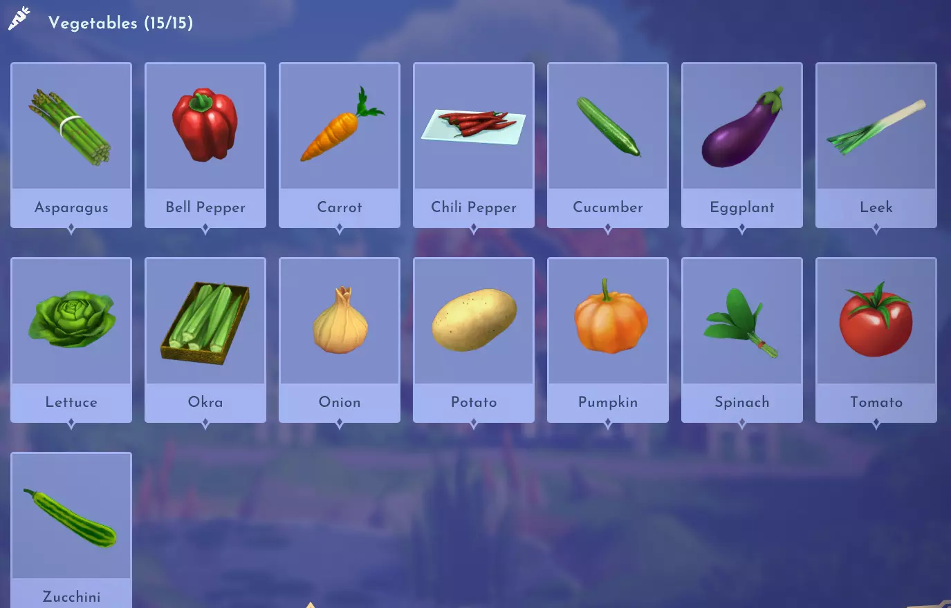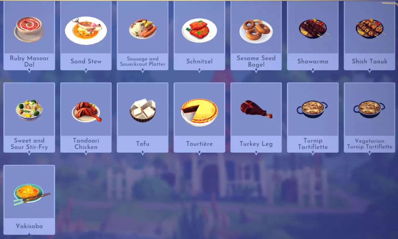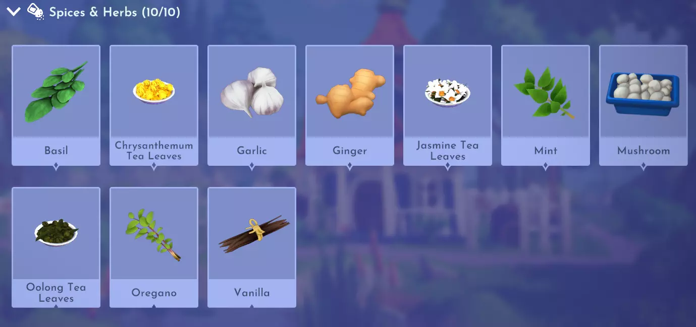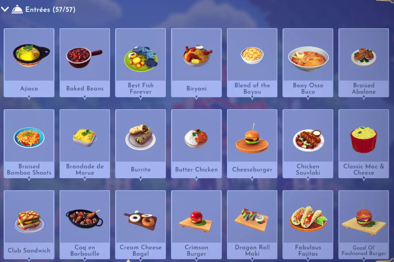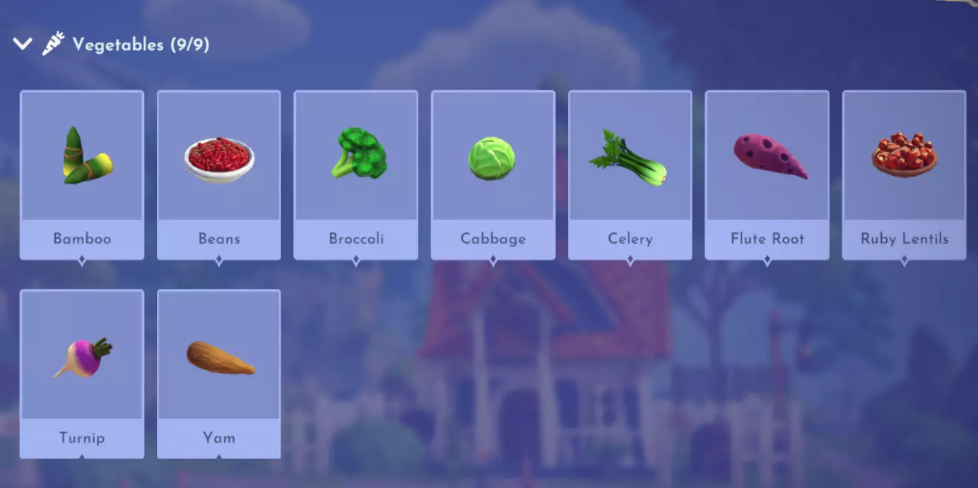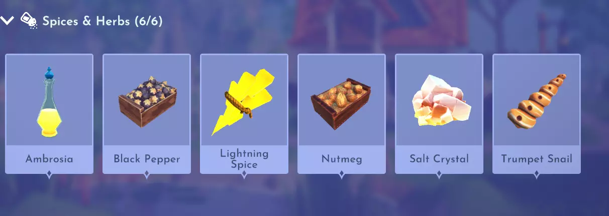 "My Hero" Cookie Sweet (ex. cocoa bean) + wheat + butter Apple Pie Apple + wheat + butter Apple Sorbet Apple + sugarcane + slush ice Aurora's Cake Wheat + egg + sugarcane + milk + fruit (ex. raspberry) Banana Ice Cream Banana + milk + sugarcane + slush ice Banana Pie Banana + wheat + butter Banana Split Banana + milk + sugarcane + slush ice + sweet (ex. sugarcane) Beignets Egg + wheat + canola + sugarcane Berry Salad Raspberry + gooseberry + blueberry Birthday Cake Egg + butter + sugarcane + wheat + cocoa bean Biscuits Sugarcane + wheat + butter Blueberry Pie Blueberry + wheat + butter Boba Tea Milk + sugarcane Candy Sweet (ex. sugarcane) Caramel Apples Apple + sugarcane Carrot Cake Carrot + sugarcane + wheat + egg Cheesecake Cheese + wheat + sugarcane + fruit (ex. raspberry) Cherry Pie Cherry + wheat + butter Cheshire Cat Tail Sugarcane + cocoa bean + egg + wheat Chocolate Chip Cookie Cocoa bean + butter + wheat + sugarcane Chocolate Ice Cream Milk + slush ice + sugarcane + cocoa bean Chocolate Waffles Cocoa bean + milk + wheat + egg Coconut Boba Tea Coconut + milk + sugarcane Coconut Cake Coconut + sugarcane + wheat + egg Coconut Ice Cream Coconut + milk + sugarcane + slush ice Crepe Milk + vanilla + wheat + egg Dream Ice Cream Dreamlight fruit + slush ice + milk Festive Blueberry Hot Cocoa Milk + sugarcane + festive cocoa bean + blueberry Festive Cherry Hot Cocoa Milk + sugarcane + festive cocoa bean + cherry Festive Mint Hot Cocoa Milk + sugarcane + festive cocoa bean + mint Fruit Salad Fruit (ex. raspberry) Fruit Sorbet Fruit (ex. raspberry) + slush ice Fruit Cake Fruit (ex. raspberry) + fruit (ex. raspberry) + fruit (ex. raspberry) + wheat Garlic Chocolate Tart Garlic + cocoa bean + egg + wheat + cheese Gingerbread House Ginger + egg + vanilla + sugarcane + wheat Gooseberry Boba Tea Gooseberry + milk + sugarcane Gray Stuff Sugarcane + cocoa bean + dairy (ex. butter) Halloween Gingerbread Cookies Pumpkin + wheat + ginger Hot Cocoa Sugarcane + cocoa bean + milk Ice Cream Milk + slush ice + sugarcane Jam Waffles Fruit (ex. raspberry) + wheat + egg + milk Joyful Meal Banana + blueberry + raspberry + wheat Lemon Sorbet Lemon + slush ice Meringue Pie Lemon + wheat + egg + butter Mermaid Cupcake Butter + milk + wheat + sugarcane + scallop Minnie Cupcake Butter + milk + wheat + sugarcane + apple Minnie's Gingerbread Cookies Ginger + wheat Mint Boba Tea Mint + milk + sugarcane Mint Candy Mint + sugarcane Mint Chocolate Mint + cocoa bean + butter + sugarcane Mint Sorbet Mint + slush ice Pastry Cream and Fruits Sugarcane + fruit (ex. raspberry) + fruit (ex. raspberry) + fruit (ex. raspberry) + milk Pawpsicle Fruit (ex. raspberry) + slush ice + sugarcane Peanut Butter Waffles Peanut + egg + wheat + milk Plain Snow Cones Slush ice Princess Aurora Raspberry Cupcake Butter + milk + wheat + sugarcane + raspberry Raspberry Boba Tea Raspberry + milk + sugarcane Red Fruit Pie Fruit (ex. raspberry) + wheat + butter Red Fruit Sorbert Raspberry + gooseberry + slush ice + sugarcane Roasted Marshmallows Pink marshmallow + pink marshmallow + blue marshmallow + blue marshmallow Root Beer Ginger + sugarcane + vanilla Shake Dairy (ex. milk) S'mores Pink marshmallow + blue marshmallow + wheat + wheat Snow White's Gooseberry Pie Gooseberry + wheat + butter Sour Snow Cones Lemon + slush ice + sugarcane Spaceship Earth Cupcake Butter + milk + wheat + sugarcane + coconut Spring Chocolate Sugarcane + cocoa bean + spring V-EGG-etable Spring Egg Bowl Sugarcane + cocoa bean + spring V-EGG-etable + egg-cellent fruit + wild spring egg Spring Mimosa Eggs Basil + spring V-EGG-etable + egg-cellent fruit + wild spring egg Stitch Cupcake Butter + milk + wheat + sugarcane + blueberry Sweet Slush Sweet (ex. sugarcane) + slush ice Tropical Pop Fruit (ex. raspberry) + coconut + sugarcane + slush ice Vanilla Ice Cream Vanilla + milk + sugarcane + slush ice Waffles Sweet (ex. sugarcane) + egg + wheat + milk Wedding Cake Vanilla + sugarcane + butter + wheat + egg Whimsical Pie Dreamlight fruit + wheat + butter Wonderland Cookies Vanilla + sugarcane + butter + wheat Yule Log Cocoa bean + cherry + vanilla + wheat Ingredients (A Rift in Time DLC) Vegetables