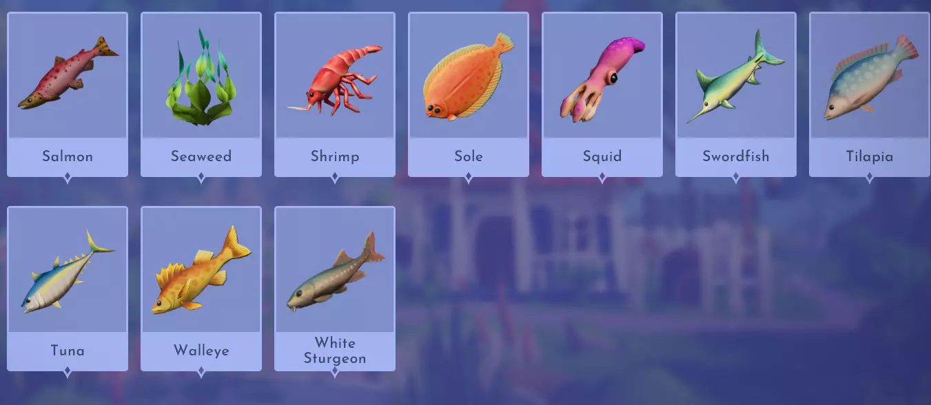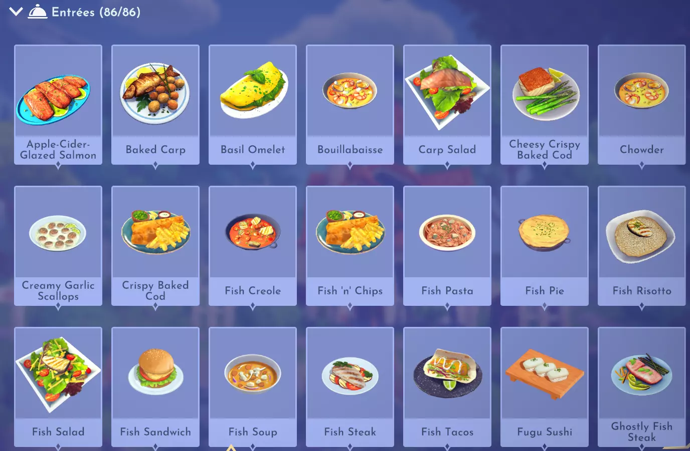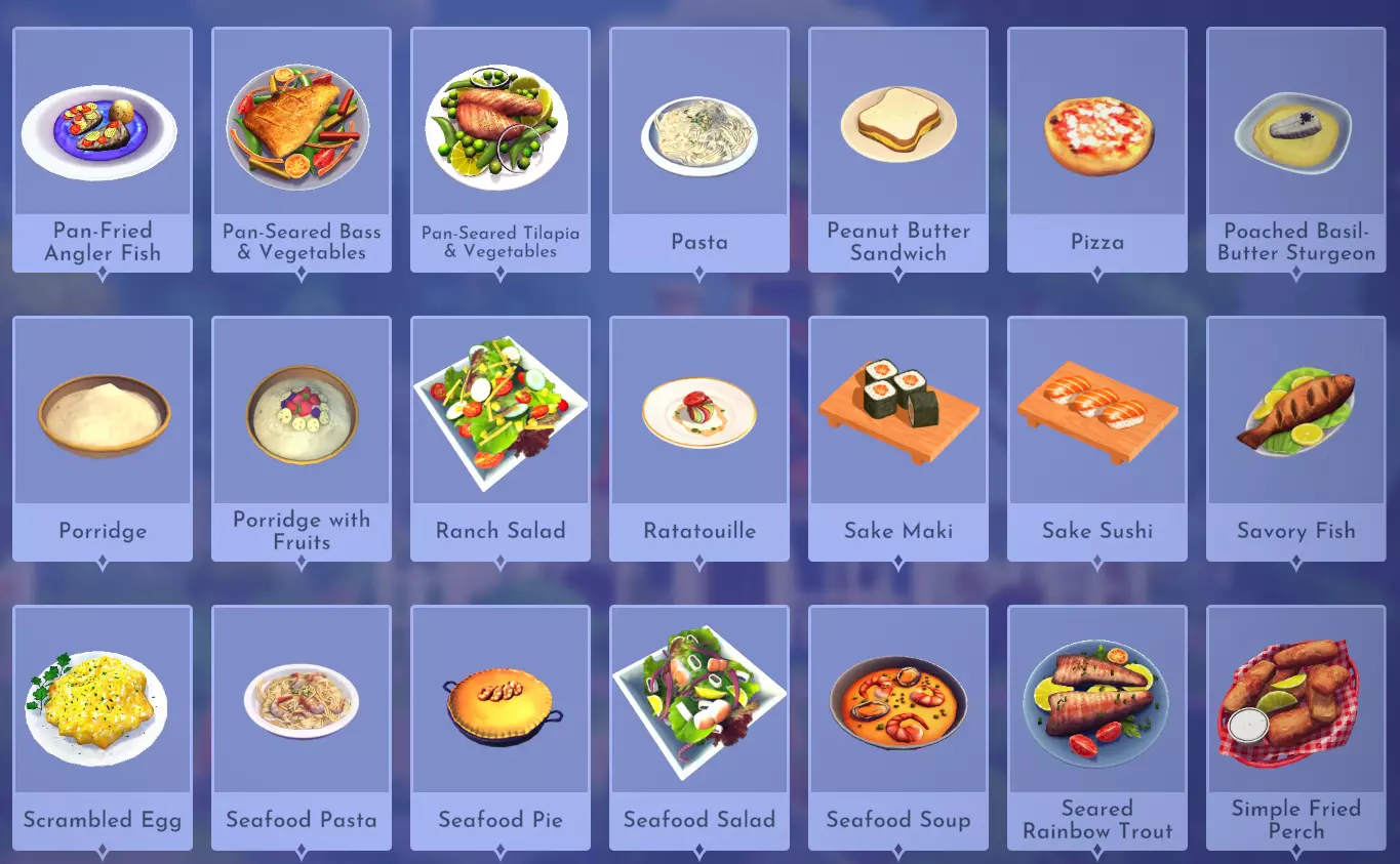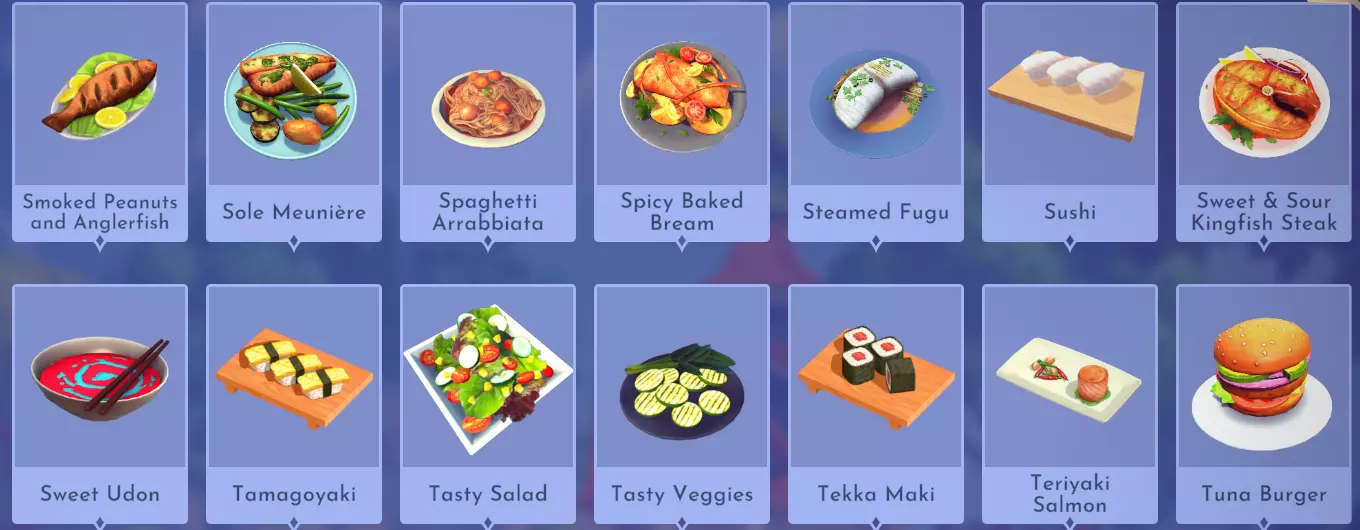 苹果酒釉烤三文鱼 苹果+三文鱼+甘蔗 烤鲤鱼 鲤鱼+黄油 罗勒煎蛋卷 罗勒+鸡蛋+奶酪+牛奶 法式普罗旺斯鱼汤 海鲜(例如蛤蜊)+海鲜(例如蛤蜊)+蔬菜(例如胡萝卜)+虾+番茄 鲤鱼沙拉 鲤鱼+生菜+柠檬 芝士脆皮烤鳕鱼 鳕鱼+奶酪+小麦 杂烩浓汤 土豆+牛奶+蔬菜(例如生菜)+海鲜(例如蛤蜊) 奶油大蒜扇贝 扇贝+柠檬+黄油+大蒜 脆皮烤鳕鱼 鳕鱼+小麦 克里奥尔鱼 鱼(例如鲈鱼)+蔬菜(例如生菜)+番茄+大米+大蒜 炸鱼薯条 鱼(例如鲈鱼)+土豆+小麦+油菜籽 鱼肉意面 鱼(例如鲈鱼)+小麦+牛奶+大蒜 鱼肉派 鱼(例如鲈鱼)+小麦+黄油 鱼肉烩饭 鱼(例如鲈鱼)+大米+黄油 鱼肉沙拉 鱼(例如鲈鱼)+生菜+柠檬 鱼肉三明治 鱼(例如鲈鱼 + 小麦 鱼汤 鱼(例如鲈鱼)+ 蔬菜(例如生菜)+ 牛奶 鱼排 鱼(例如鲈鱼)+ 番茄 + 罗勒 鱼肉塔可 鱼(例如鲈鱼)+ 奶酪 + 玉米 + 辣椒 河豚寿司 河豚 + 米饭 + 海苔 幽灵鱼排 随处可见的鱼 + 甜椒 + 芦笋 + 柠檬 + 牛至 希腊披萨 小麦 + 奶酪 + 番茄 + 洋葱 + 香料(例如牛至) 烤鱼 鱼(例如鲈鱼) 烤鱼主菜 鱼(例如鲈鱼)+ 蔬菜(例如生菜) 秋葵汤 虾 + 番茄 + 洋葱 + 辣椒 + 秋葵 丰盛沙拉 蔬菜(例如生菜)+ 蔬菜(例如生菜)+ 生菜 开胃小菜 香料(例如牛至) 黄瓜细卷 米饭 + 海苔 + 黄瓜 克朗克菠菜泡芙 菠菜 + 奶酪 + 菜籽油 帆蜥鱼海鲜饭 帆蜥鱼 + 番茄 + 米饭 + 虾 + 海鲜(例如蛤蜊汤 韭菜汤 韭菜 柠檬大蒜箭鱼 柠檬+大蒜+箭鱼 母狮盛宴 蘑菇+番茄+牛至+少许鱼肉 龙虾卷 龙虾+小麦+柠檬+黄油+大蒜 金枪鱼寿司 金枪鱼+海苔+米饭+生姜 寿司卷 鱼肉(例如鲈鱼)+米饭+海苔 玛格丽特披萨 香料(例如牛至)+小麦+番茄+奶酪 奇妙果酱 梦之光水果+小麦 地中海沙拉 生菜+番茄+洋葱+黄瓜+香料(例如牛至) 蘑菇披萨 蘑菇+小麦+番茄+奶酪 木须粥 米饭+鸡蛋+蘑菇+大蒜+生姜 煎蛋卷 鸡蛋+牛奶+奶酪 香煎安康鱼 安康鱼+番茄+西葫芦+土豆 香煎鲈鱼配蔬菜 鲈鱼+蔬菜(例如生菜)+蔬菜(例如生菜) 香煎罗非鱼配蔬菜 罗非鱼+蔬菜(例如生菜)+蔬菜(例如生菜) 意大利面 小麦+番茄 花生酱三明治 小麦+花生 披萨 小麦+番茄+奶酪 罗勒黄油煮鲟鱼 白鲟+罗勒+黄油+柠檬 粥 小麦+牛奶 水果粥 小麦+牛奶+水果(例如覆盆子) 田园沙拉 生菜+玉米+番茄+甜椒+洋葱 普罗旺斯炖菜 番茄+洋葱+茄子+西葫芦+香料(例如牛至) 三文鱼卷 三文鱼+海苔+米饭 三文鱼寿司 三文鱼+米饭 香煎鱼 鱼(例如鲈鱼)+柠檬 芝士炒蛋 鸡蛋+奶酪 海鲜煮 海鲜(例如蛤蜊)+香料(例如牛至)+土豆+玉米 海鲜意面 海鲜(例如蛤蜊)+牛奶+小麦 海鲜派 海鲜(例如蛤蜊)+小麦+黄油 海鲜沙拉 海鲜(例如蛤蜊+生菜 海鲜汤 海鲜(例如蛤蜊)+蔬菜(例如生菜)+蔬菜(例如生菜) 香煎虹鳟鱼 虹鳟鱼+洋葱+番茄 简易香煎鲈鱼 鲈鱼+黄油+小麦 烟熏花生安康鱼 花生+安康鱼 柠檬黄油比目鱼 比目鱼+小麦+黄油+柠檬 辣味番茄意大利面 小麦+番茄+辣椒 香辣烤鲷鱼 鲷鱼+黄油+辣椒 清蒸河豚 河豚+大蒜+生姜 寿司 鱼类(例如鲈鱼)+米饭 糖醋无鳔石首鱼排 无鳔石首鱼+柠檬+甘蔗 甜味乌冬面 梦之光水果+米饭+甜味食材(例如甘蔗)+海鲜(例如蛤蜊) 玉子烧 鸡蛋+甘蔗 美味沙拉 生菜+黄瓜+蔬菜(例如生菜)+香料(例如牛至) 美味蔬菜 蔬菜(例如生菜)+香料(例如oregano) 金枪鱼寿司卷 金枪鱼+海草+米饭+酱油 照烧三文鱼 三文鱼+米饭+生姜+酱油+甘蔗 金枪鱼汉堡 金枪鱼+小麦+洋葱+柠檬+蔬菜(例如生菜) 素食炖菜 土豆+洋葱+胡萝卜 素食塔可 玉米+奶酪+辣椒+蔬菜(例如生菜) 蔬菜砂锅 奶酪+香料(例如牛至)+蔬菜(例如生菜)+蔬菜(例如生菜) 蔬菜意面 蔬菜(例如生菜)+番茄+小麦 蔬菜派 蔬菜(例如生菜)+小麦+黄油 蔬菜串烧 蘑菇+甜椒+西葫芦+洋葱 纸包白斑狗鱼 白斑狗鱼+罗勒+牛至+蔬菜(例如生菜) 馄饨汤 鸡蛋+虾+小麦+洋葱 甜点
