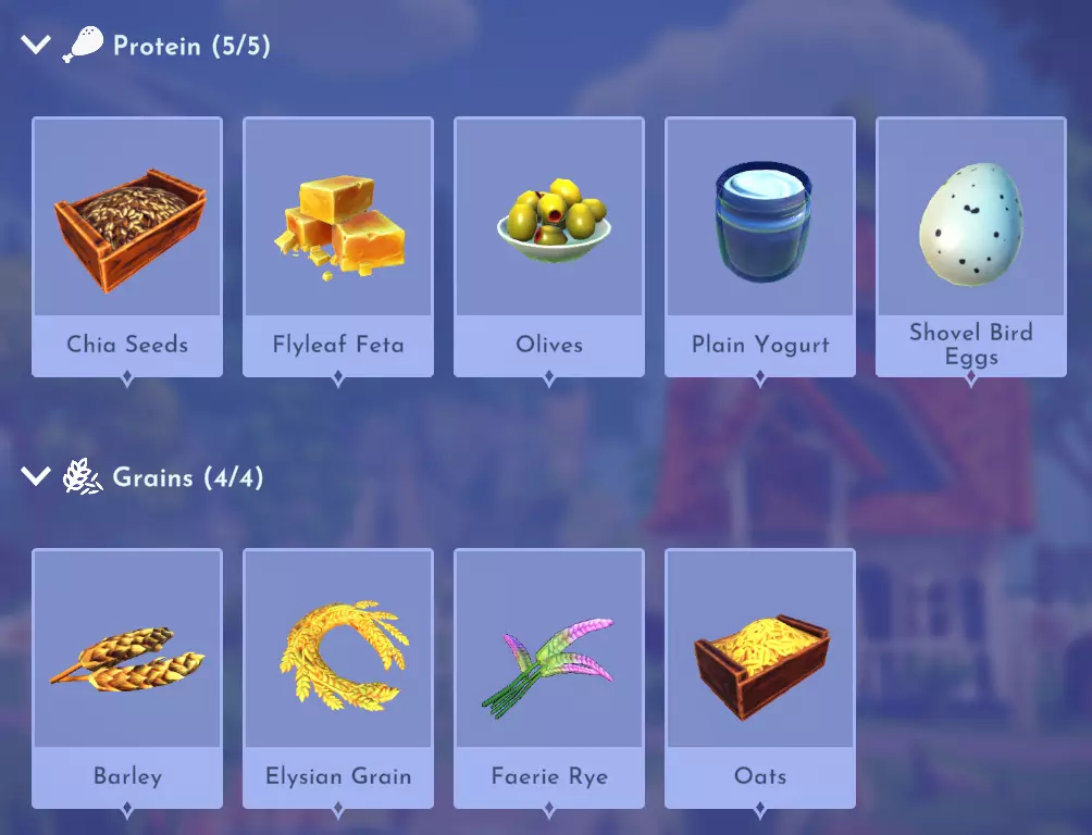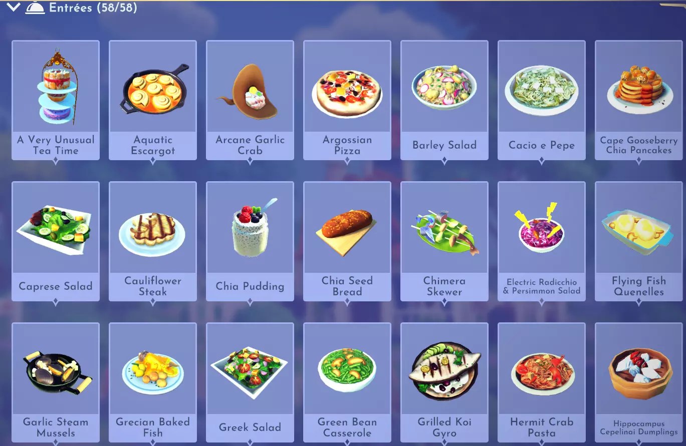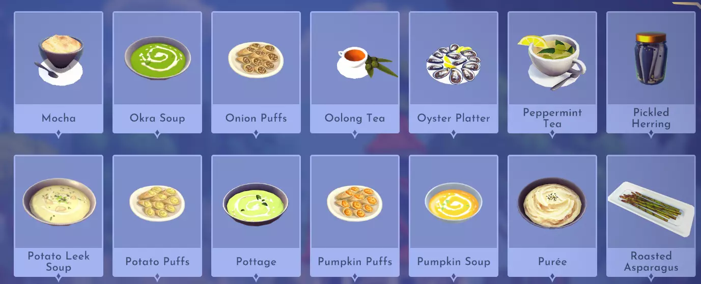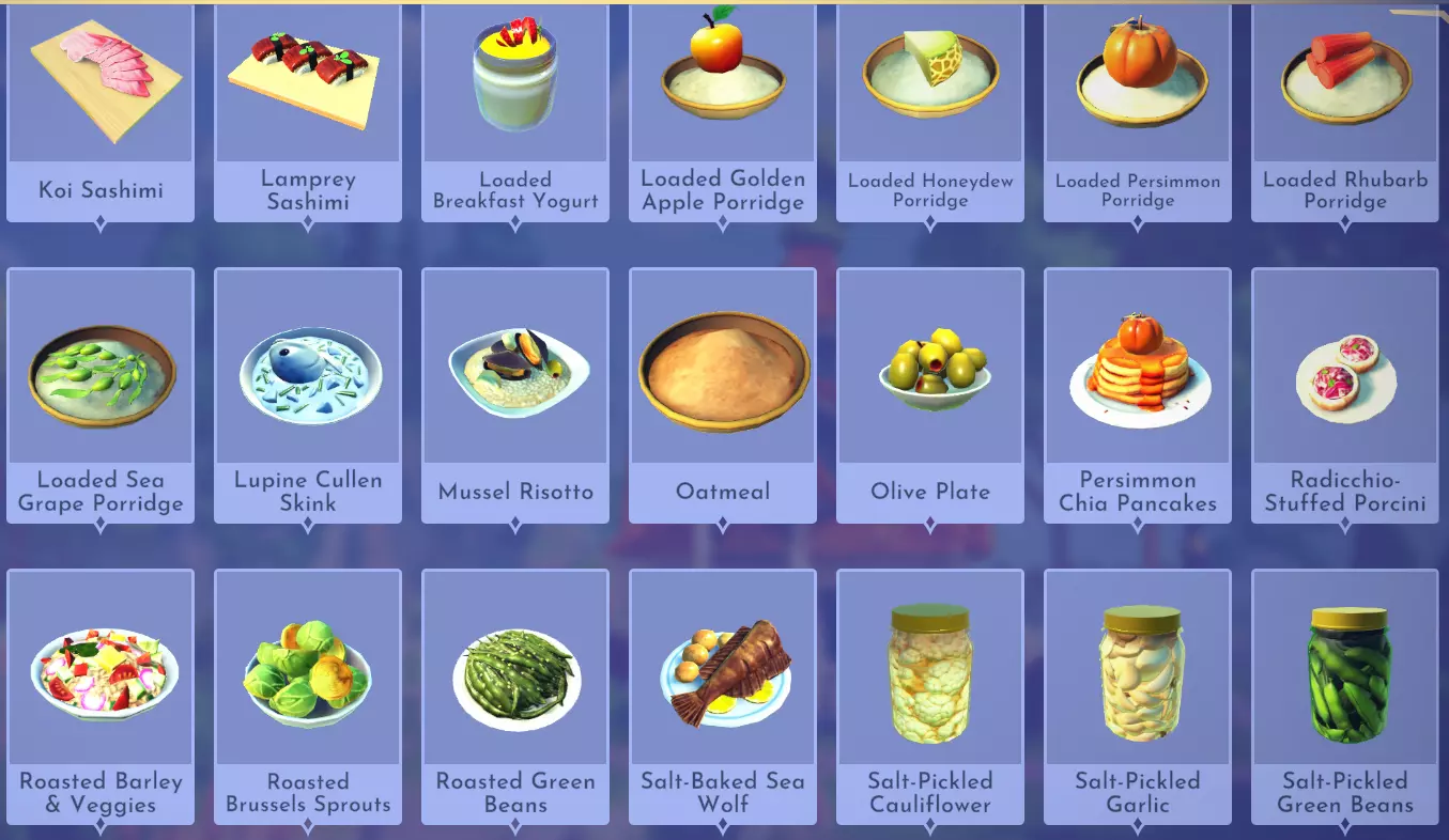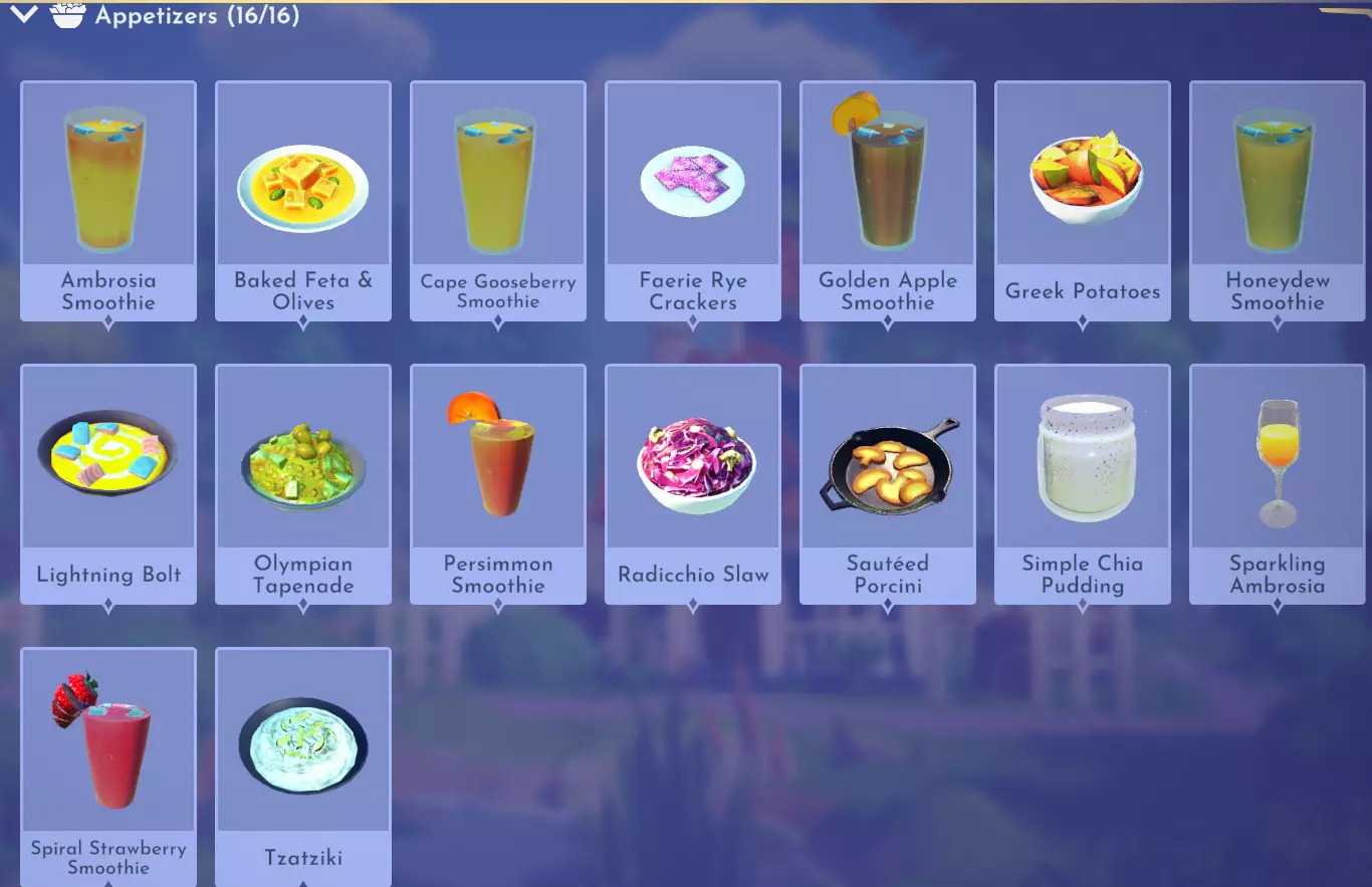 仙馔蜜酒冰沙 仙馔蜜酒+原味酸奶 烤菲达奶酪配橄榄 橄榄+书页菲达奶酪 灯笼果冰沙 灯笼果+原味酸奶 精灵黑麦脆饼 精灵黑麦 金苹果冰沙 金苹果+原味酸奶 希腊风味土豆 土豆+大蒜+盐晶+水果(例如柠檬)+香料(例如牛至) 哈密瓜冰沙 哈密瓜+原味酸奶 闪电冲击 冥河弹涂鱼+七鳃鳗+闪电香料+闪电香料+甜味食材(例如甘蔗) 奥林匹斯橄榄酱 极乐谷物+橄榄+哈密瓜+香料(例如牛至) 柿子冰沙 柿子+原味酸奶 红菊苣沙拉 红菊苣+青豆+花椰菜+萝卜 炒牛肝菌 牛肝菌+大蒜 简易奇亚籽布丁 奇亚籽 闪耀仙馔 仙馔+闪电香料 螺旋草莓冰沙 螺旋草莓+原味酸奶 黄瓜酸奶酱 黄瓜+原味酸奶+大蒜 主菜(故事书谷DLC)