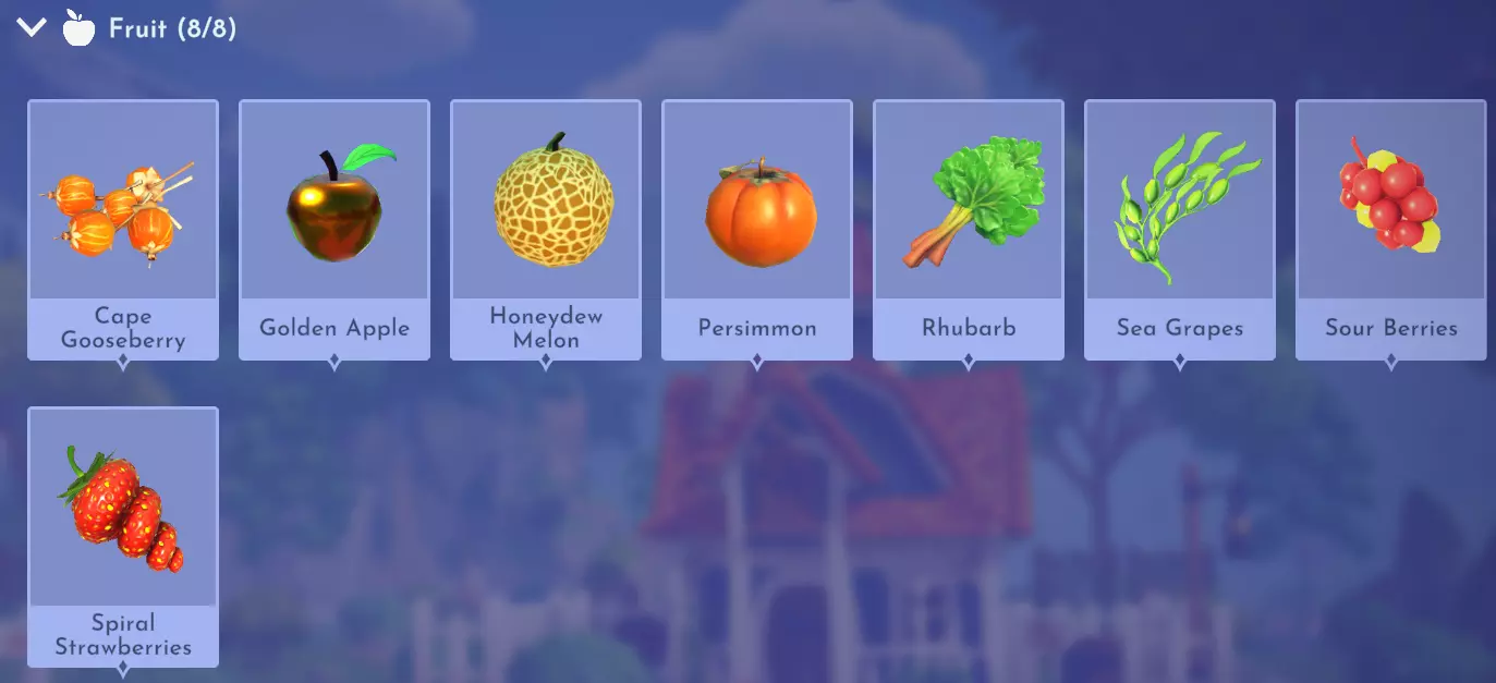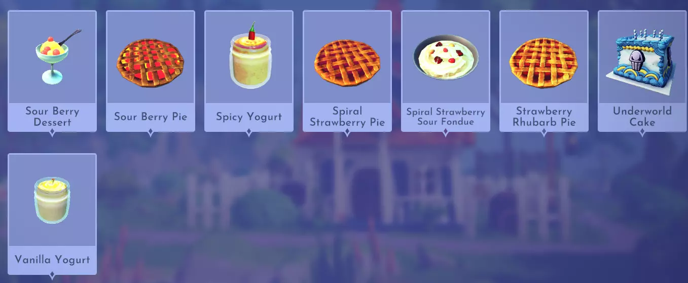 阿佛洛狄忒的喜悦 金苹果+仙馔密酒 灯笼果酸味火锅 灯笼果+酸味浆果 肉桂蛋糕 肉桂+原味酸奶+铲鸟蛋+小麦 肉桂饼干 肉桂+原味酸奶+小麦+甜味食材(例如甘蔗) 金苹果派 金苹果+小麦+铲鸟蛋 哈密瓜酸味火锅 哈密瓜+酸味浆果 闪电蛋糕 闪电香料+小麦+原味酸奶+铲鸟蛋 闪电饼干 闪电香料+小麦+原味酸奶+甜味食材(例如甘蔗) 梅里韦瑟姜饼 仙子黑麦+铲鸟蛋+生姜+肉豆蔻+酸味浆果 肉豆蔻蛋糕 肉豆蔻+小麦+原味酸奶+铲鸟蛋 肉豆蔻饼干 肉豆蔻+小麦+原味酸奶+甜味食材(例如甘蔗 柿子派 柿子+小麦+铲鸟蛋 柿子酸芝士火锅 柿子+酸浆果 米布丁 大米+燕麦+香草 酸浆果甜点 酸浆果+仙馔密酒 酸浆果派 酸浆果+小麦+铲鸟蛋 辣味酸奶 原味酸奶+香料(例如牛至) 螺旋草莓派 螺旋草莓+小麦+铲鸟蛋 螺旋草莓酸芝士火锅 螺旋草莓+酸浆果 草莓大黄派 大黄+螺旋草莓+原味酸奶+小麦 非生日蛋糕 精灵黑麦+铲鸟蛋+原味酸奶+肉豆蔻+仙馔密酒 香草酸奶 原味酸奶+香草 食材(许愿花牧场DLC) 蔬菜和水果