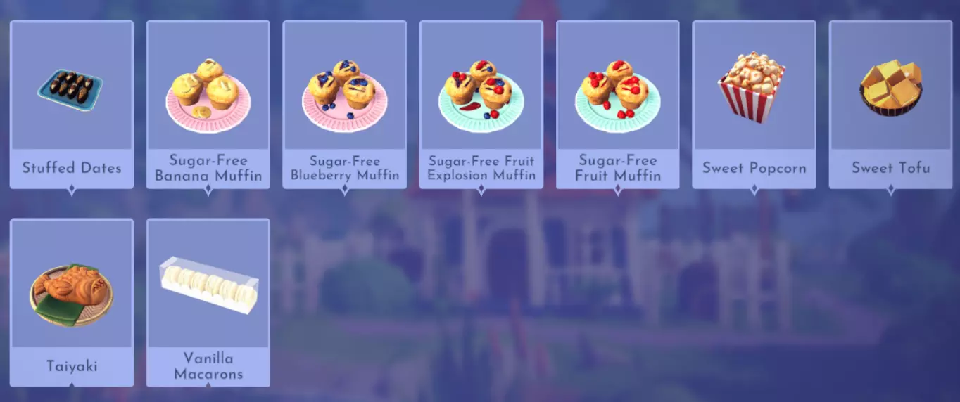苹果酱 苹果+肉桂 罗勒浆果沙拉 蓝莓+草莓+罗勒 奶油甜馅煎饼卷 小麦+奶酪+鸡蛋+香草 焦糖马卡龙 杏仁+鸡蛋+龙舌兰 夏洛特蛋糕 小麦+龙舌兰+草莓 巧克力马卡龙 杏仁+鸡蛋+可可豆 肉桂甜甜圈 小麦+鸡蛋+肉桂+甜味食材(例如甘蔗) 棉花糖 甘蔗+龙舌兰 牛角面包 小麦+黄油 纸杯蛋糕 小麦+鸡蛋+樱桃+龙舌兰 丹麦酥 小麦+黄油+水果(例如覆盆子)+水果(例如覆盆子) 梦幻芒果珍珠奶茶 梦幻芒果+甘蔗+牛奶 法式马卡龙 杏仁+鸡蛋 水果奶昔 冰沙+牛奶+水果(例如覆盆子) 糖霜甜甜圈 小麦+鸡蛋+甜味食材(例如甘蔗) 美味幼虫 海蜗牛+沙虫+蝎子 果酱马卡龙 杏仁+鸡蛋+水果(例如覆盆子 肉桂卷 小麦+鸡蛋+黄油+肉桂 布列塔尼黄油酥饼 小麦+黄油+黄油+龙舌兰 椰枣杏仁饼干 小麦+杏仁+椰枣 马库鲁特 小麦+菜籽油+肉桂+椰枣 甜瓜珍珠奶茶 牛奶+甜瓜+甘蔗 月饼 小麦+豆类+菜籽油+龙舌兰 雏梨可丽饼 小麦+鸡蛋+牛奶+雏梨 葡式蛋挞 玉米+鸡蛋+牛奶+香草 梨子翻转蛋糕 小麦+鸡蛋+雏梨 菠萝软冰淇淋 冰沙+菠萝 爆米花 玉米+菜籽油 覆盆子果酱三明治 小麦+覆盆子 红丝绒蛋糕 小麦+鸡蛋+奶酪+可可豆+香草 辣味马卡龙 杏仁+鸡蛋+辣椒 尖刺浆果派 小麦+仙人掌浆果+黄油+草莓+香料(例如牛至 星尘奶昔 碎冰 + 牛奶 + 宇宙无花果 草莓派 小麦 + 黄油 + 草莓 草莓酥饼 小麦 + 鸡蛋 + 草莓 酿枣 杏仁 + 枣 无糖香蕉松饼 小麦 + 香蕉 无糖蓝莓松饼 小麦 + 蓝莓 无糖水果盛宴松饼 小麦 + 水果(例如:覆盆子)+ 水果(例如:覆盆子)+ 龙舌兰糖浆 无糖水果松饼 小麦 + 水果(例如:苹果) 甜爆米花 玉米 + 菜籽油 + 龙舌兰糖浆 甜豆腐 大豆 + 水果(例如:覆盆子) 鲷鱼烧 沙鱼 + 豆类 香草马卡龙 杏仁 + 鸡蛋 + 香草 【食材(故事书谷DLC)】 蔬菜