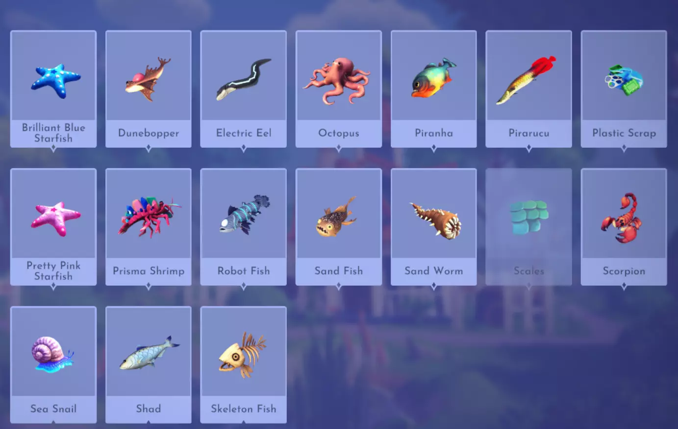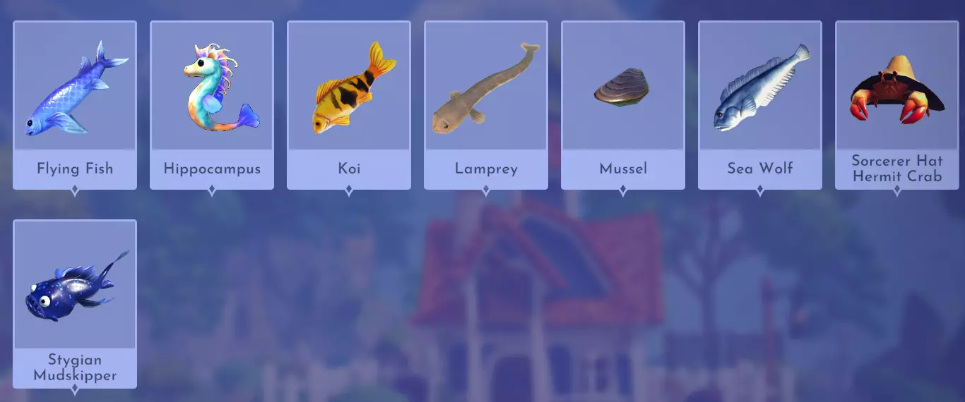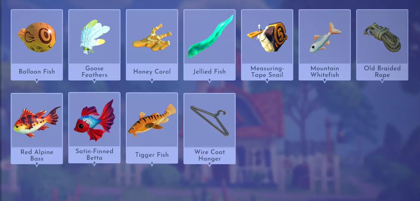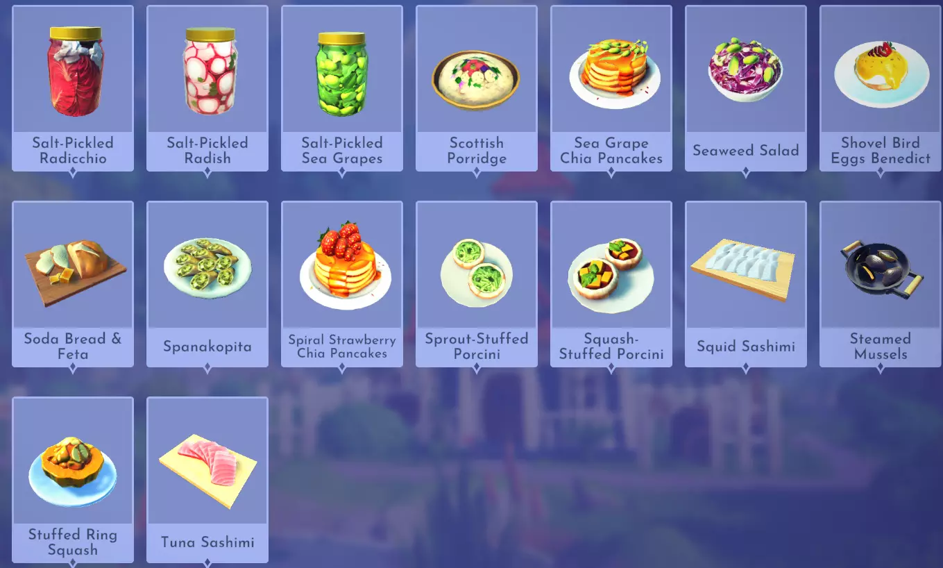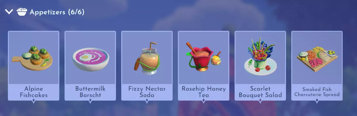 阿尔卑斯鱼糕 红阿尔卑斯鲈鱼+莳萝 奶油甜菜汤 甜菜根+莳萝+牛奶+鸡蛋 气泡花蜜苏打 盆景杨桃+冰沙 玫瑰果蜂蜜茶 蜂蜜珊瑚 绯红花束沙拉 绯红羽衣甘蓝 烟熏鱼冷盘酱 山地白鲑+任意鱼类(例如虹鳟鱼)+小麦+金枪鱼 主菜(【心愿花牧场】DLC)