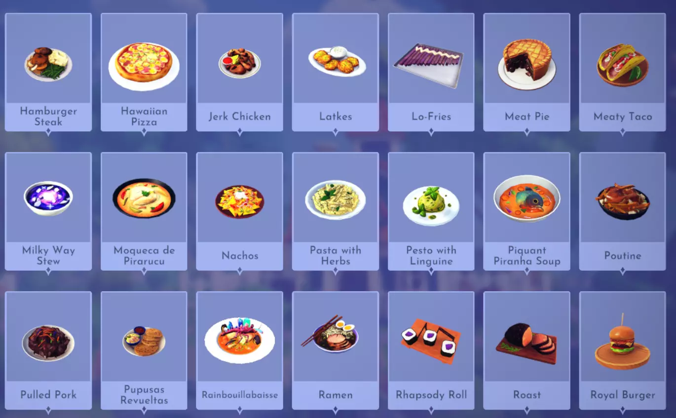 阿希亚科汤:土豆+玉米+禽肉 烤豆:豆子+猪肉 永恒最佳鱼:机械鱼+芹菜+孜然+海螺 印度香饭:禽肉+米饭+孜然+薄荷+肉桂 河口特调:米饭+芹菜+棱镜虾+黄油+香料(例如牛至) 骨汤炖鱼:骨架鱼+芹菜+葡萄+蔬菜(例如胡萝卜) 红烧鲍鱼:牡蛎+大蒜+海螺+蘑菇 红烧竹笋:竹子+酱油+生姜+菜籽油 鳕鱼酱:牛奶+土豆+柠檬+大蒜+鳕鱼 墨西哥卷饼:小麦+豆子+孜然+肉类(例如猪肉) 黄油鸡:禽肉+黄油+番茄+柠檬+孜然 芝士汉堡:鹿肉+小麦+奶酪+蔬菜(例如番茄) 鸡肉苏夫拉基 禽肉+柠檬+辣椒粉+薄荷 经典法兰克福香肠 鹿肉+禽肉+猪肉+小麦 经典通心粉和奶酪 奶酪+小麦 俱乐部三明治 猪肉+小麦+番茄+禽肉 红酒炖鸡 禽肉+洋葱+葡萄+蔬菜(例如胡萝卜) 奶油奶酪百吉饼 小麦+奶酪+甜味食材(例如甘蔗) 绯红汉堡 小麦+红扁豆+蔬菜(例如番茄) 龙卷寿司 电鳗+大米+海苔+蔬菜(例如胡萝卜) 美味法吉塔 小麦+禽肉+蔬菜(例如胡萝卜)+蔬菜(例如胡萝卜)+孜然 经典老式汉堡 小麦+鹿肉+生菜 汉堡牛排 鹿肉+蔬菜(例如洋葱)+土豆+豆类 夏威夷披萨 猪肉+小麦+番茄+菠萝+奶酪 牙买加烤鸡 禽肉+洋葱+大蒜+香料(例如牛至 土豆饼 洋葱+土豆+菜籽油+鸡蛋 低卡薯条 笛根+菜籽油+山药 肉馅饼 黄油+小麦+肉类(例如猪肉) 多肉塔可 鹿肉+玉米+孜然+辣椒+蔬菜(例如胡萝卜) 银河炖菜 虹鳟鱼+芜菁+牛奶+宇宙无花果 巨骨舌鱼炖菜 巨骨舌鱼+椰子+蔬菜(例如胡萝卜)+蔬菜(例如胡萝卜) 墨西哥玉米片 玉米+奶酪+辣椒 香草意面 小麦+黄油+香料(例如牛至) 青酱扁意面 小麦+黄油+大蒜+牛至 辛辣食人鱼汤 食人鱼+辣椒+竹子 肉汁奶酪薯条 土豆+奶酪+菜籽油 手撕猪肉 猪肉+洋葱+牛至+番茄 混合普普萨饼 家禽肉+玉米+豆子 彩虹普罗旺斯鱼汤 棱镜虾+虹鳟鱼+番茄+海鲜(例如蛤蜊)+蔬菜(例如番茄汤 拉面 小麦+猪肉+鸡蛋 狂想曲卷 大米+笛根+海草+蔬菜(例如胡萝卜) 烤肉 肉类(例如猪肉) 皇家汉堡 猪肉+鹿肉+小麦+奶酪+蔬菜(例如番茄) 红宝石马索尔达尔 番茄+辣椒+红扁豆 沙炖 沙丘跳跃者+沙鱼+沙虫+蔬菜(例如番茄)+香料(例如牛至) 香肠酸菜拼盘 猪肉+卷心菜+土豆 炸肉排 家禽+小麦+油菜籽 芝麻百吉饼 小麦+甜味食材(例如甘蔗) 沙威玛 鹿肉+肉桂+大蒜+大米+柠檬 烤鸡肉串 家禽+大米+柠檬+牛至+大蒜 糖醋炒 家禽+梦芒果+菠萝+油菜籽+西兰花 唐杜里烤鸡 家禽+辣椒+孜然+辣椒粉 豆腐 大豆 肉派 鹿肉+小麦+土豆+蔬菜(例如胡萝卜 火鸡腿 禽肉+孜然+龙舌兰+辣椒粉 芜菁塔塔芙蕾 猪肉+奶酪+芜菁 素食芜菁塔塔芙蕾 蘑菇+芜菁+大豆 日式炒面 猪肉+小麦+卷心菜 甜点(时空裂隙DLC)
