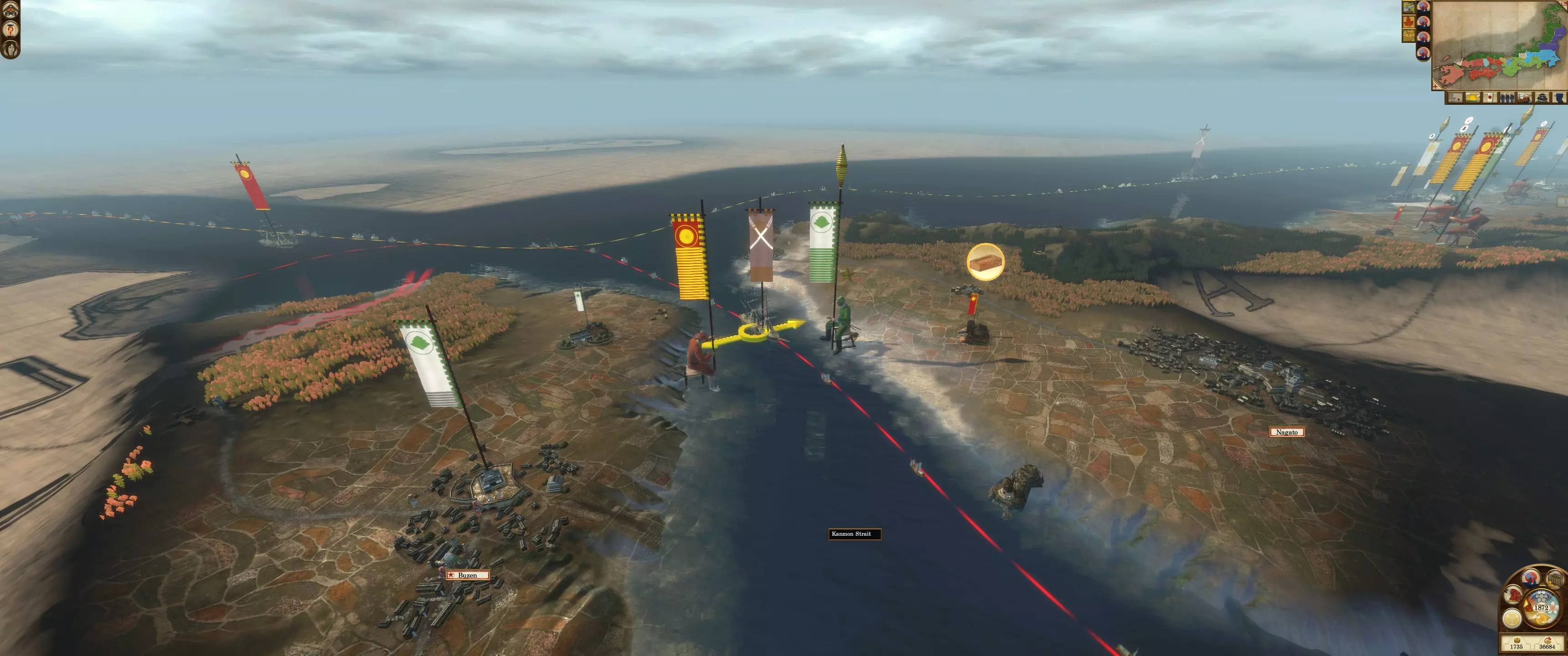 分隔本州与九州的这条海峡允许陆军单位无需船只即可穿越。在此部署一支强大的装甲舰队,可阻止敌军部队、特工及舰队通过。