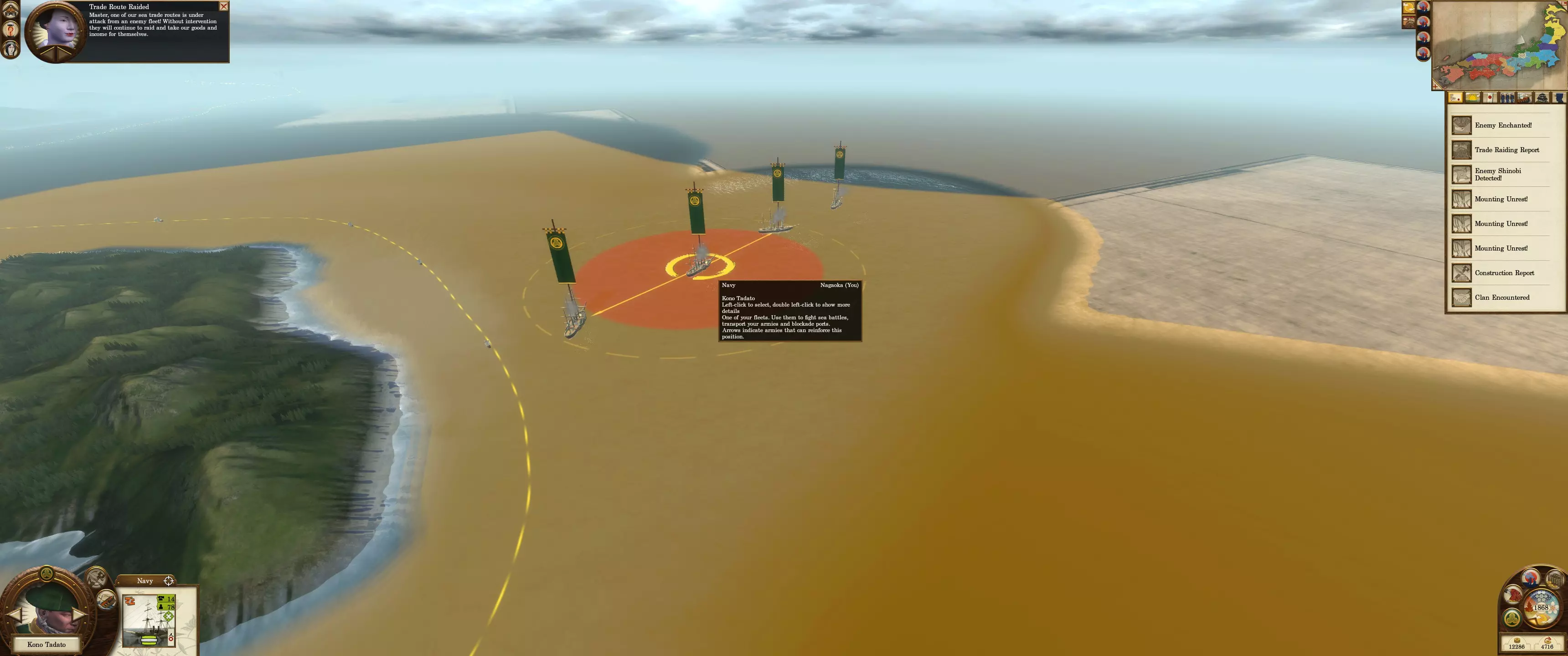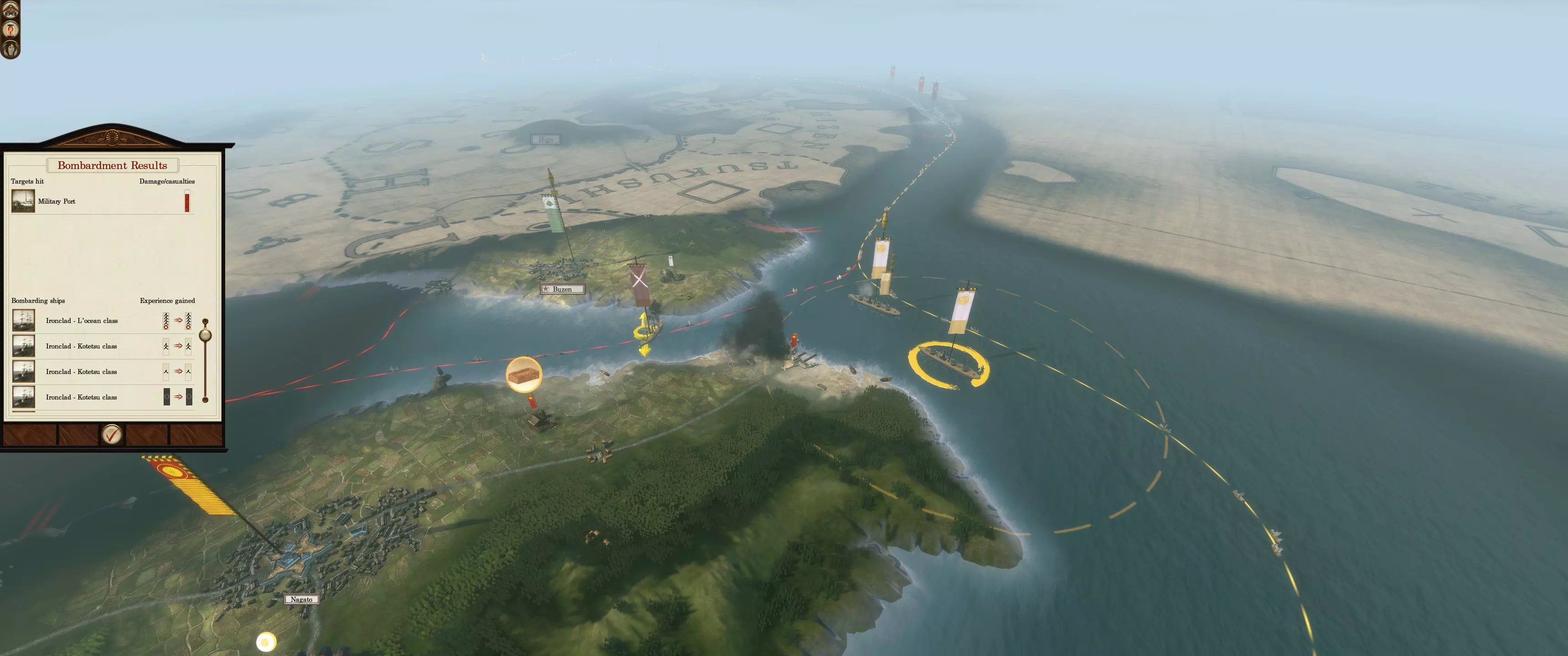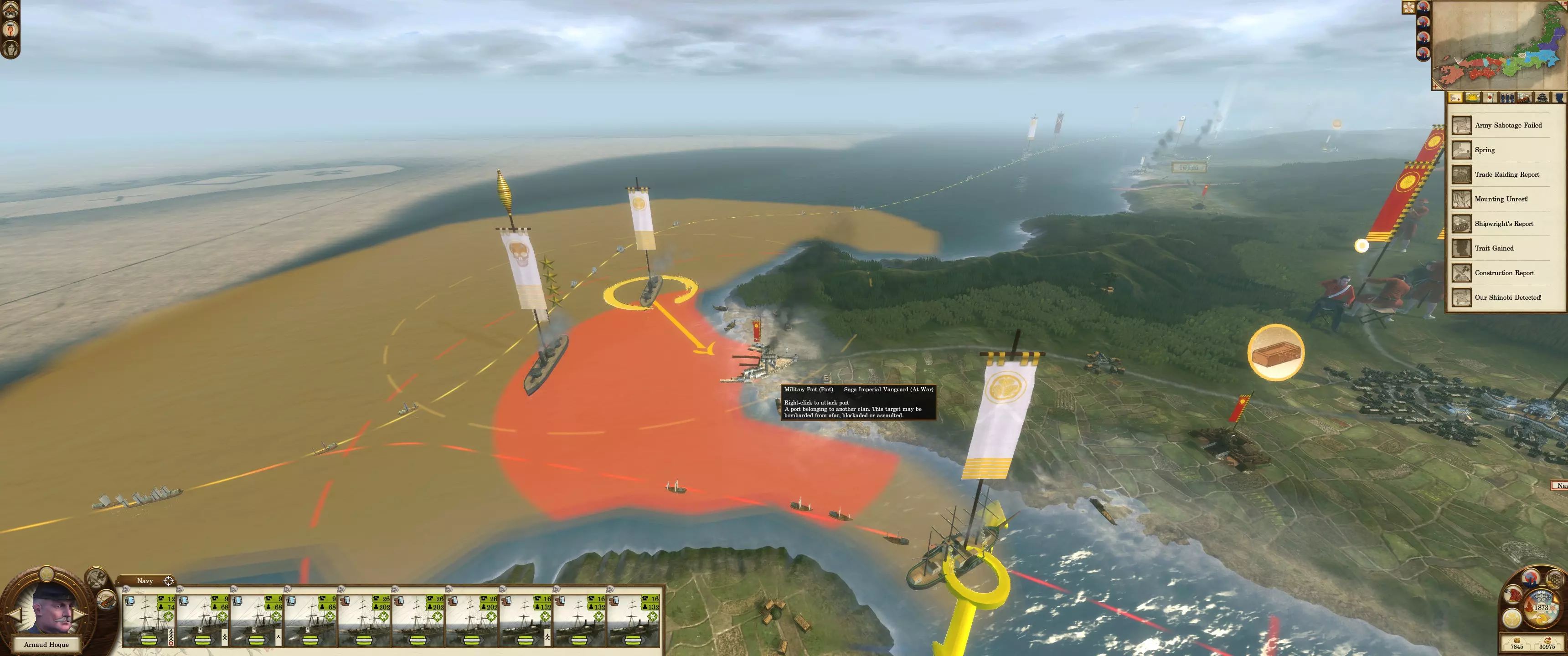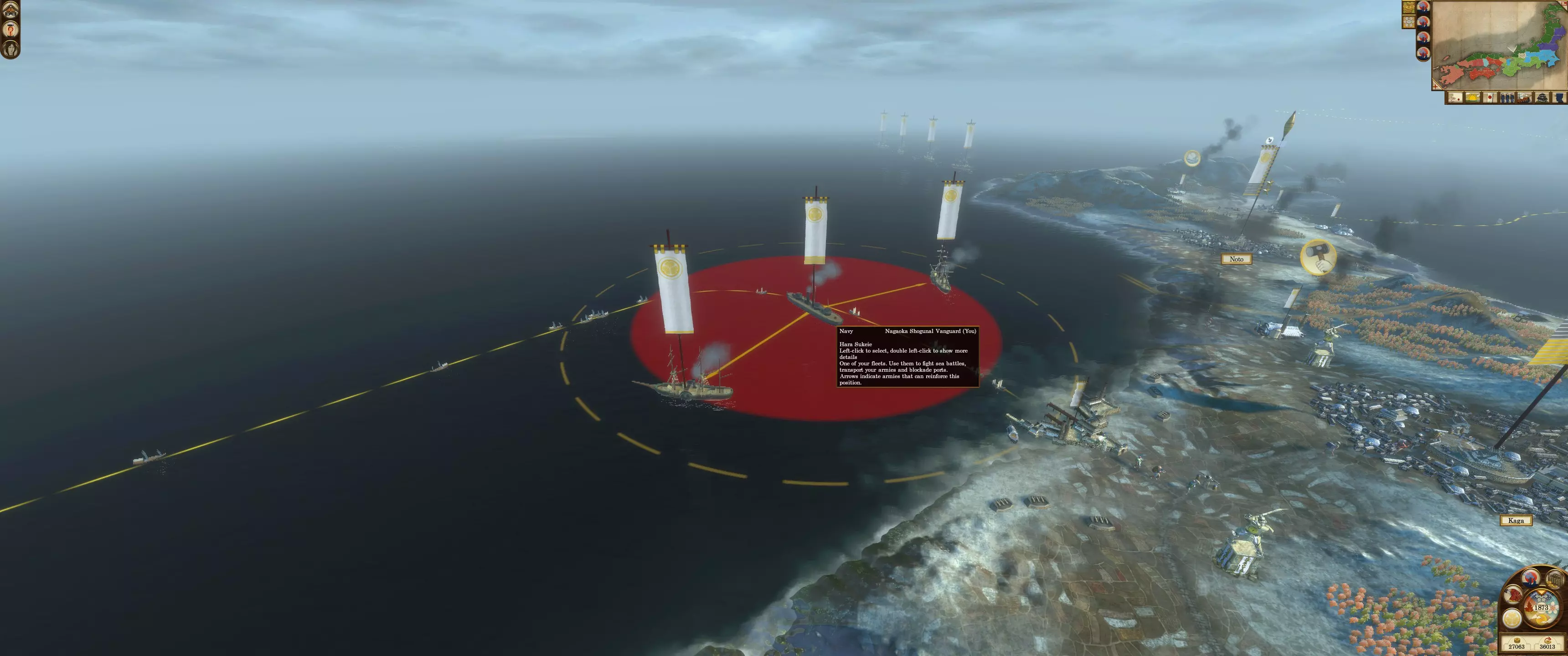 海军封锁是阻止敌人入侵的绝佳威慑手段。敌方单位通常不会攻击一支强大且部署得当的海军。镀铜的春日型和咸临丸因其速度和灵活性,是很好的增援单位。