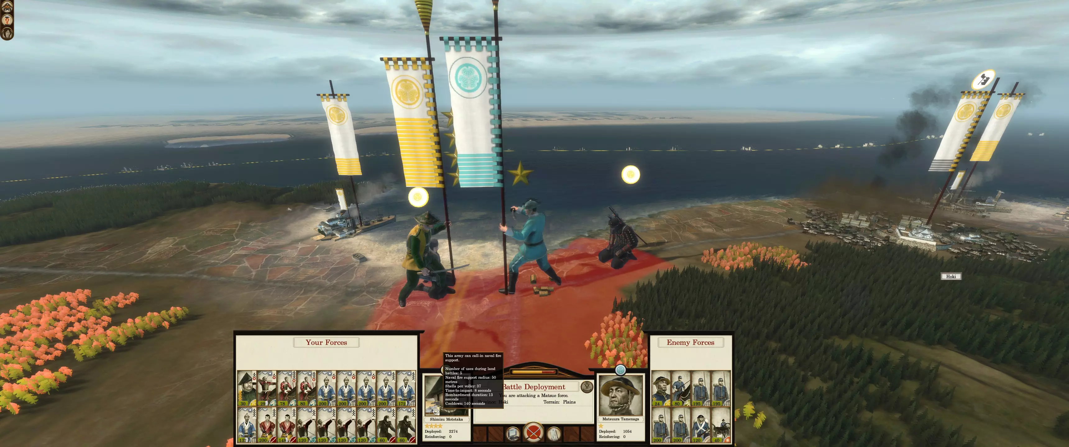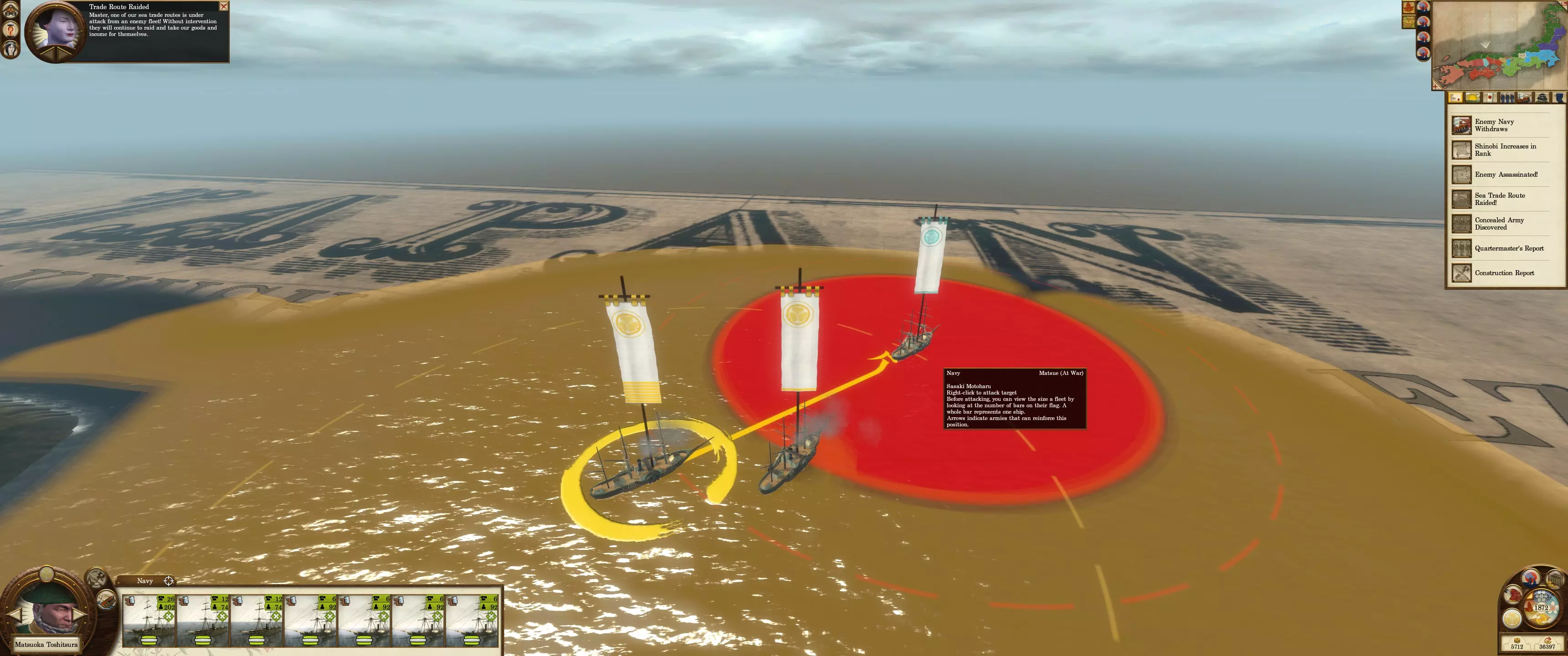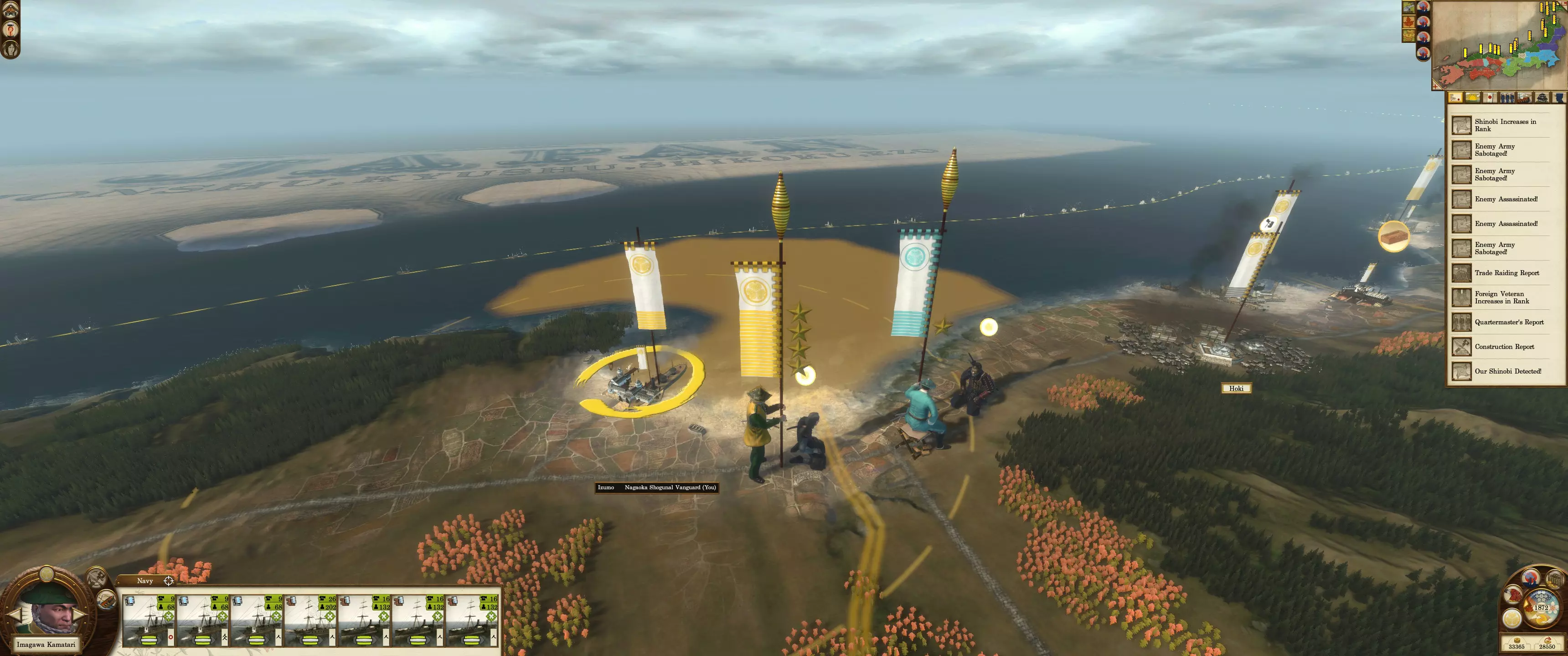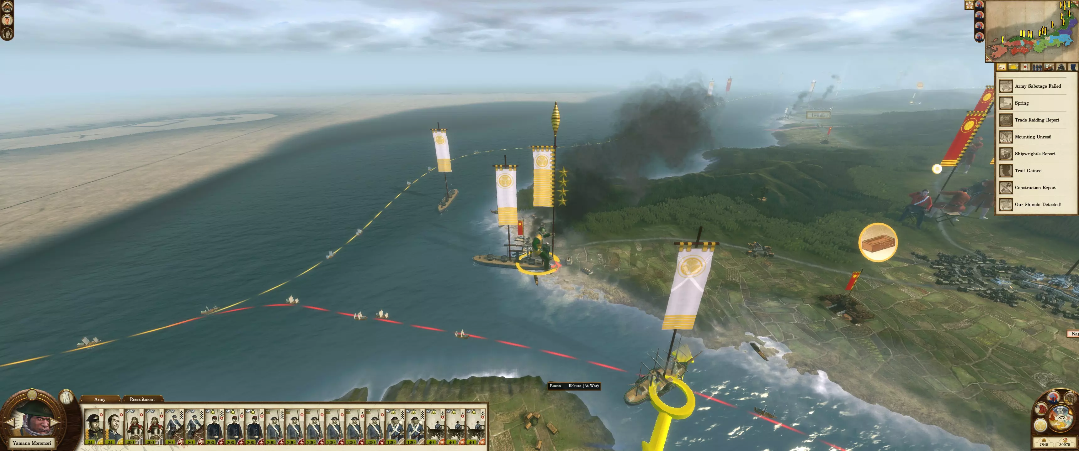 海军封锁是阻止敌人入侵的绝佳威慑手段。敌方单位通常不会攻击一支强大且部署得当的海军。镀铜的春日型和咸临丸因其速度和灵活性,是很好的增援单位。