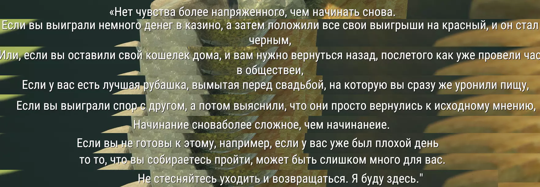 类似的主题贯穿了整个游戏。你只需接受这一点,继续玩下去。 这或许可以被称为心理恐怖游戏,但它更像是在教会我们接受失败是常态,并继续前进。 另外,建议你仔细留意字幕。在关键情节前,游戏会解释为何采用高难度模式设计,因此我建议你在游玩时认真阅读对话。我个人很喜欢游戏的叙事方式,能让人放松下来并陷入思考。游戏的物理机制相当简单,理解起来并不难。最重要的是,不要再随意挥舞锤子,这里也不需要点击操作。只需保持平静,平静是通关的关键。当你保持平静时,就能顺利推进游戏。你越是愤怒,行为就会越愚蠢,最终就越容易回到起点。顺便说一句,这和生活非常相似。字幕也证实了这一点。在现实世界中,你随时可能失去一切,而剩下的只有接受现实并继续前行,寻找解决办法。所以我推荐这款游戏,它非常棒。 成就: 一切都很简单。 不,并非如此。 总共有3个成就。