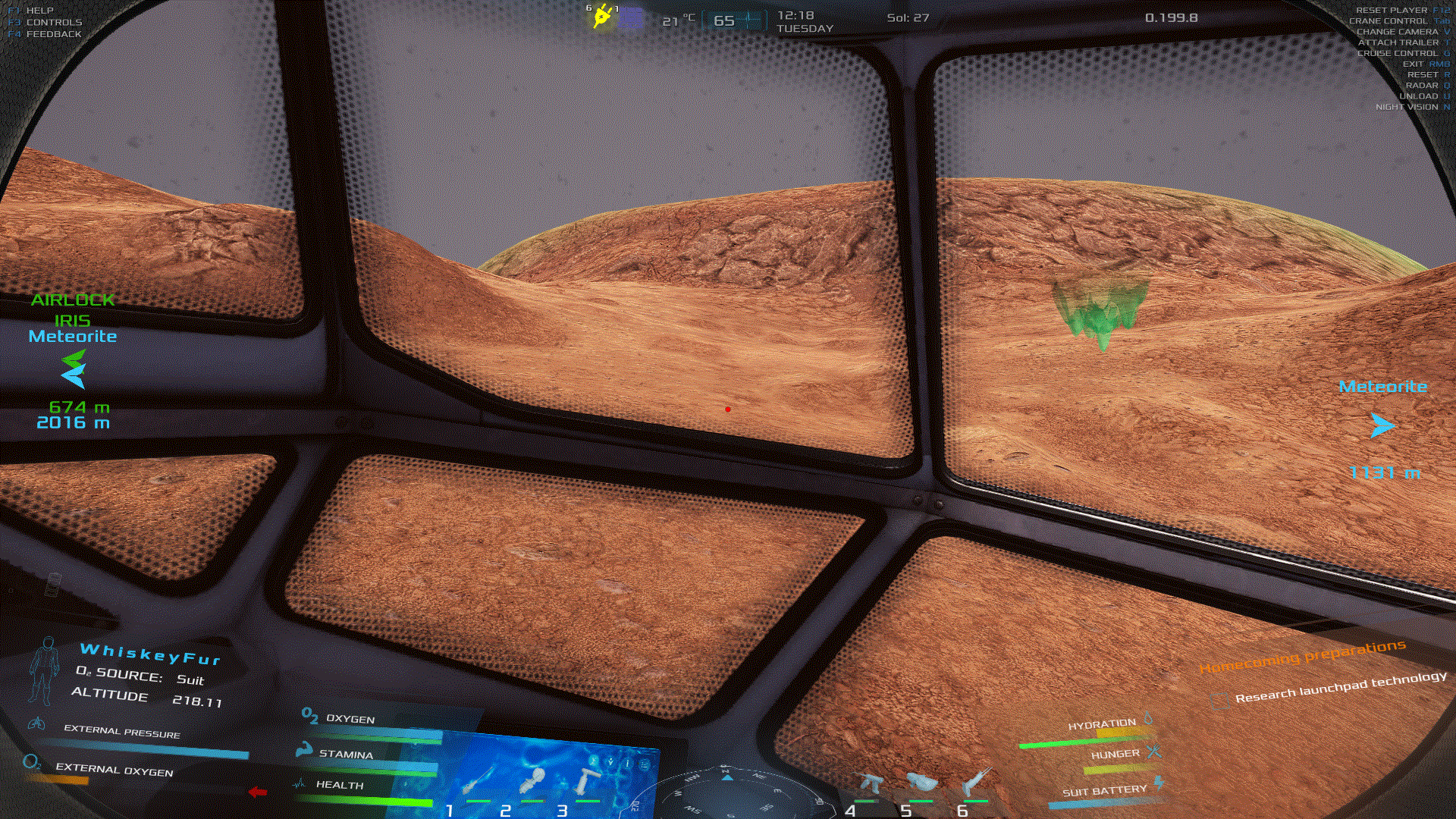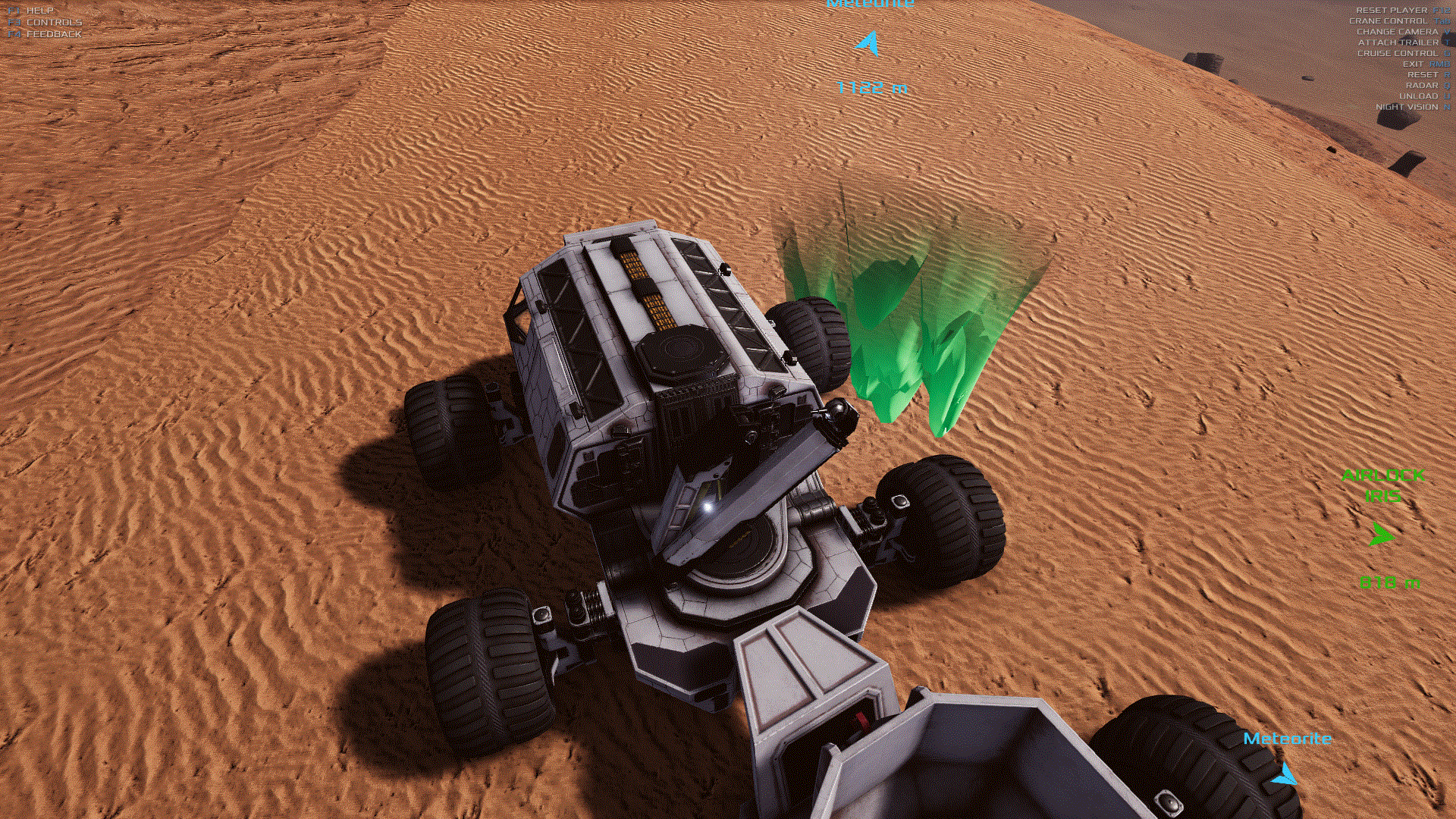 本指南旨在帮助玩家了解如何使用月球车和手持探测器来寻找矿石。不知为何,这是互联网上最难找到相关信息的主题,因为它非常令人困惑,而且游戏内的说明也不够完善。 如何扫描,结合示例说明! 首先,你需要月球车来完成大部分繁重的工作(无论是字面意义上还是比喻意义上),因为它的扫描范围比手持扫描仪大得多。 扫描键是什么?默认是Q键,与手持扫描仪相同。如果你忽略了这一点,你并不是笨蛋,你不会是第一个也不会是最后一个这样做的人……打开它,然后开始四处行驶。(我大概玩到游戏四分之三进度时才发现居然有这个功能,所以如果你之前没注意到也不用懊恼。) 步骤1:开始扫描(漫游车) 按下Q键并启动扫描脉冲。 扫描脉冲会从你的漫游车发出,类似声纳脉冲。当脉冲未探测到任何感兴趣的物体时会显示白色,探测到水时显示蓝绿色,探测到铀时显示绿色……以此类推。 这里脉冲仍显示白色,因为它正在向外传播,就是那条与驾驶舱窗户横梁齐平的白色光带。