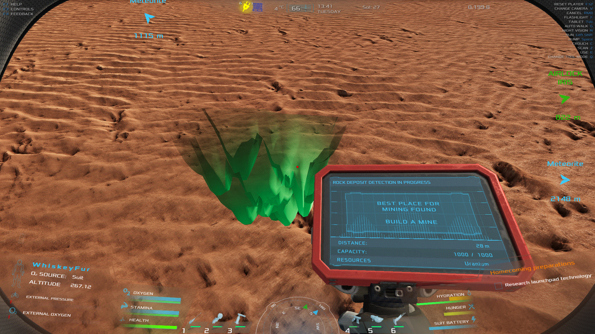 在区域内行走 使用手持扫描仪在该区域四处走动,以找到实际的节点。很可能你已经足够接近,并且已经找到了“最佳开采位置”,但无论如何,在区域内走动一番总是没错的。 毕竟你最终还是要在那里建造采矿机,并且需要有一条可驾驶的路线通往矿场。提前规划这些事情会更好。