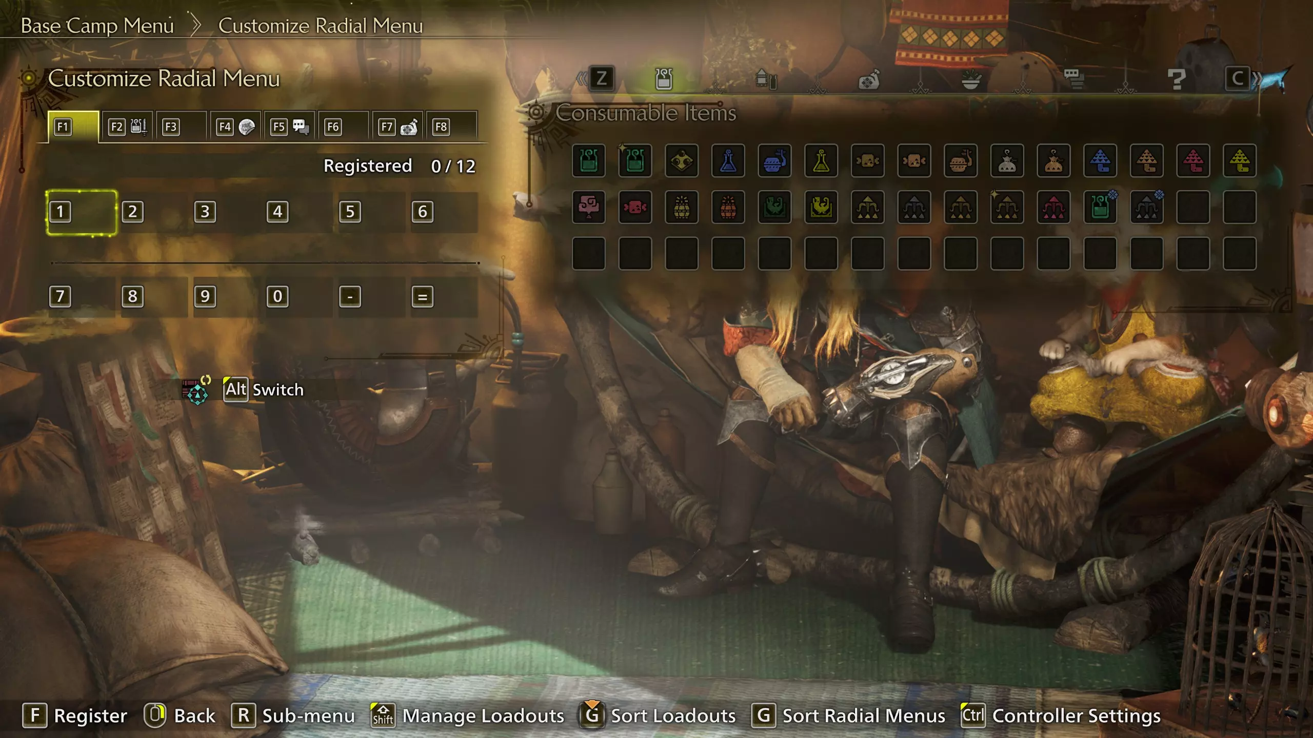 或者,进入你的帐篷,然后前往物品菜单(第一个标签页)→ 自定义轮盘菜单。