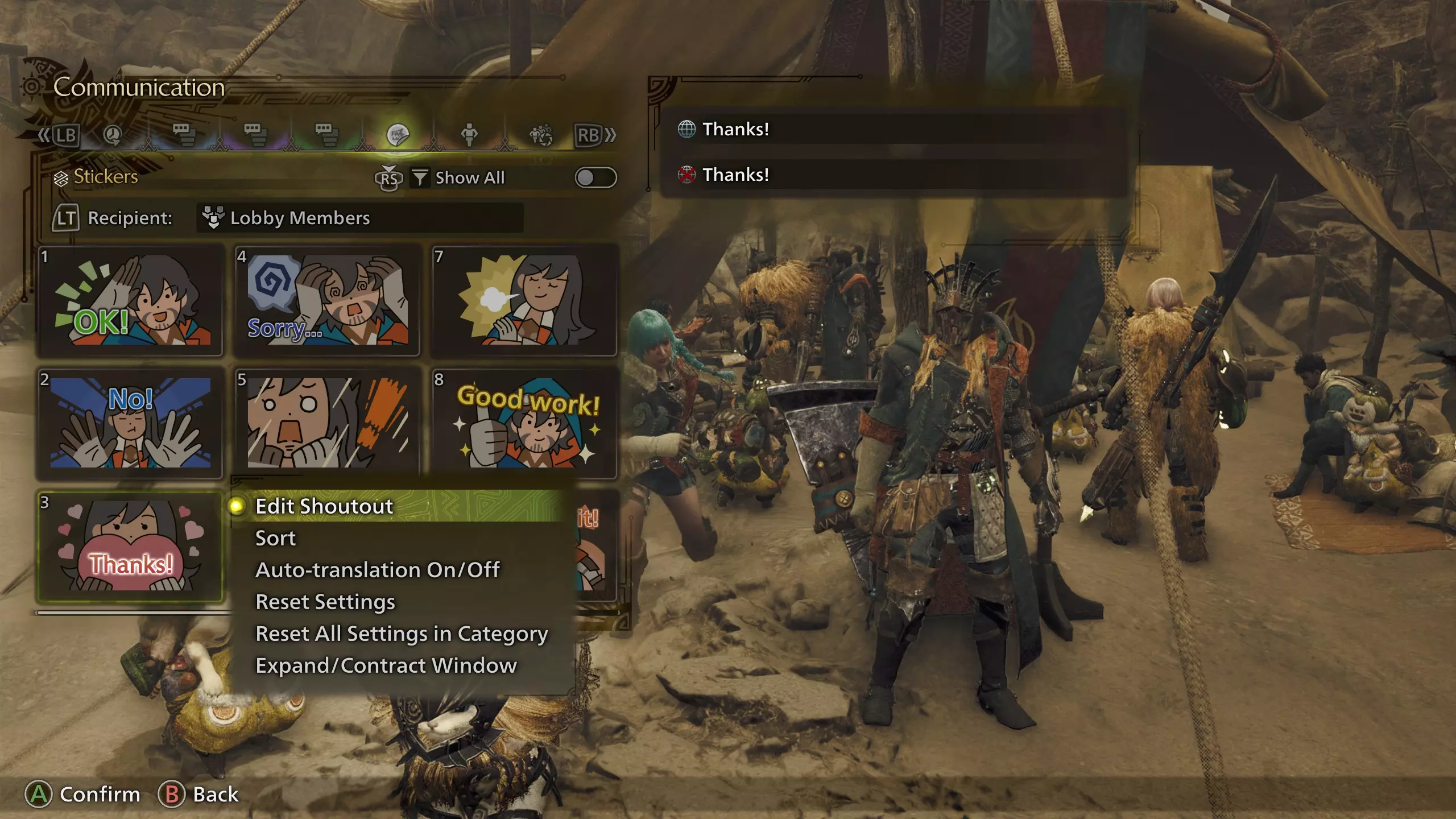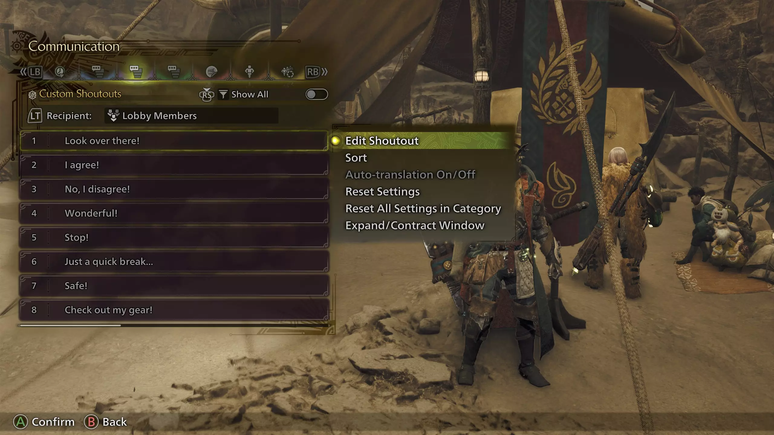 最近使用 - 第一个标签页 你最近使用过的任何喊话、贴纸、表情或姿势都会显示在此标签页中。你可以在这里快速访问你的常用内容。 手动喊话 - 第二个标签页 喊话是一种预设的短消息,你可以选择发送到聊天记录中,无需在键盘上输入任何内容。对于PC玩家来说这听起来可能没什么用,但对于没有键盘的主机玩家来说非常实用。 通信菜单的这个标签页用于手动喊话。你会看到所有这些消息旁边都有一个地球图标。地球图标表示该消息会自动翻译给接收者。这个功能对于成员来自多个国家和地区的狩猎队伍来说非常棒。这些手动喊话有好几页,所以请左右滚动查看全部内容。在任何喊话上,你可以按Y键/三角键调出选项菜单:你可以编辑喊话并自定义(这将禁用该喊话的自动翻译功能)、对列表进行排序、开启/关闭翻译、将喊话和设置重置为默认值,以及更改用户界面窗口大小。