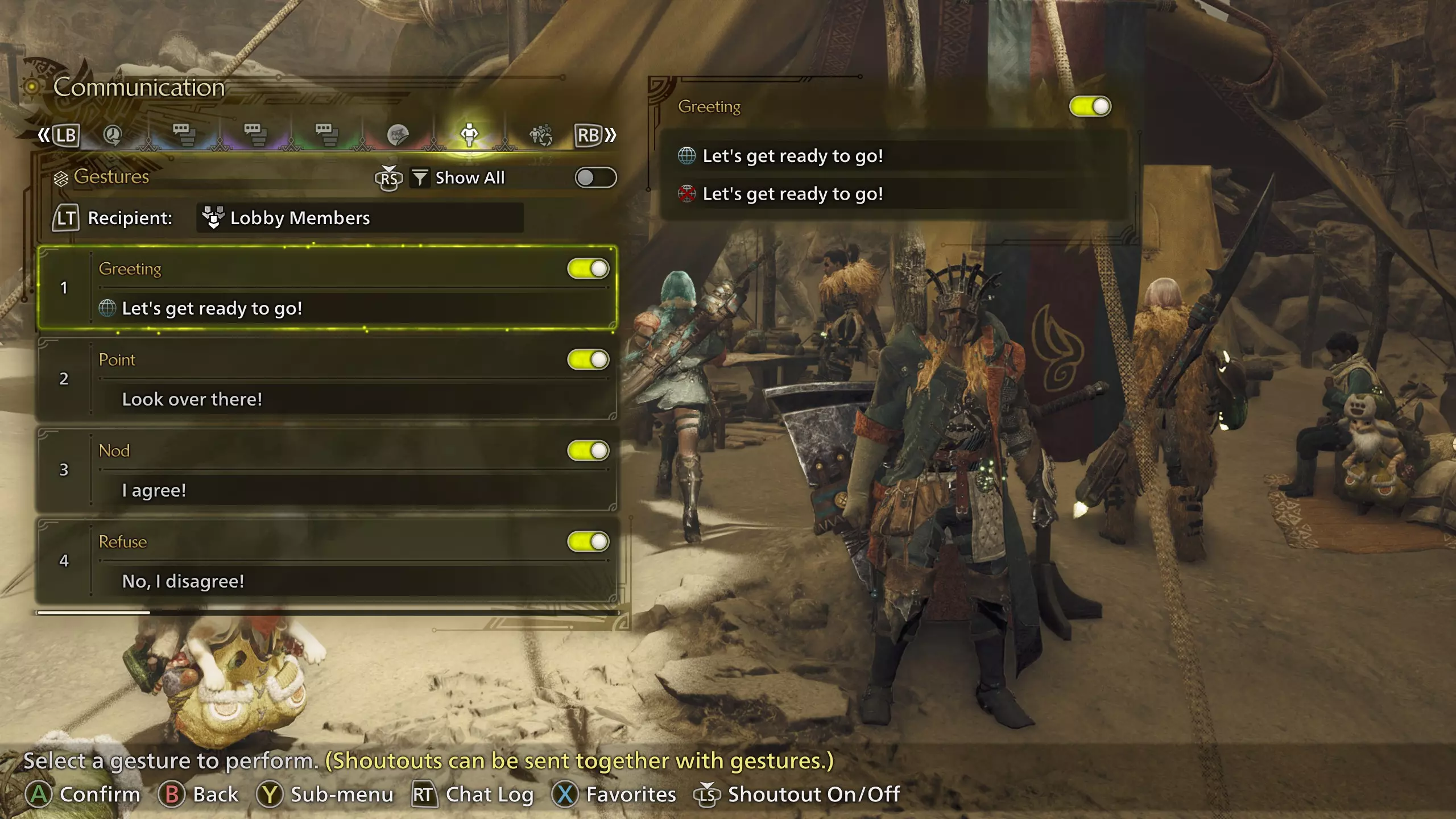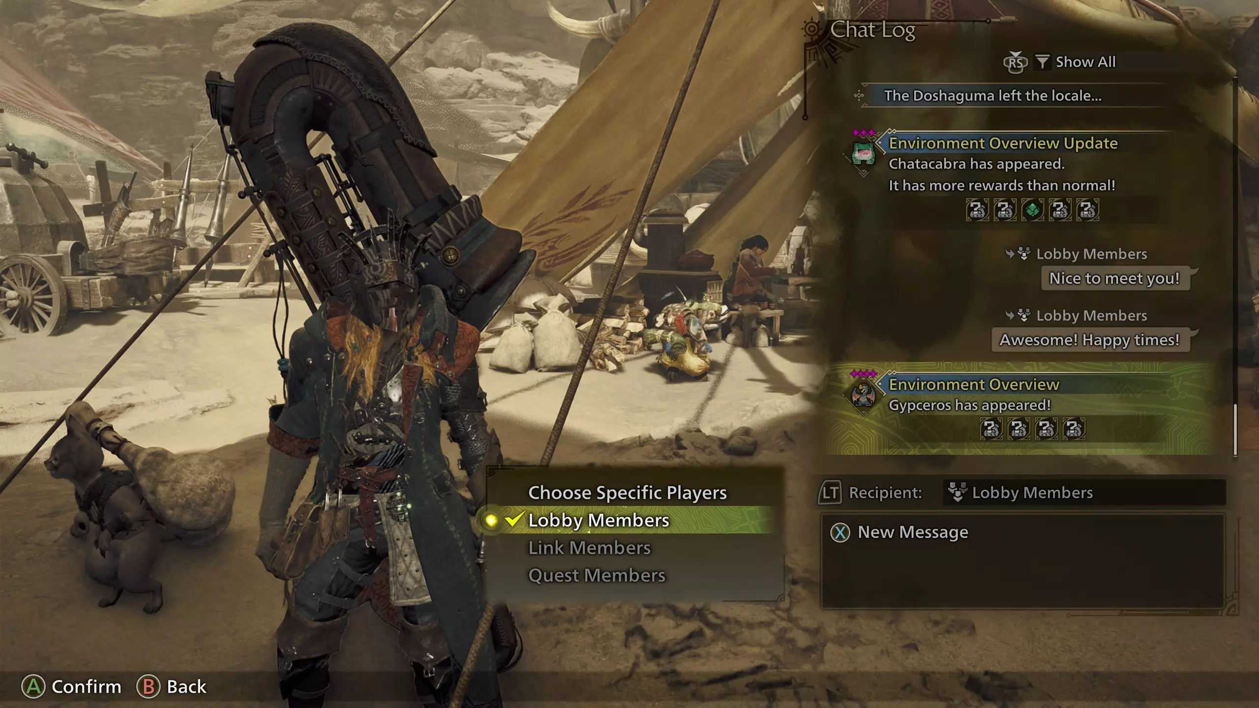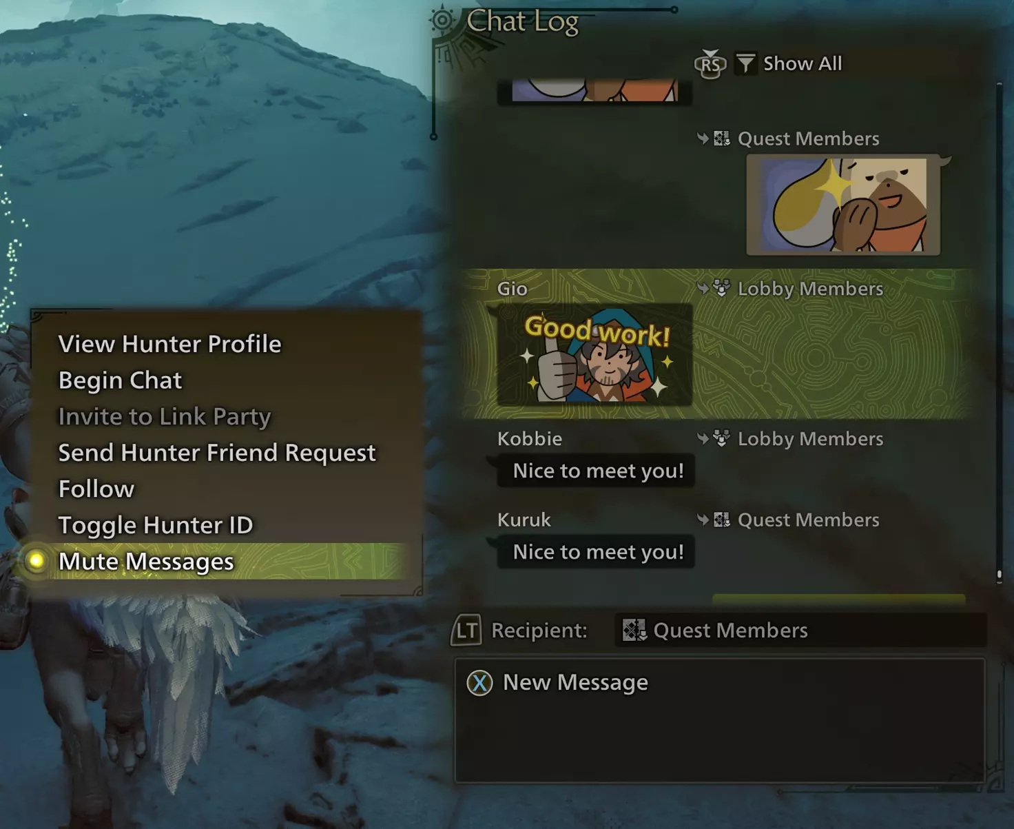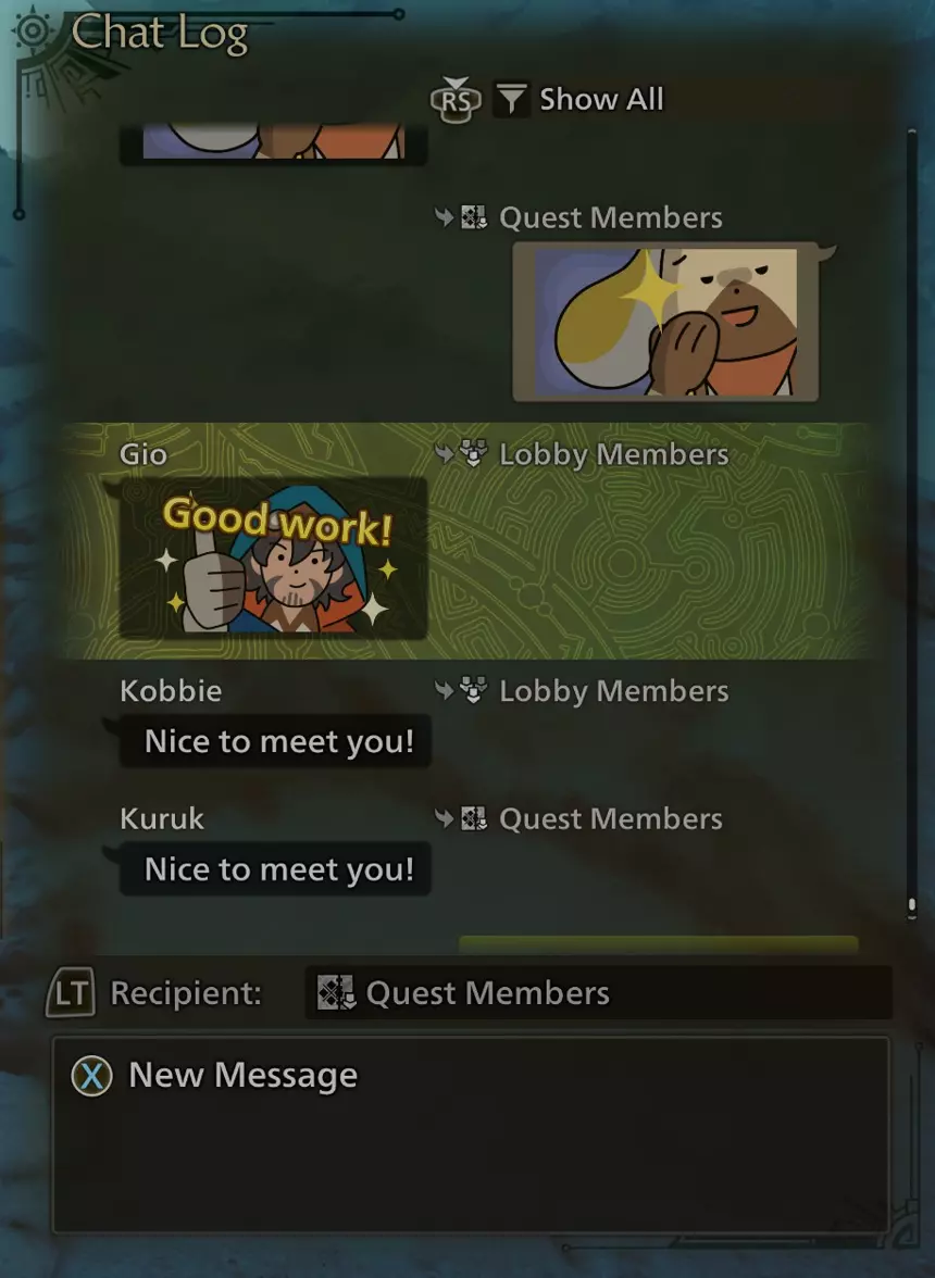 游戏内交流 你可以输入消息、进行语音聊天、发送贴纸、发送喊话,以及让你的猎人做出手势或姿势。下面我们来了解所有这些选项。 聊天日志 首先要了解的是聊天日志。当有人发送消息或贴纸时,屏幕右侧会显示一个小通知。你可以通过打开开始菜单→【通讯】(第4个标签)→【聊天日志】来打开聊天日志。(或者,按住控制器上的菜单按钮,即3条水平线的按钮。)你会看到所有最新消息,向上滚动可以查看更早的消息。