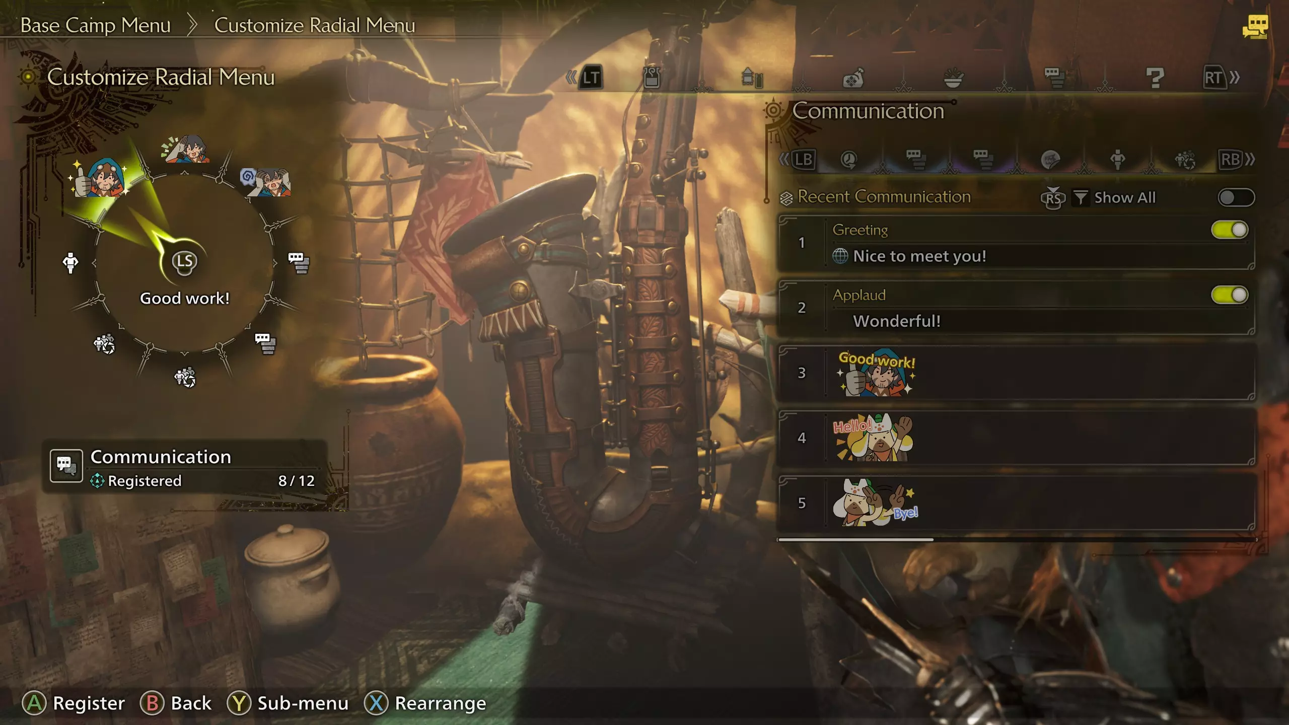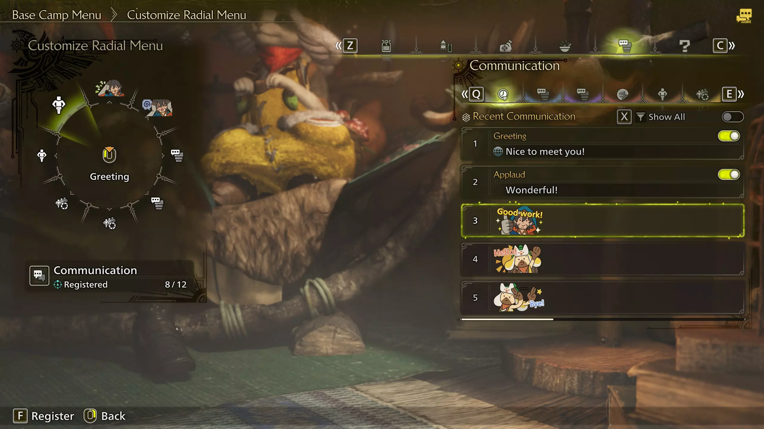 额外的姿势组合可能通过任务奖励在游戏内解锁。Steam商店也可能通过DLC外观捆绑包提供姿势组合供购买。 轮盘菜单 轮盘菜单包含了交流菜单中的所有内容——喊话、贴纸、手势、姿势,你可以将它们全部添加到轮盘菜单中,以便在狩猎中快速访问。使用手柄时,按住LB/L1并向任意方向倾斜右摇杆,然后将摇杆归位即可使用轮盘菜单。使用鼠标和键盘时,只需按下数字行中的按键即可。