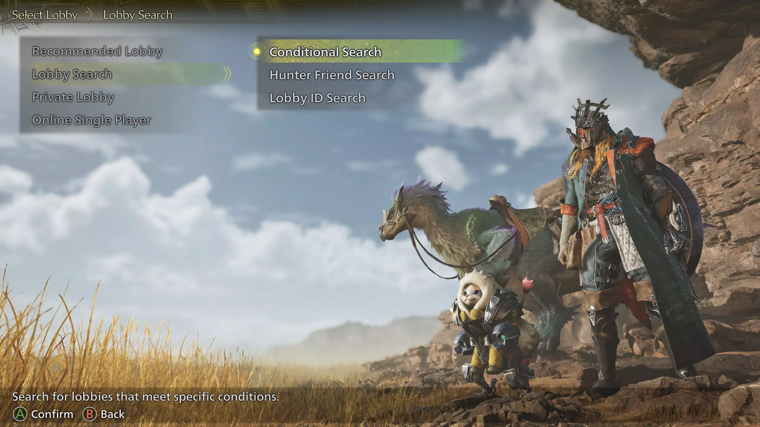 推荐大厅 游戏会自动为你寻找大厅并将你加入。选择可能基于地理位置、游戏内语言、猎人等级等多种因素。 大厅搜索 选择大厅搜索将打开几个子选项。 条件搜索 - 寻找符合特定条件的大厅,例如语言或技能等级(新手/老手/任意)。 猎人好友搜索 - 显示你的猎人好友列表。任何在线且处于开放大厅的好友,其名字会显示为亮白色文本。状态列还会显示他们是否正在进行任务以及当前的游戏内位置。所有其他不可加入的好友将显示为灰色文本。 大厅ID搜索 - 弹出文本框,供你输入大厅ID代码。