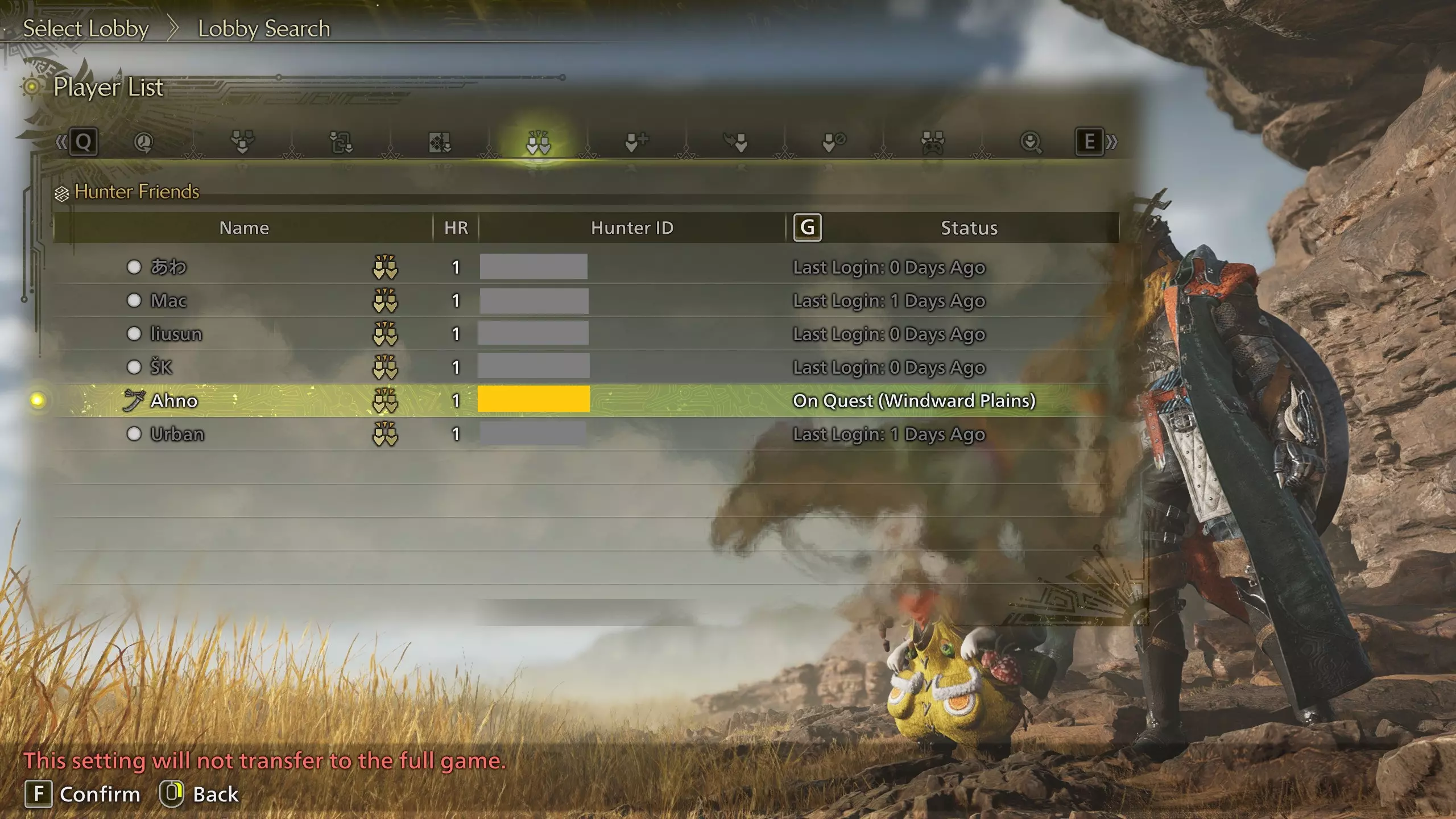 成为猎人好友有一个很大的好处,那就是以后不再需要分享大厅代码了。你只需让其中一人创建大厅,然后通过以下方式加入猎人好友的大厅:在标题画面主菜单中选择【开始游戏】→选择你的猎人→【大厅搜索】→【猎人好友搜索】,接着在接下来的界面中选择你想要加入的好友。(或者,在游戏内的营地时,你可以与阿尔玛对话→进入第三个标签页的【更换大厅】菜单→【大厅搜索】→【猎人好友搜索】。)