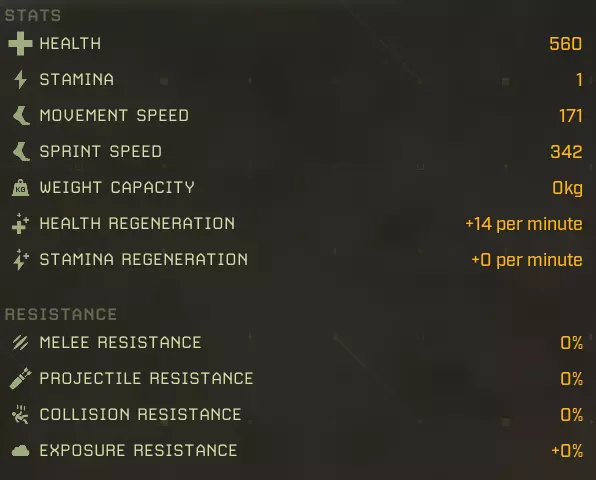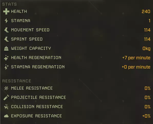生命值:1158 耐力:1 移动速度:602 冲刺速度:1146 负重上限:0kg 生命再生:+29/分钟 耐力再生:+0/分钟 近战抗性:40% 远程抗性:40% 碰撞抗性:0% 环境抗性:+0% 完美牧场:延长食物效果持续时间 +2% 食物效果持续时间 +5% 食物效果持续时间 +10% 食物效果持续时间 +20% 猎人印记:攻击命中时标记目标,使其下次被击中时受到额外伤害 25%几率施加【标记目标】 60%几率施加【标记目标】 100%几率施加【标记目标】 厚皮:提升物理伤害减免 +2 物理抗性 +5 物理抗性 +10 水分弹性:减少水分消耗 -2% 水分消耗:-5% 水分消耗:-10% 水分消耗:-20% 水分消耗 野性坚韧:生命值上限提升 +2% 生命值上限 +5% 生命值上限 +10% 生命值上限 +20% 生命值上限 拾荒者耐受:毒素抗性提升 +10% 毒素抗性 +20% 毒素抗性 +40% 毒素抗性 滋养恢复:生命再生提升 +5% 生命再生 +15% 生命再生 +30% 生命再生 +60% 生命再生 自然凶猛:近战伤害提升 +5% 近战伤害 +15% 近战伤害 +30% 近战伤害 +60% 近战伤害 无尽饥饿:击杀目标时恢复一定比例生命 击杀时恢复5%生命值 击杀时恢复15%生命值 击杀时恢复30%生命值 代谢保存:食物消耗减少 -2% 食物消耗 -5% 食物消耗消耗-10% 食物消耗-20% 食物消耗 【坚韧如皮】:提升物理伤害减免 +2物理抗性 +4物理抗性 +8物理抗性 +15物理抗性 【体温控制】:降低沙漠中的水分消耗,满级时获得抗中暑光环 -2%沙漠水分消耗 -5%沙漠水分消耗 -7%沙漠水分消耗 附近玩家更能抵抗中暑 【大胃王】:提升食物效果加成并允许额外的食物 buff +3%蔬果类增益效果 +7%蔬果类增益效果 +12%蔬果类增益效果 +15%蔬果类增益效果 +1胃容量 最大移动速度:602 最大 sprint 速度:1146 最大生命值:1158+20% = 1390 最大生命值 生命恢复:+29/分钟 +60% = 46/分钟 最大耐力:无 鸡基础属性: