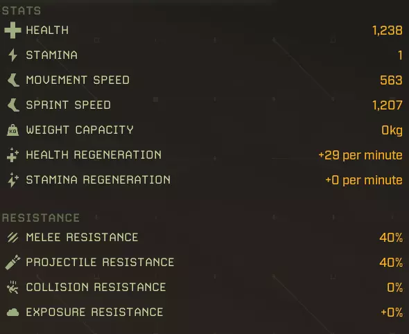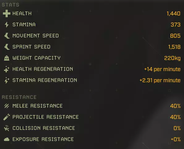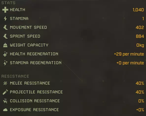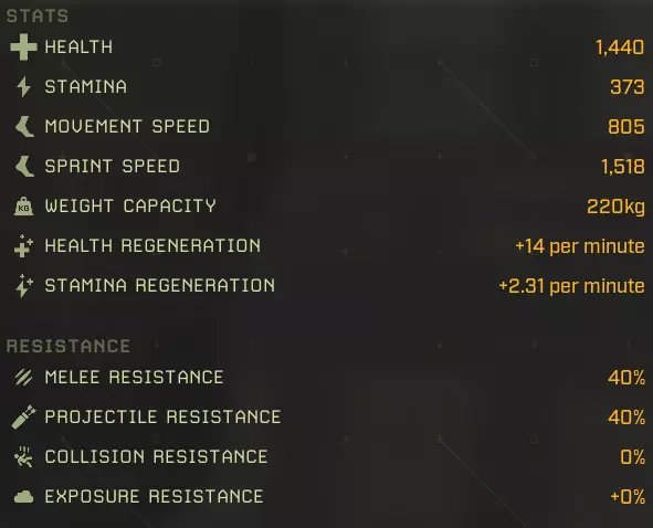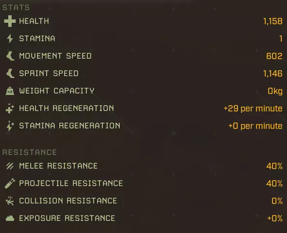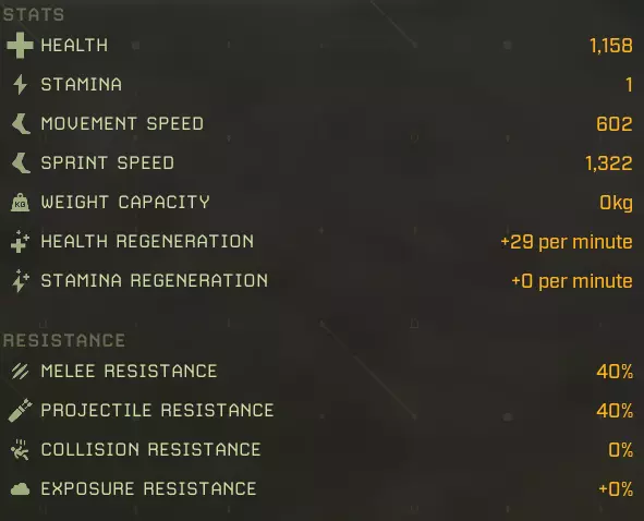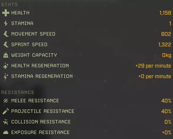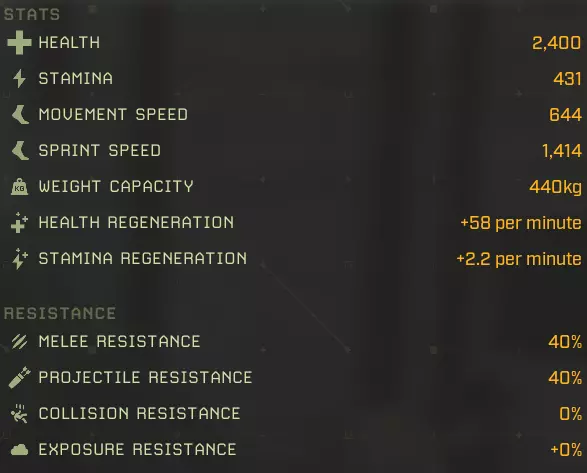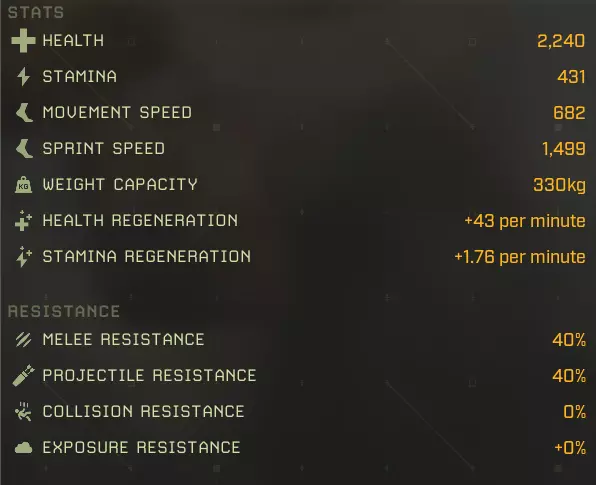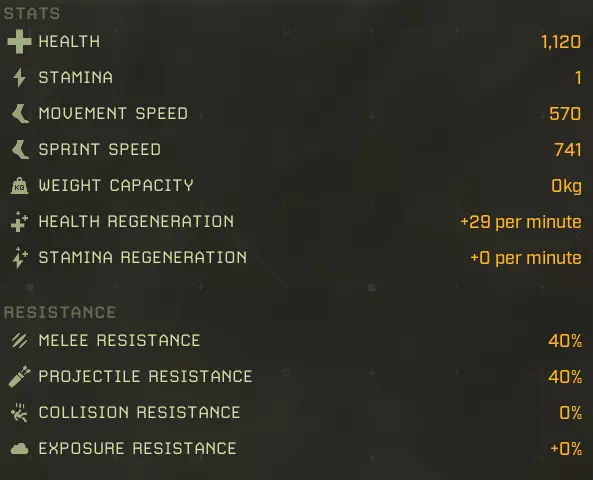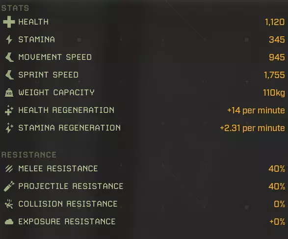 生命值:1158 耐力:1 移动速度:602 冲刺速度:1322 负重上限:0 生命再生:+29/分钟 耐力再生:+0/分钟 近战抗性:40% 远程抗性:40% 碰撞抗性:0% 环境抗性:+0% 完美牧场:延长食物效果持续时间+2% 食物效果持续时间+5% 食物效果持续时间+10% 食物效果持续时间+20% 猎人印记:攻击命中时标记目标,使其下次被击中时受到额外伤害 25%几率施加【标记目标】 60%几率施加【标记目标】 100%几率施加【标记目标】 水分弹性:减少水分消耗-2% 水分消耗-5% 水分消耗-10% 水分消耗-20% 野外坚韧:增加最大生命值+2%最大生命值+5% 最大生命值+10% 最大生命值+20% 协同攻击:短时间高亮命中目标 命中时有25%几率高亮目标 命中时有60%几率高亮目标 命中时有100%几率高亮目标 极地突变:命中时有几率施加冻结效果 攻击命中时有+5%几率造成冻结 攻击命中时有+15%几率造成冻结 攻击命中时有+25%几率造成冻结 滋养恢复:提升生命 regeneration +5%生命 regeneration +15%生命 regeneration +30%生命 regeneration +60%生命 regeneration 自然凶猛:提升近战伤害 +5%近战伤害 +15%近战伤害 +30%近战伤害 +60%近战伤害 无尽饥饿:击杀目标时恢复一定百分比生命值 击杀时恢复5%生命值 15%击杀时恢复生命值:击杀时恢复30%生命值 代谢保存:减少食物消耗 -2%食物消耗 -5%食物消耗 -10%食物消耗 -20%食物消耗 【坚韧如皮革】:提升物理伤害减免 +2物理抗性 +4物理抗性 +8物理抗性 +15物理抗性 【温暖光环】:在北极地区提升生命值再生,满级时获得抗寒光环 +10%北极地区生命值再生 +25%北极地区生命值再生 +35%北极地区生命值再生 附近玩家更抗寒 【大胃王】:提升食物效果加成并允许额外的食物 buff +3%蔬果类增益效果 +7%蔬果类增益效果 +12%蔬果类蔬菜修正效果+15% 水果和蔬菜修正效果+1 胃部空间 最大移动速度:602 最大冲刺速度:1322 最大生命值:1158 +20% = 1387 最大生命再生:+29/分钟 + 60% + 35%(北极)= 46/分钟,57/分钟(北极) 最大耐力:无数据 泰伦努斯基础属性: