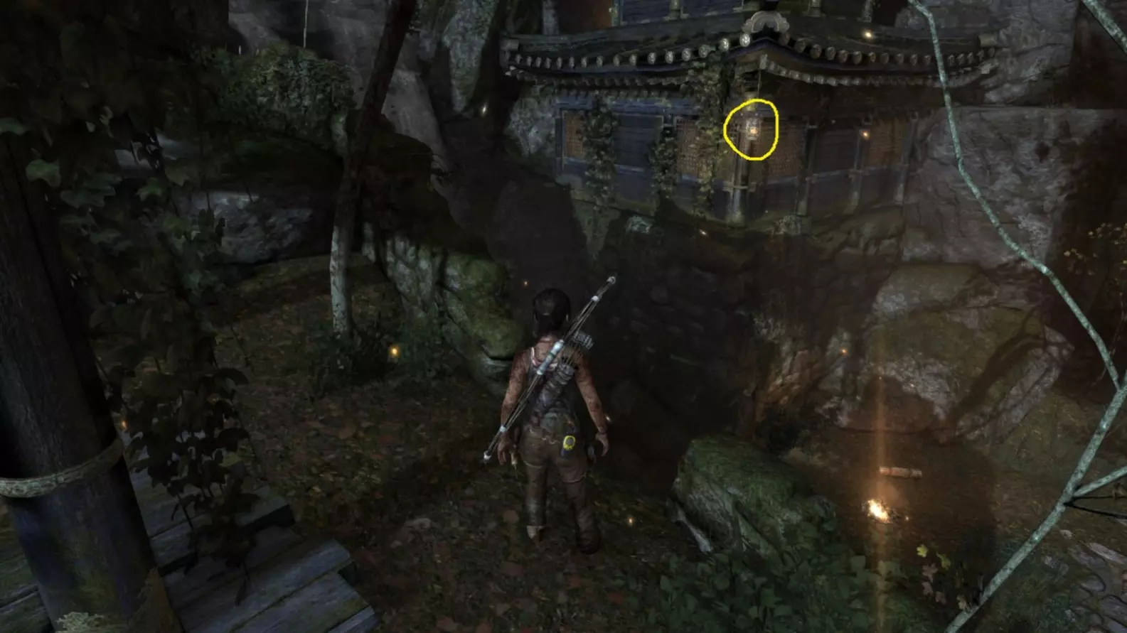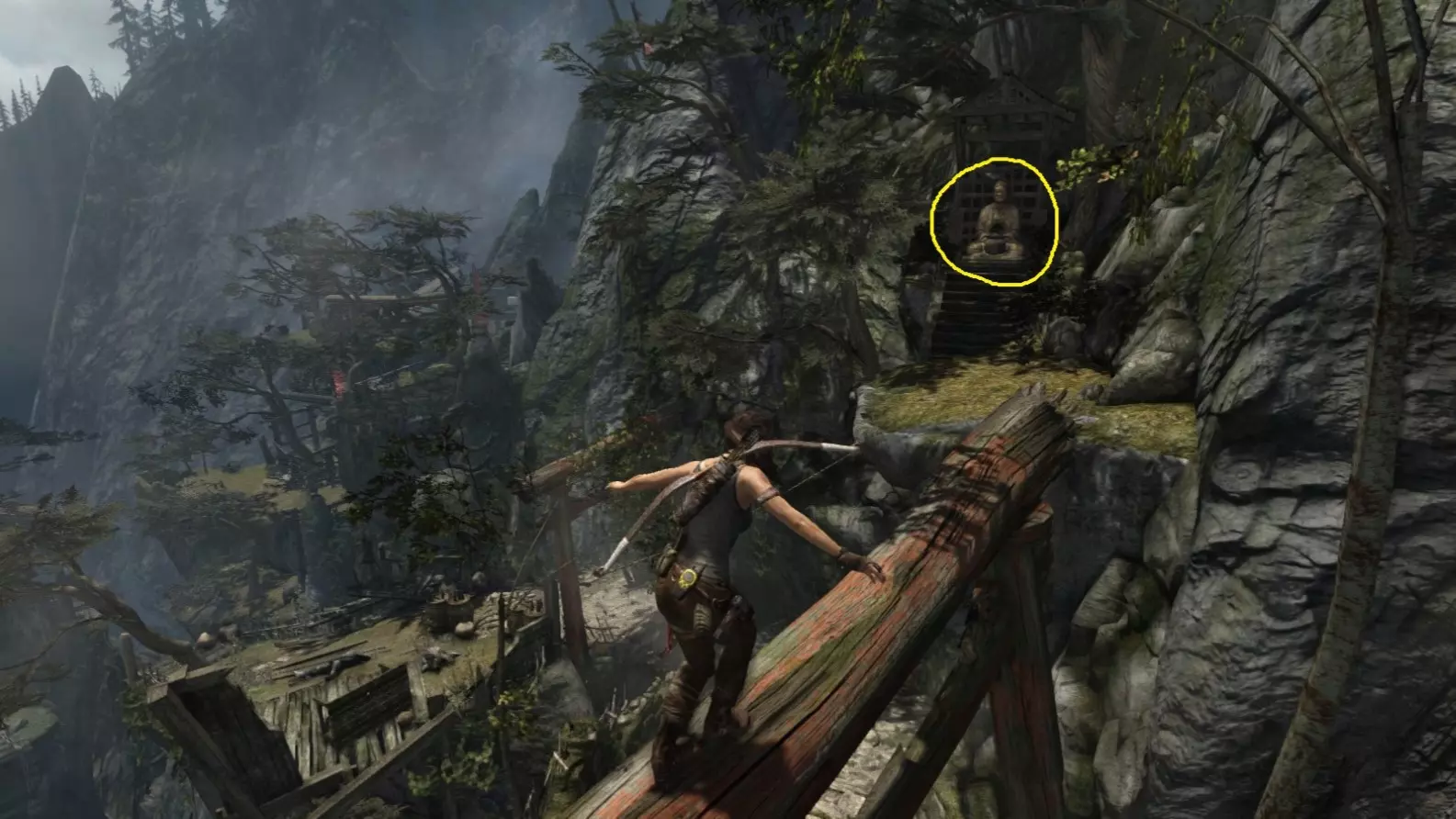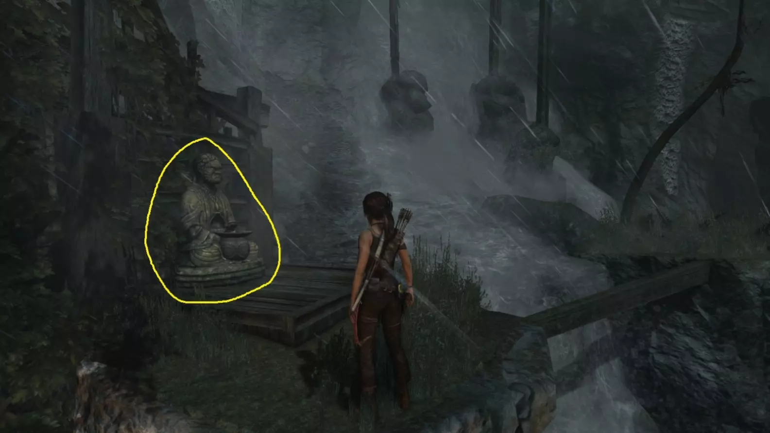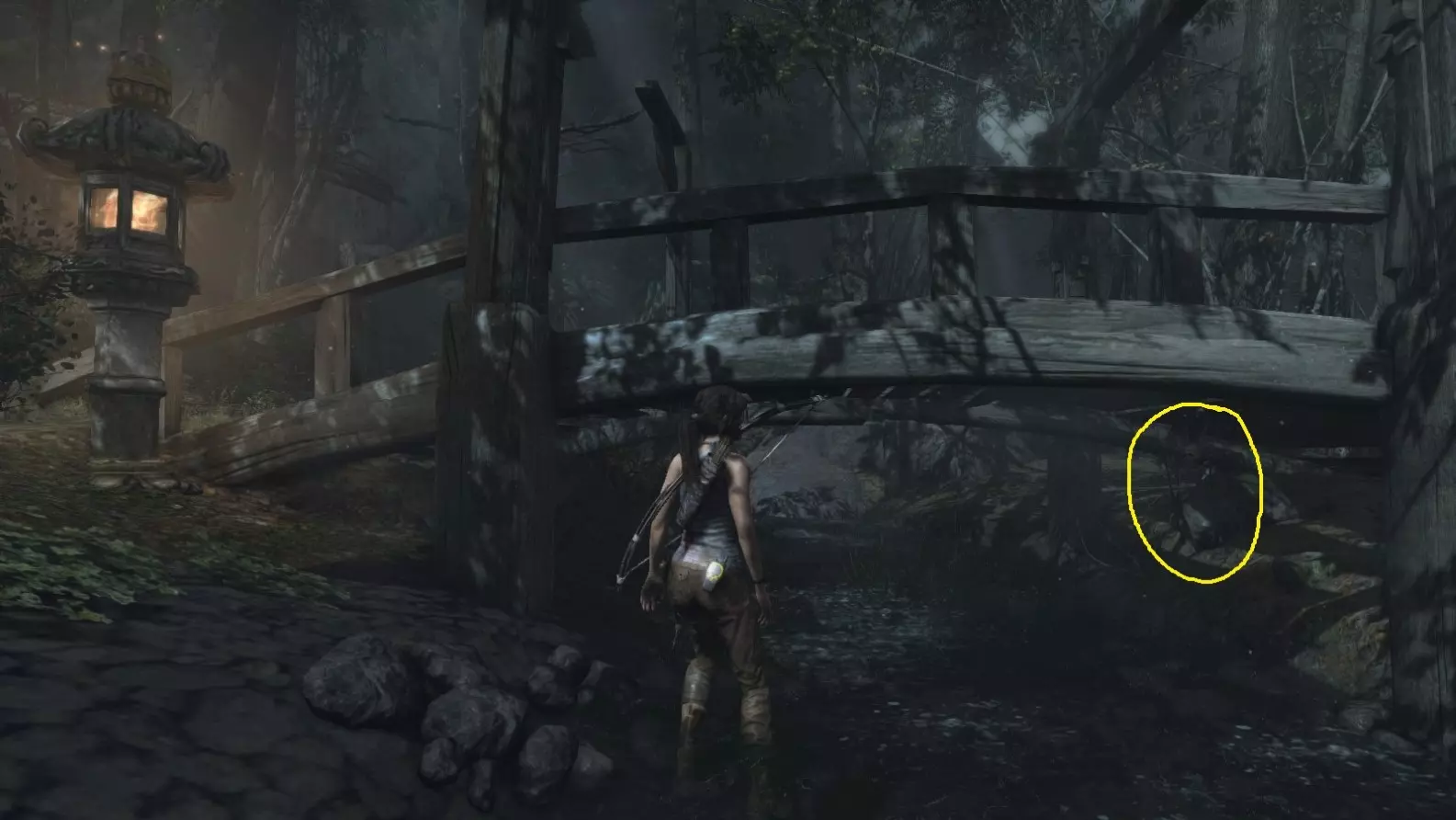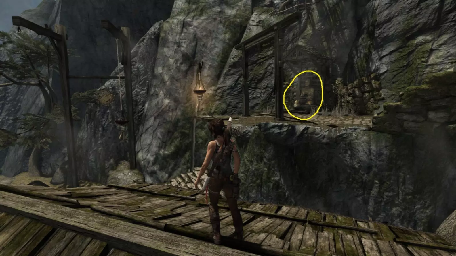 劳拉来到一座断裂的桥边。雕像位于左侧的木质结构中。截图B - 光照8/10
