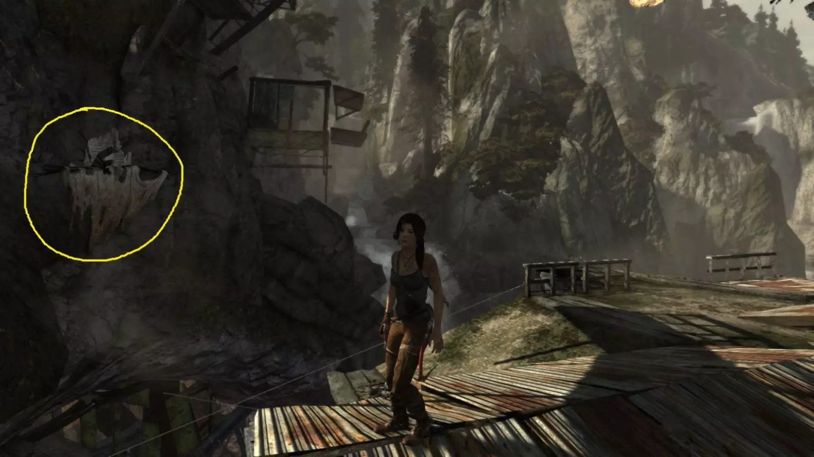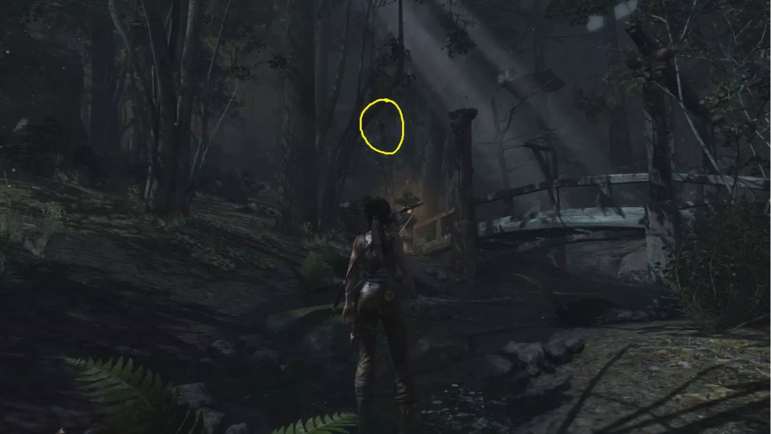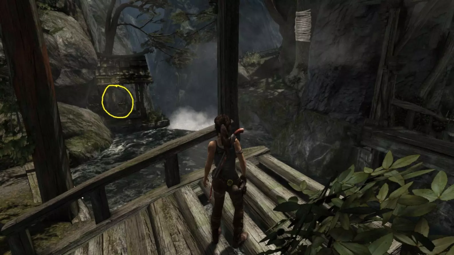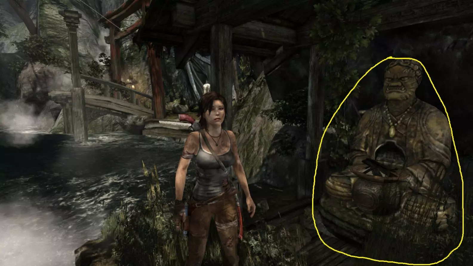 劳拉来到一座断裂的桥边。雕像位于左侧的木质结构中。截图B - 光照8/10