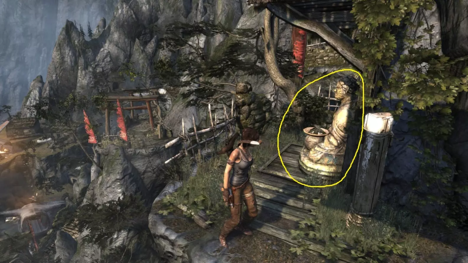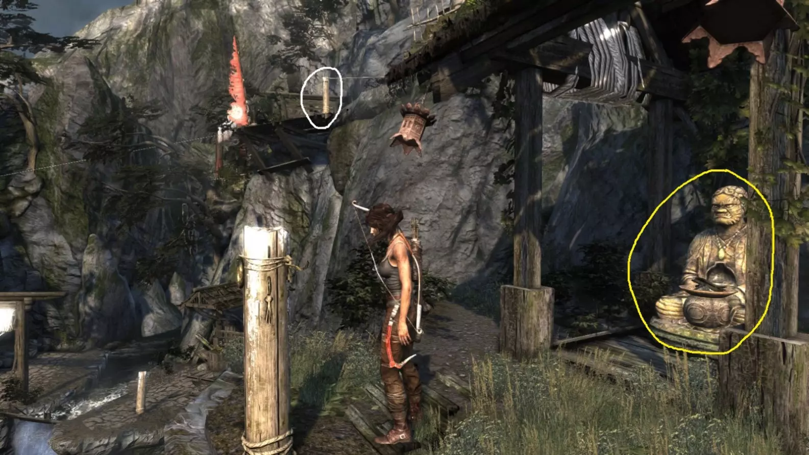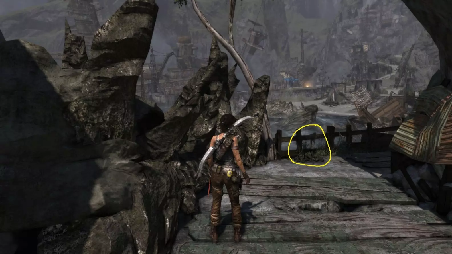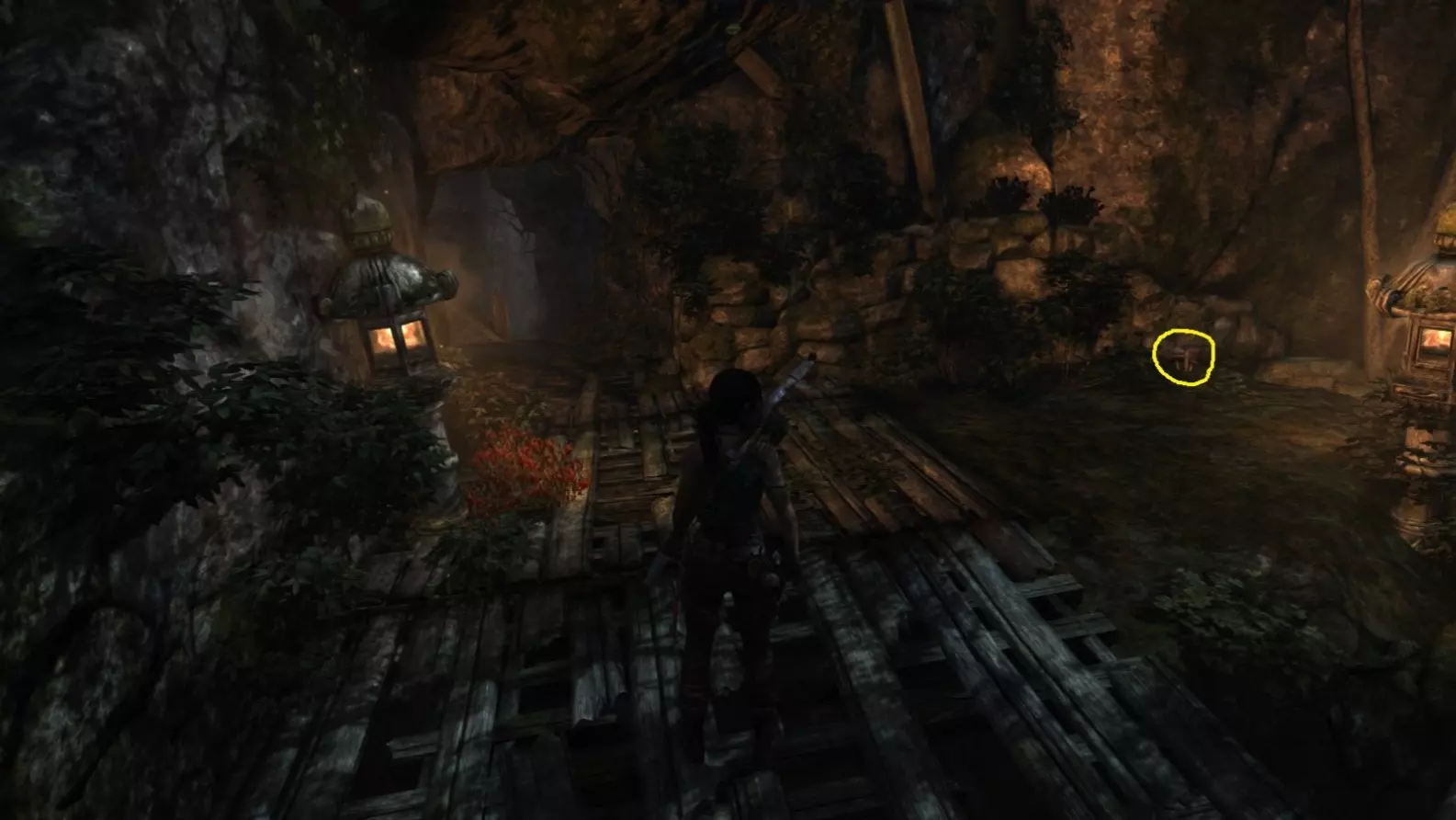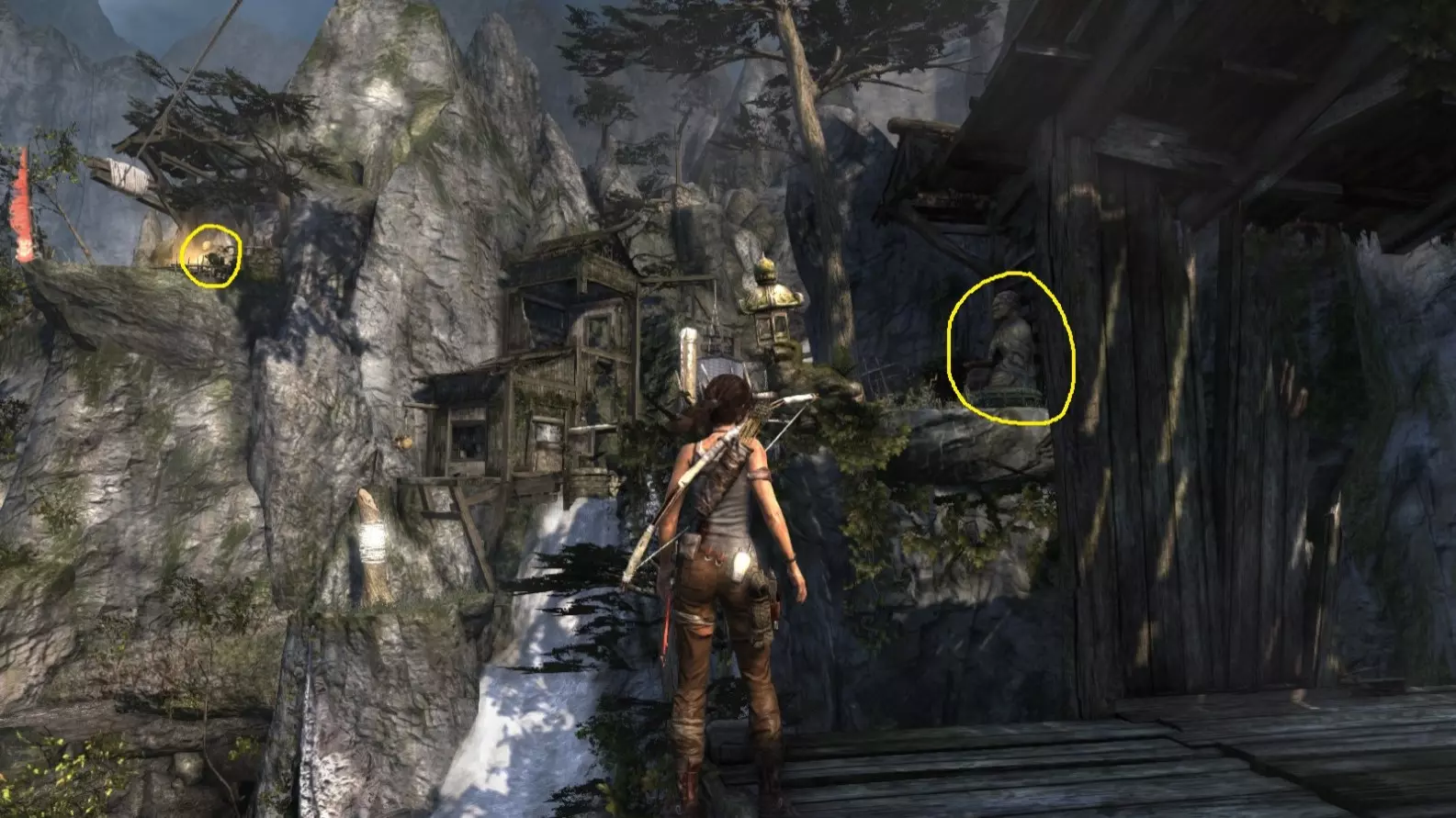 劳拉来到一座断裂的桥边。雕像位于左侧的木质结构中。截图B - 光照8/10