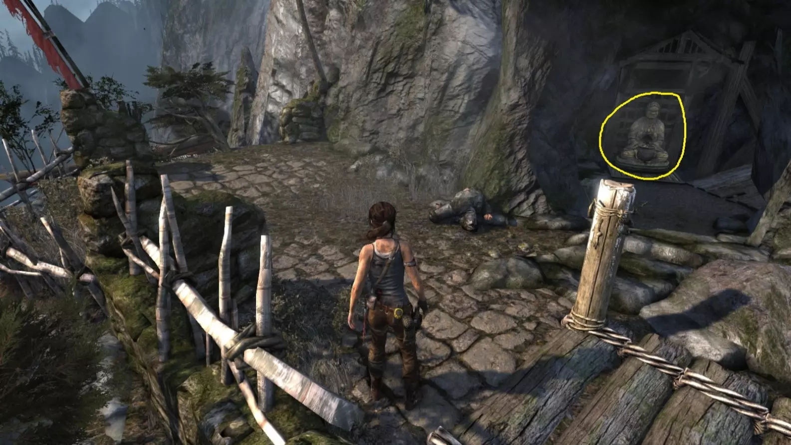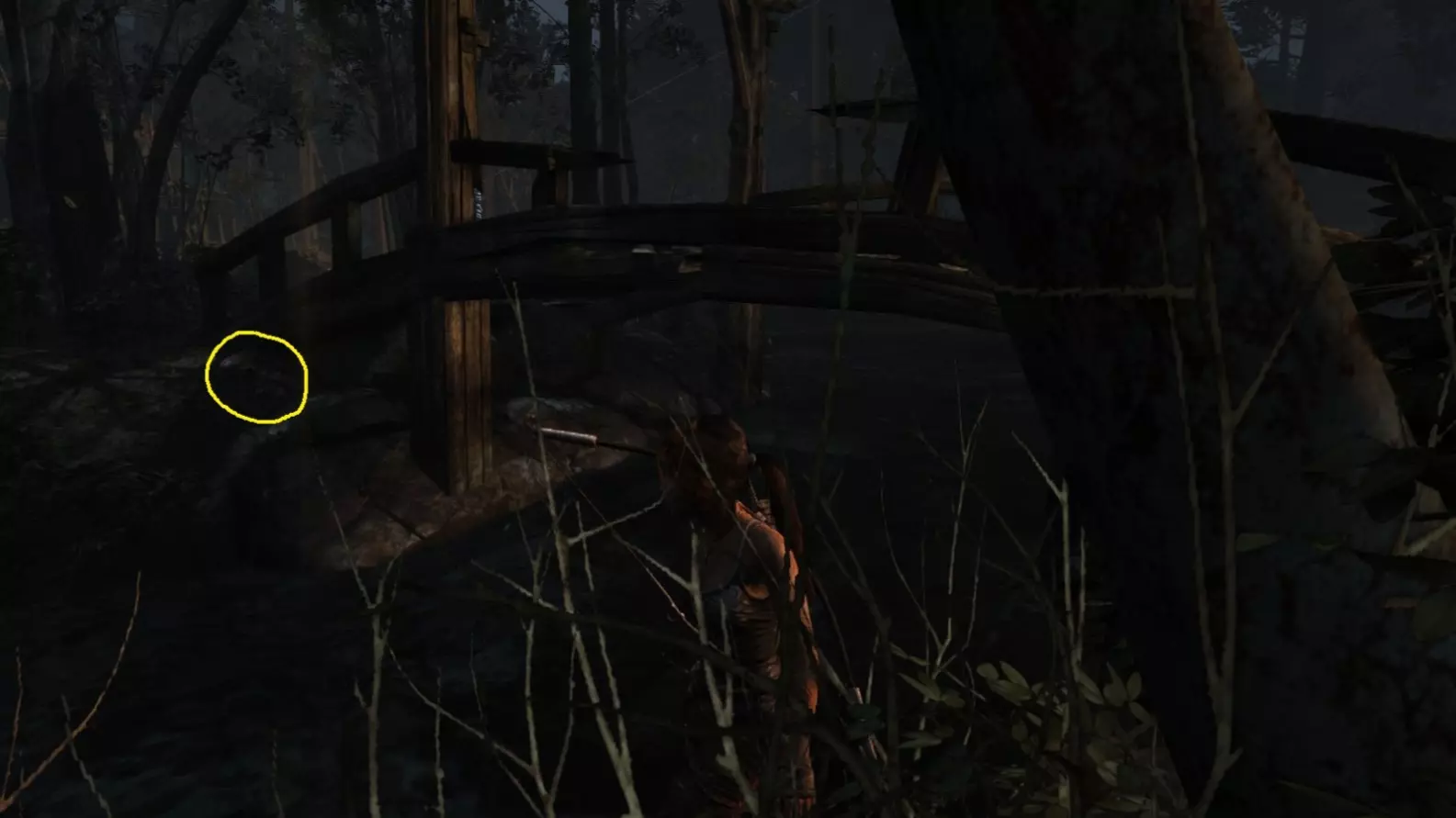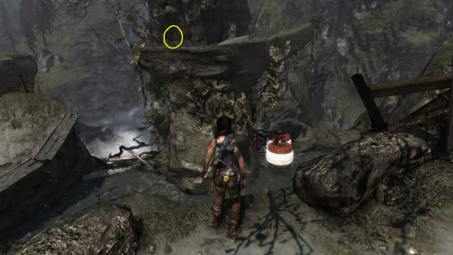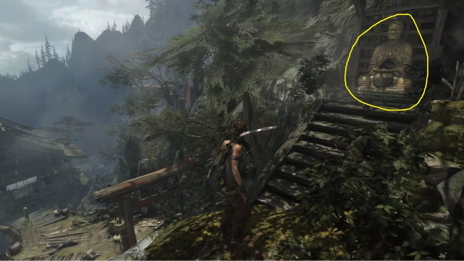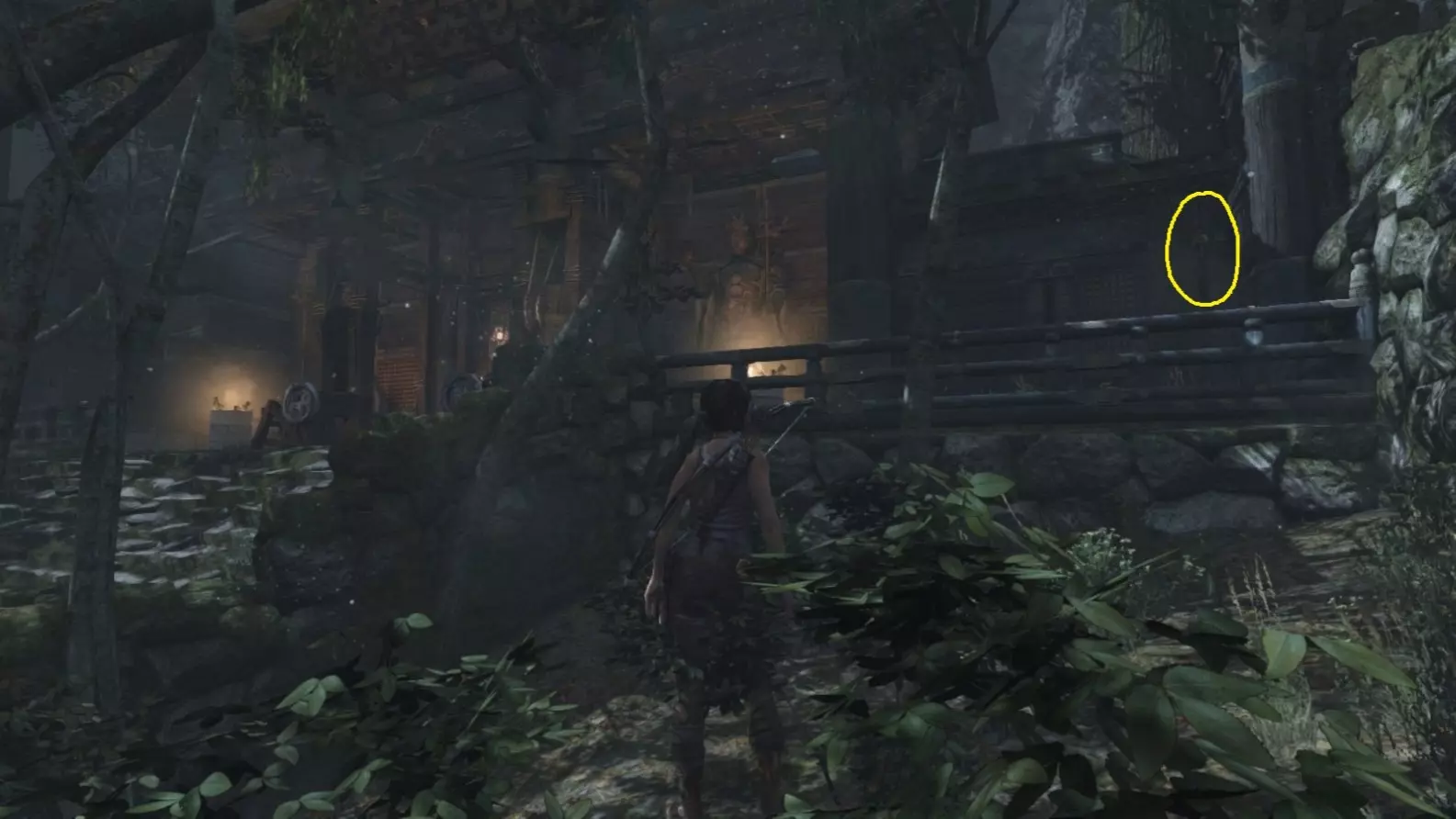 劳拉来到一座断裂的桥边。雕像位于左侧的木质结构中。截图B - 光照8/10