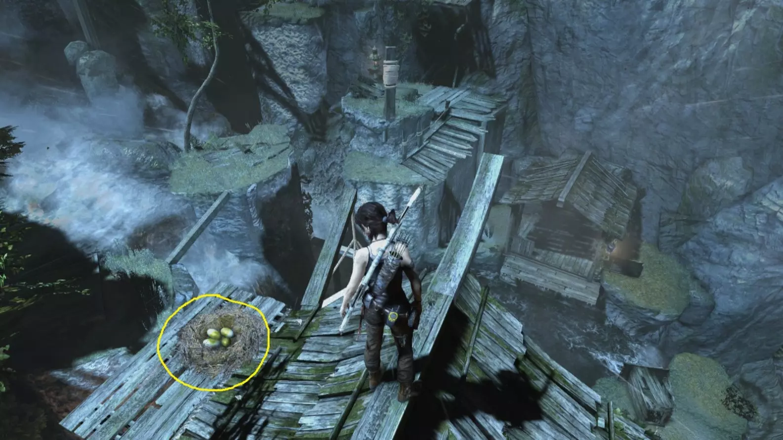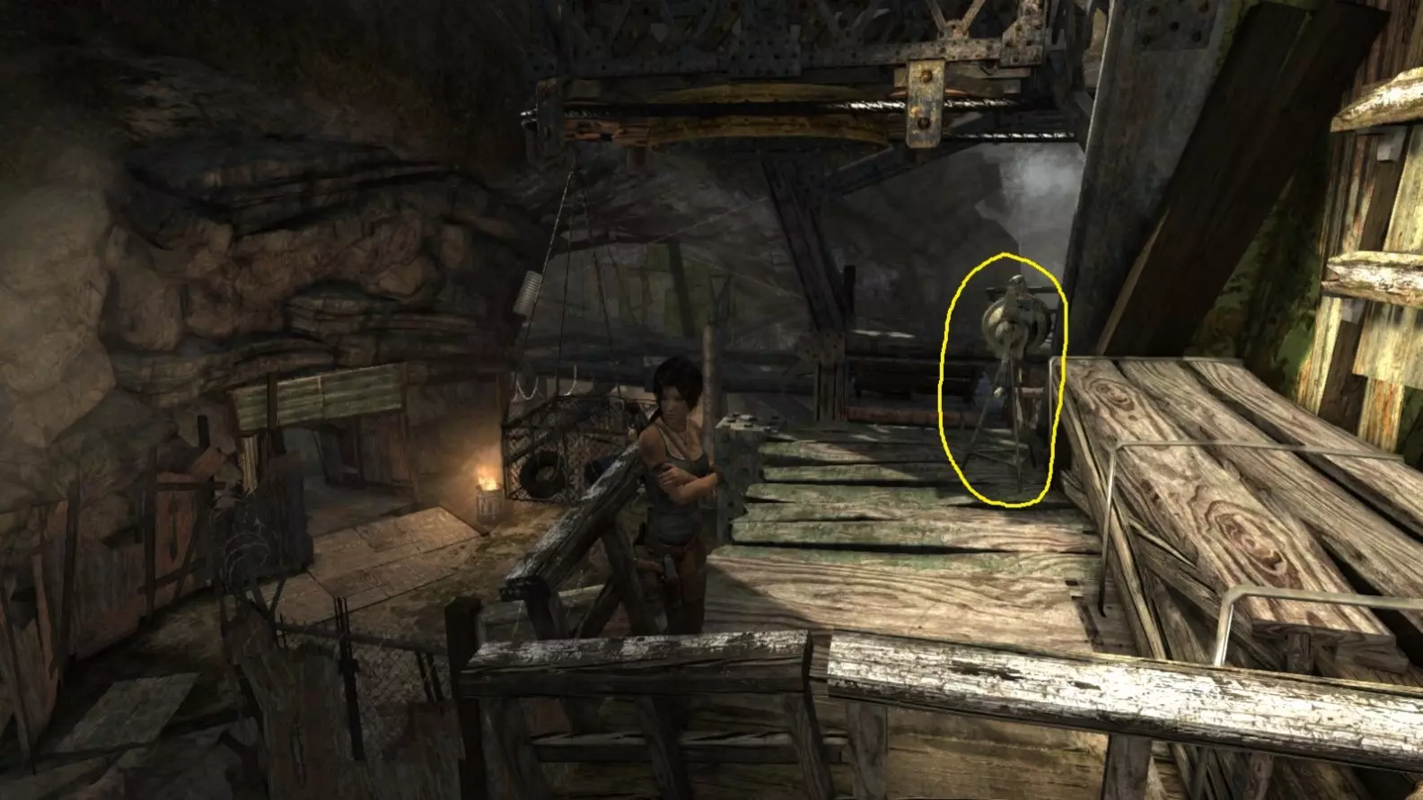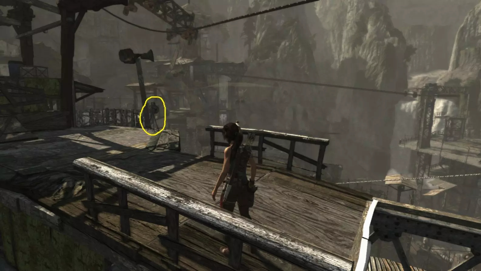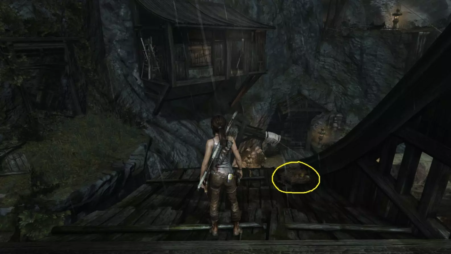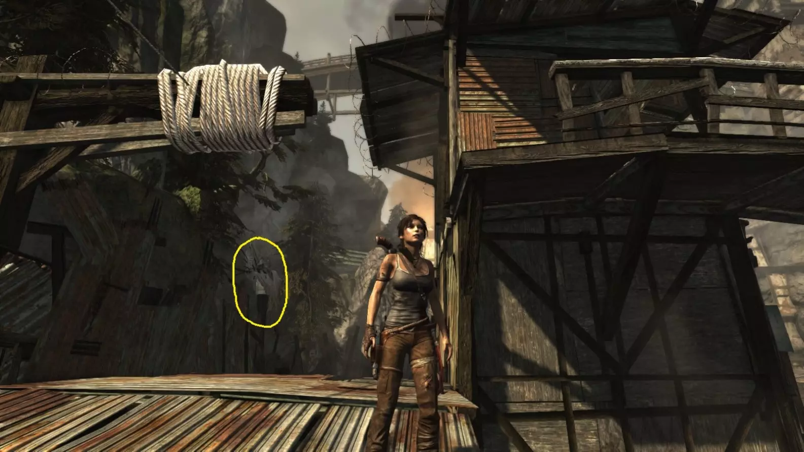 劳拉来到一座断裂的桥边。雕像位于左侧的木质结构中。截图B - 光照8/10
