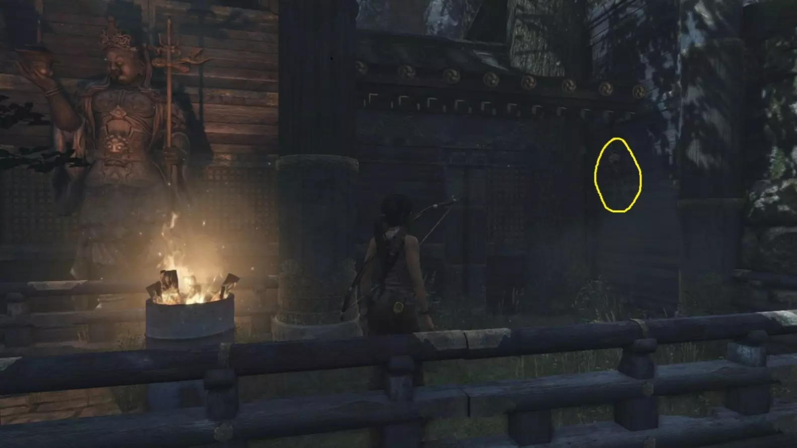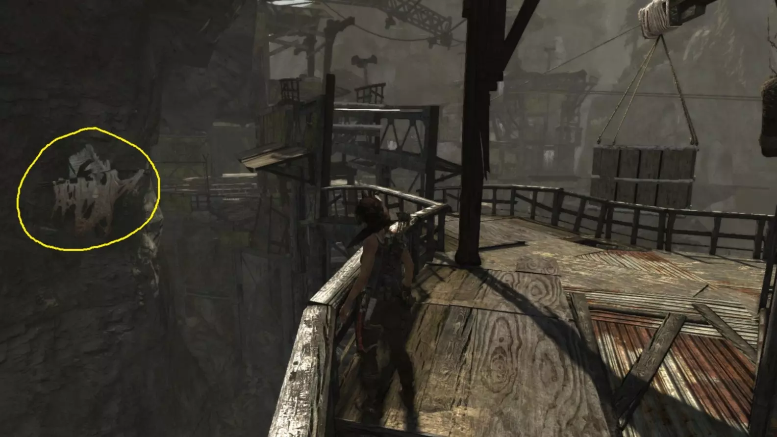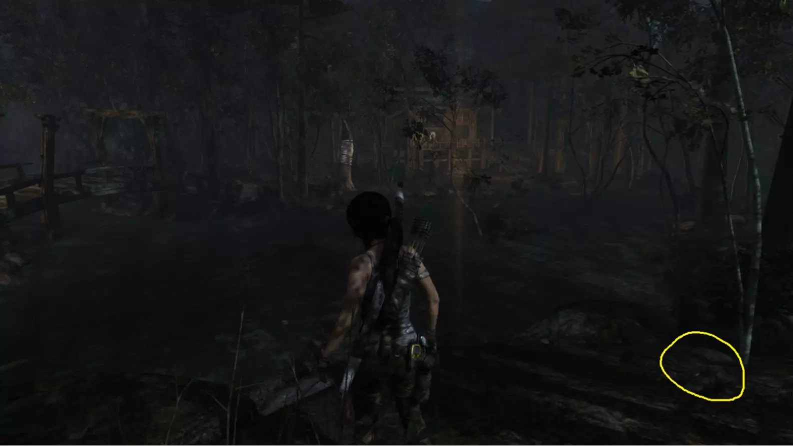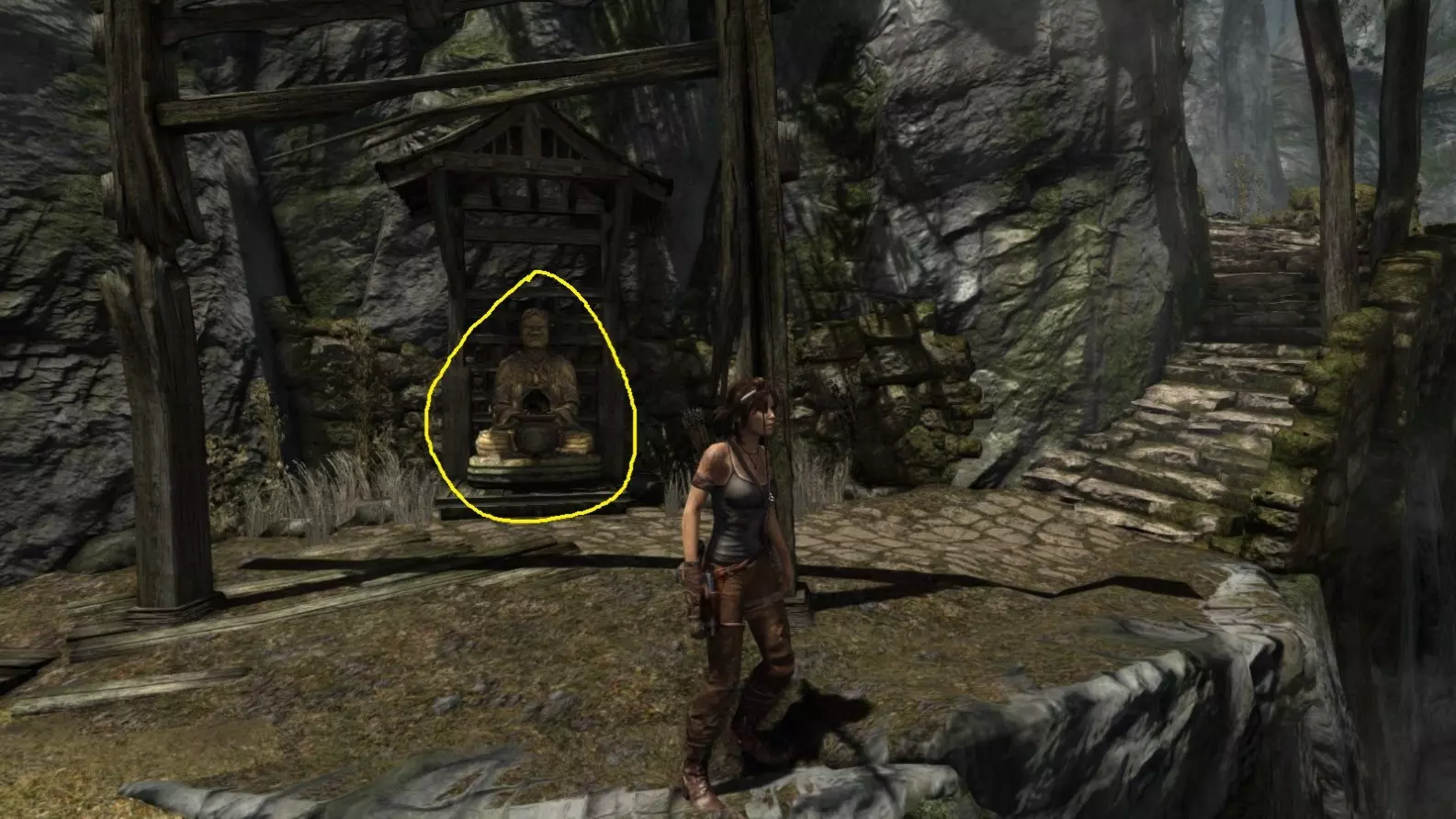 劳拉来到一座断裂的桥边。雕像位于左侧的木质结构中。截图B - 光照8/10