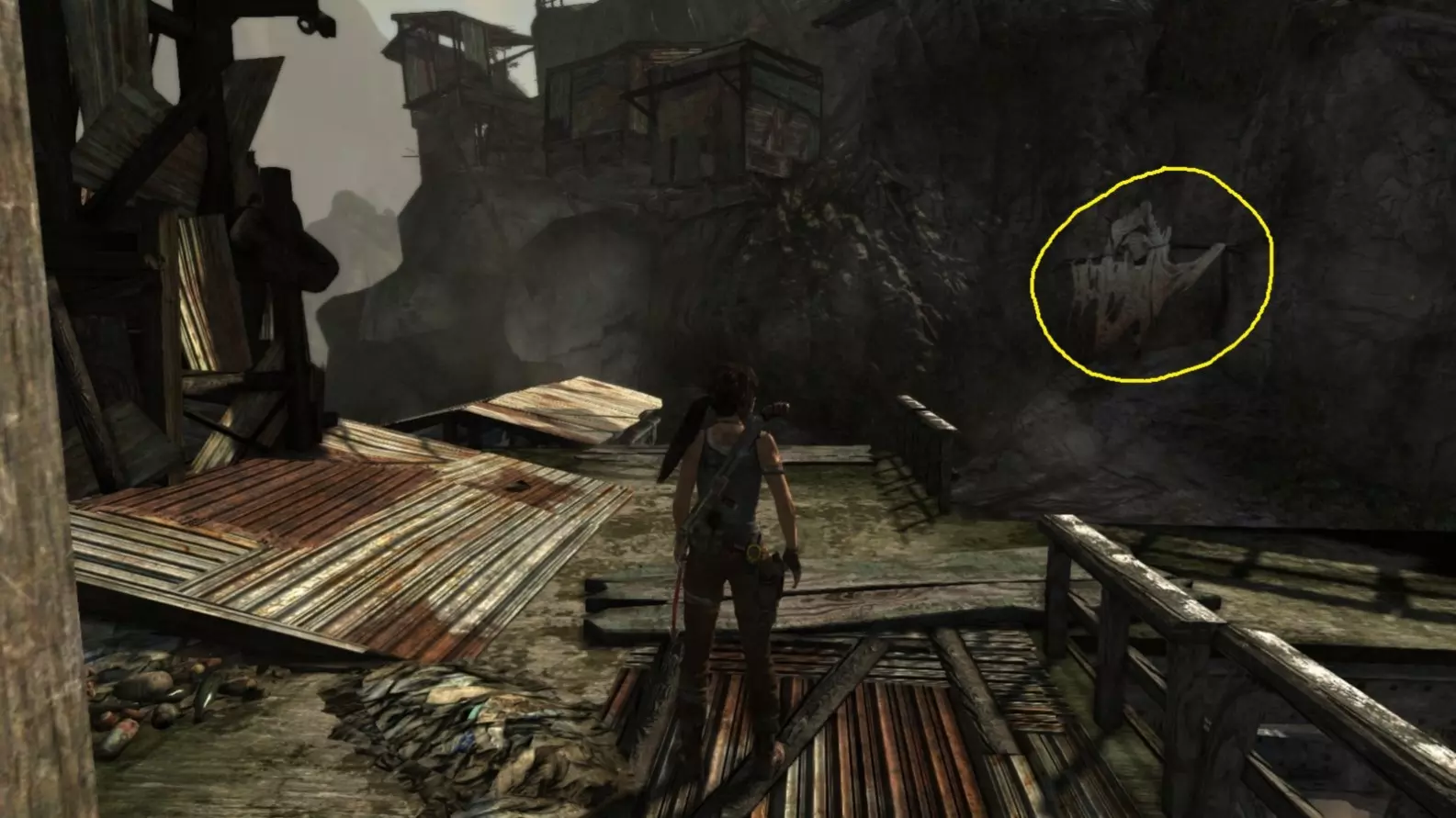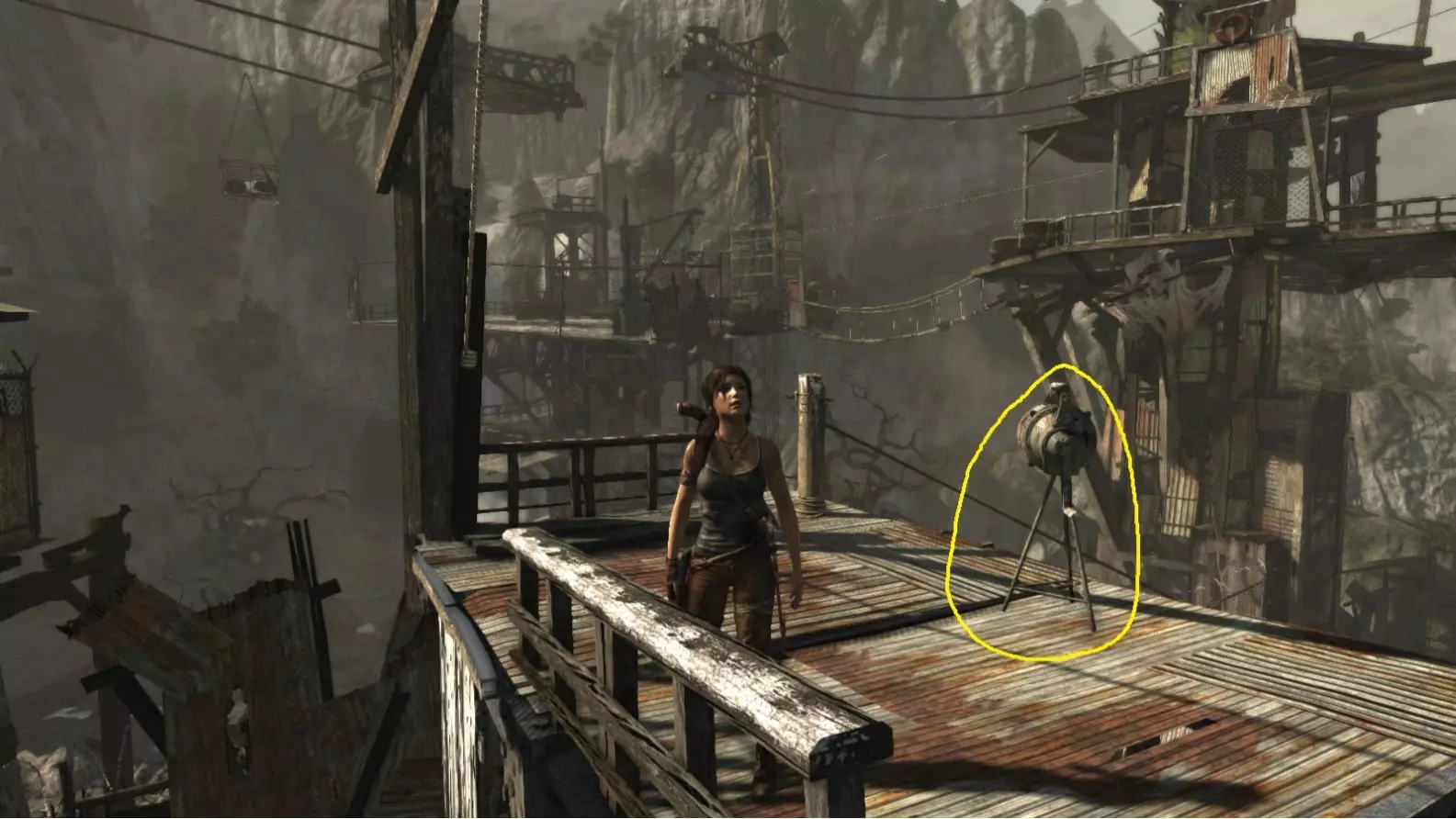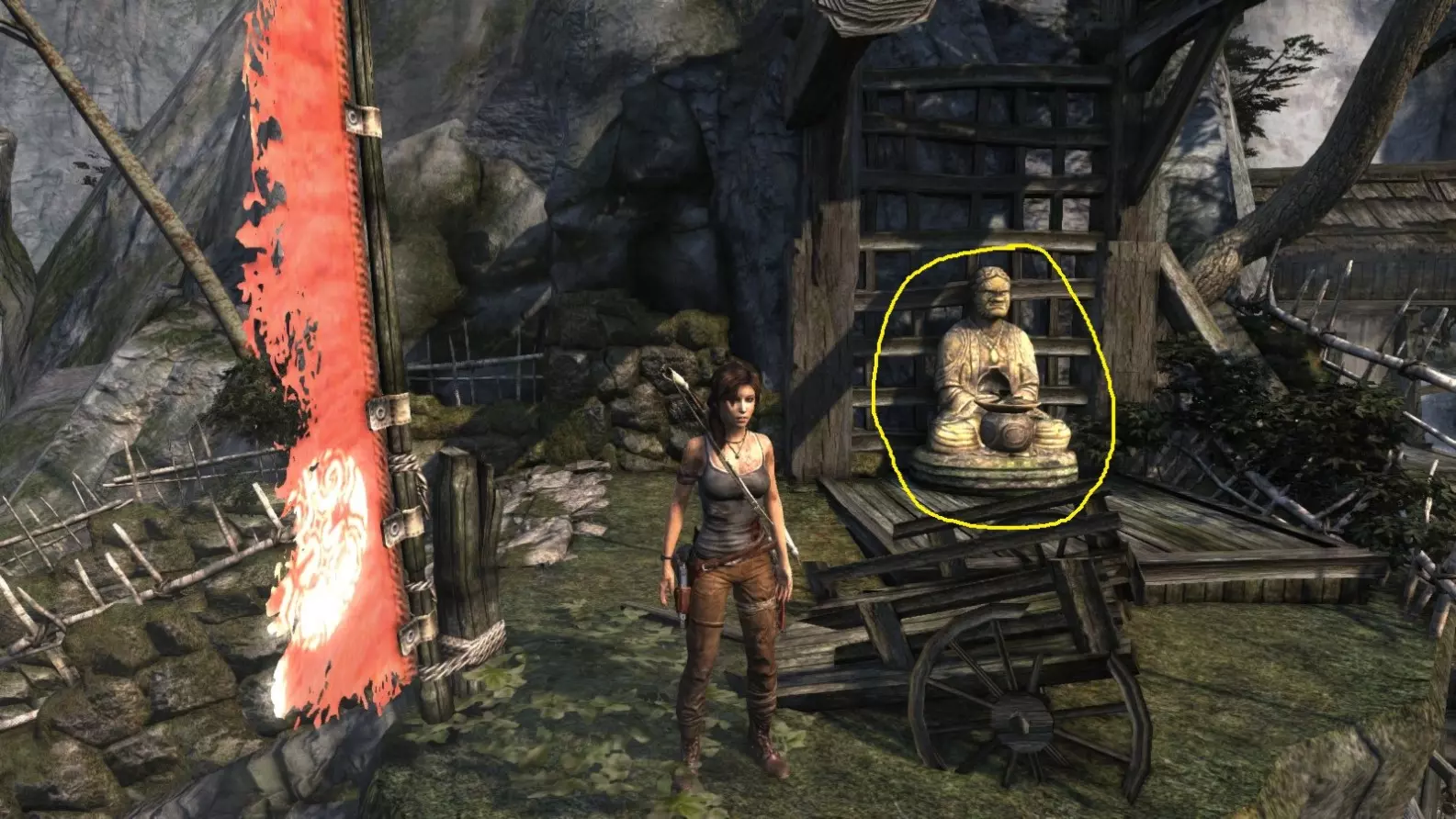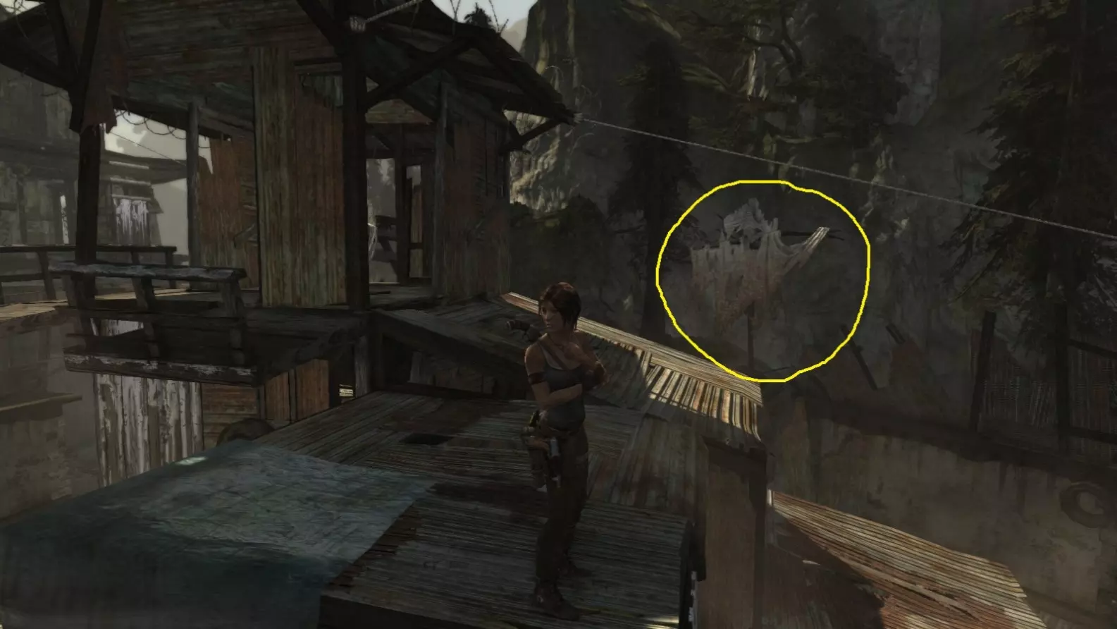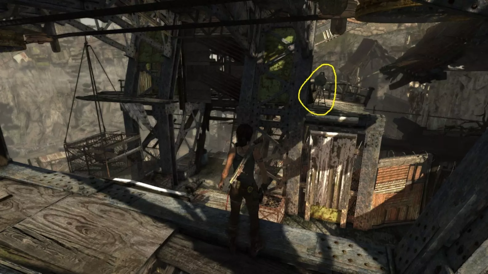 劳拉来到一座断裂的桥边。雕像位于左侧的木质结构中。截图B - 光照8/10