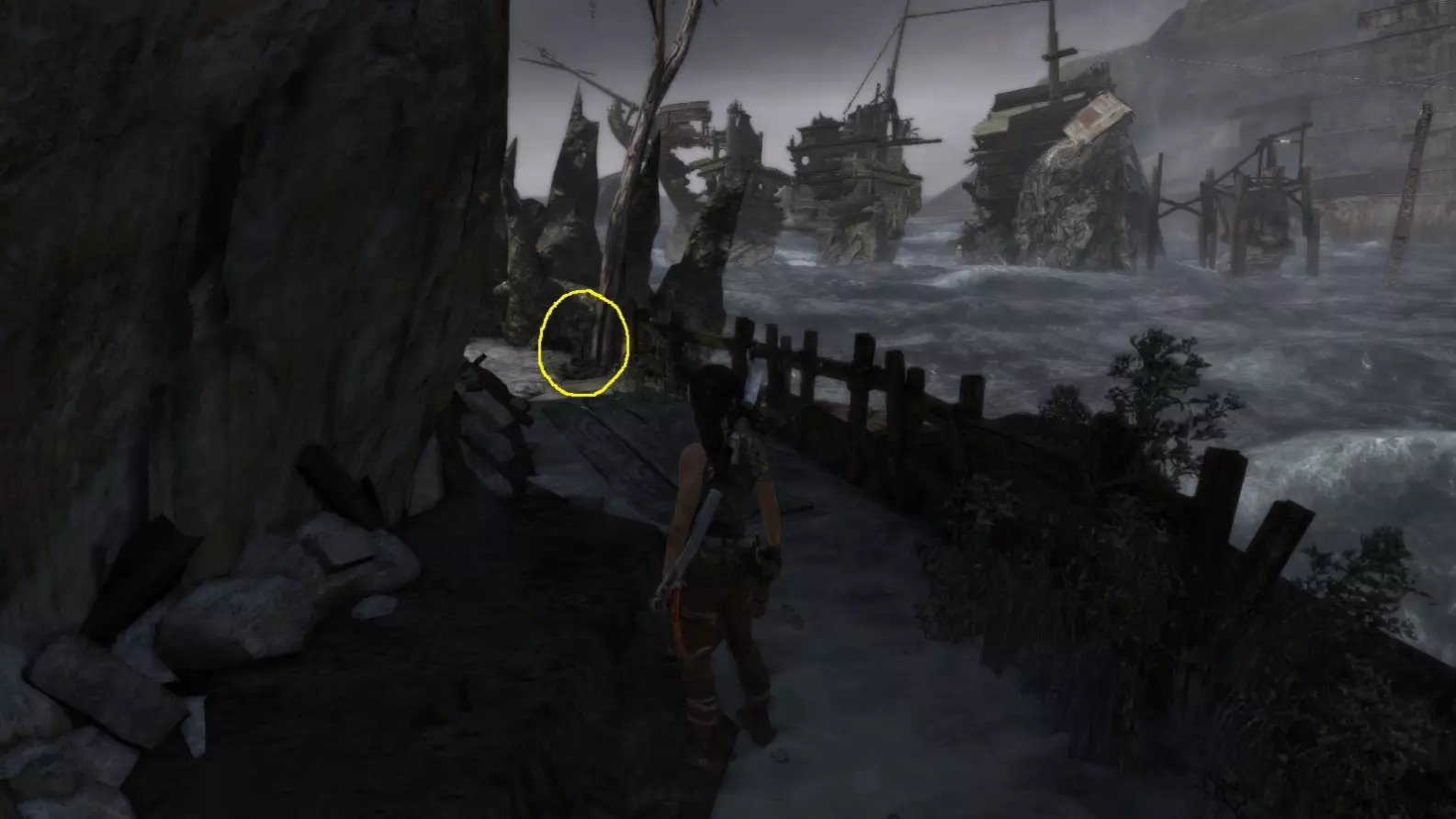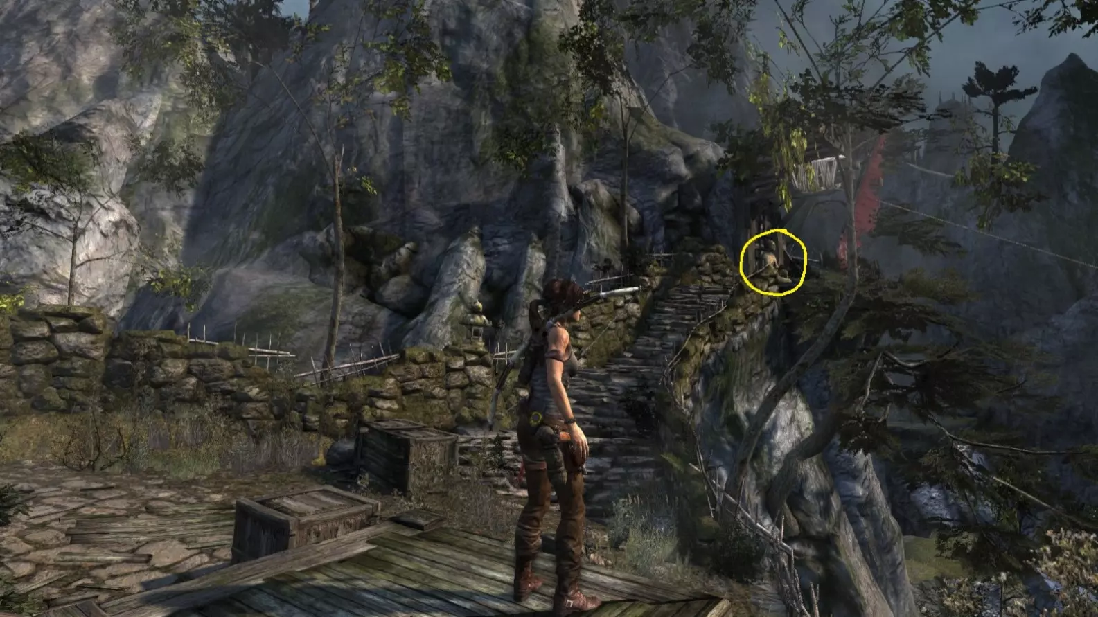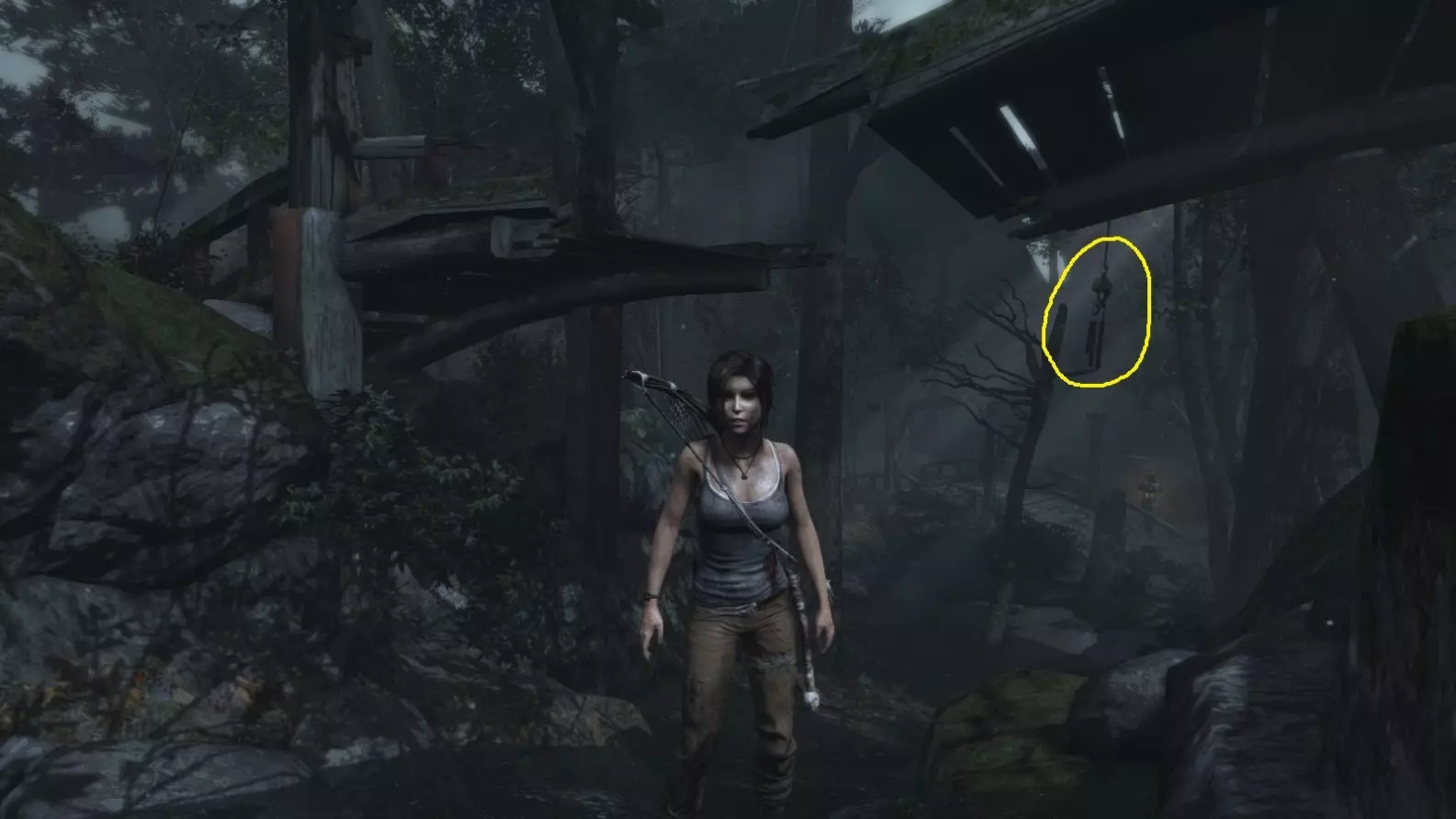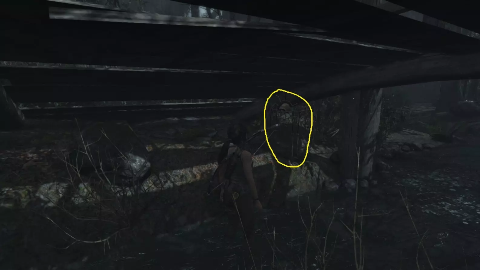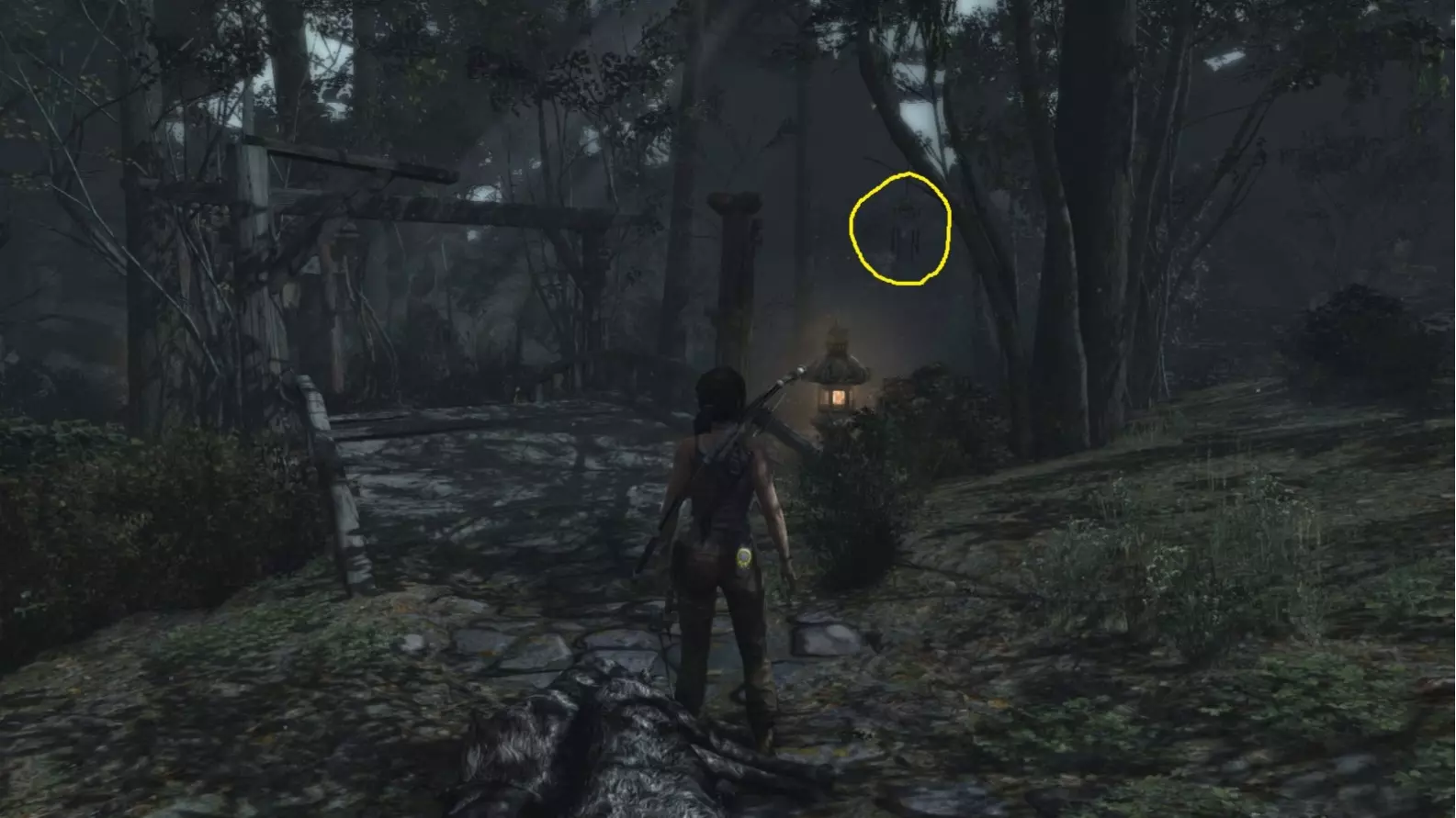 劳拉来到一座断裂的桥边。雕像位于左侧的木质结构中。截图B - 光照8/10