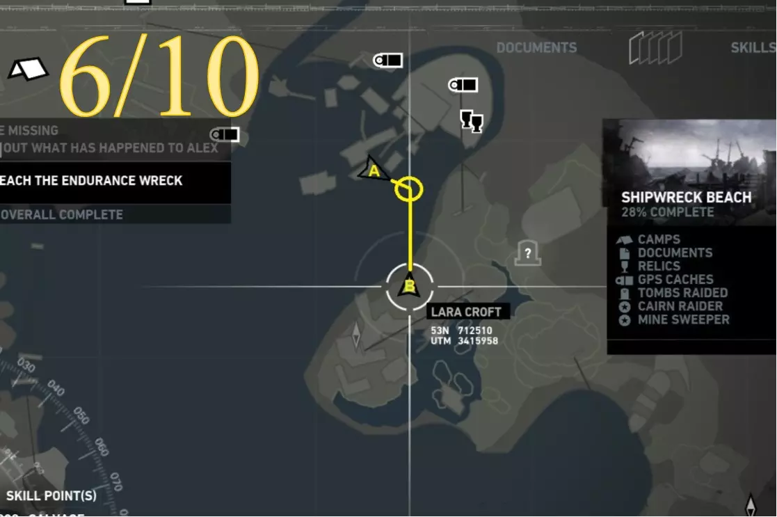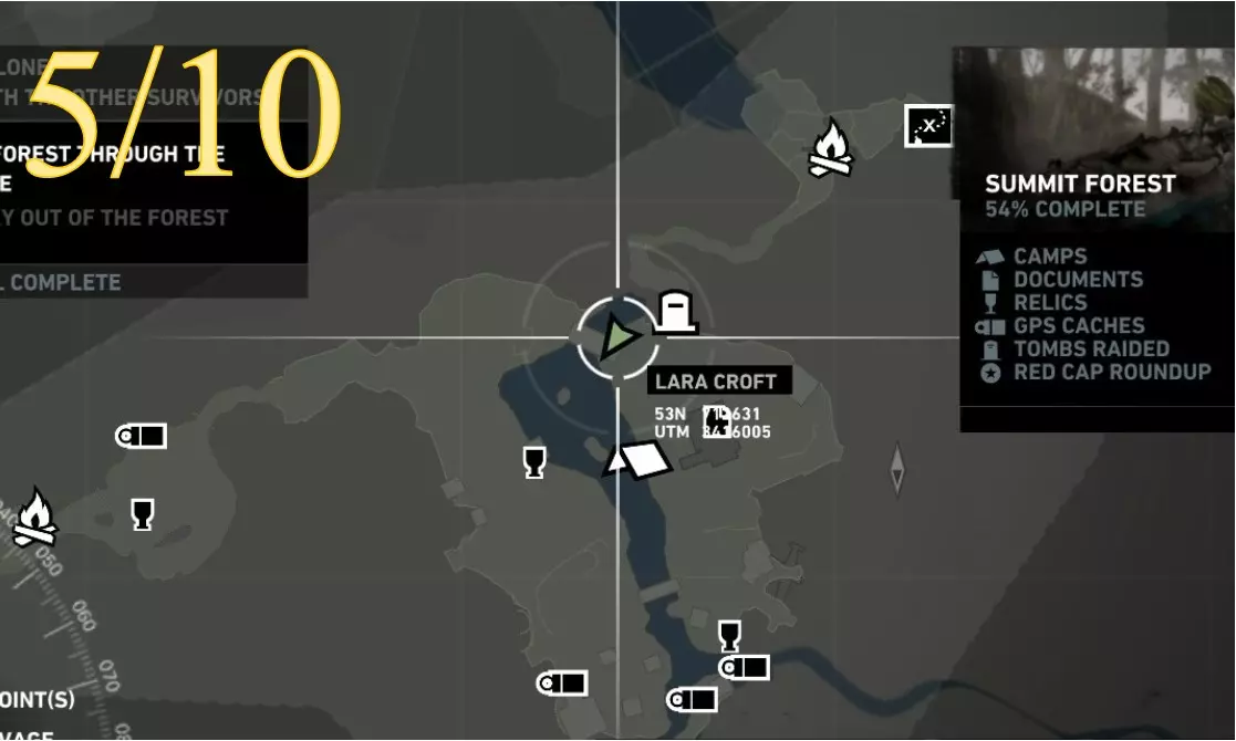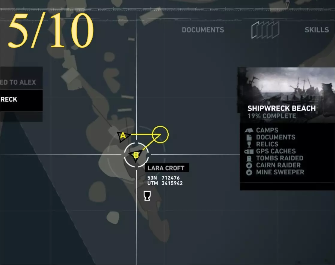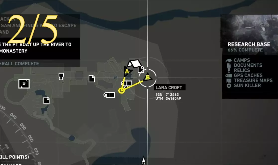 劳拉在地图A点的视角。使用生存本能模式(Q键)可以更清晰地看到目标。 截图B - 扫雷5/10
