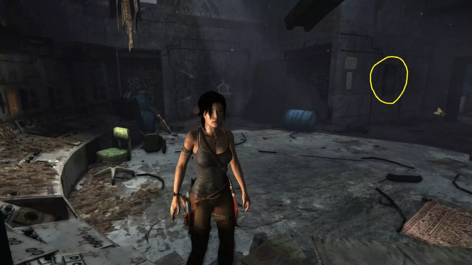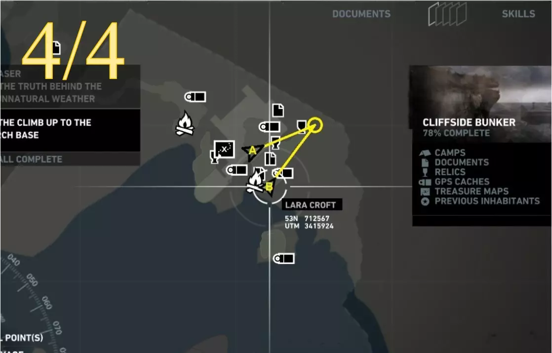 物体的位置由黄色圆圈表示。箭头A和B分别代表截图A和截图B中劳拉的位置。 截图A - Previous Inhabitants 4/4