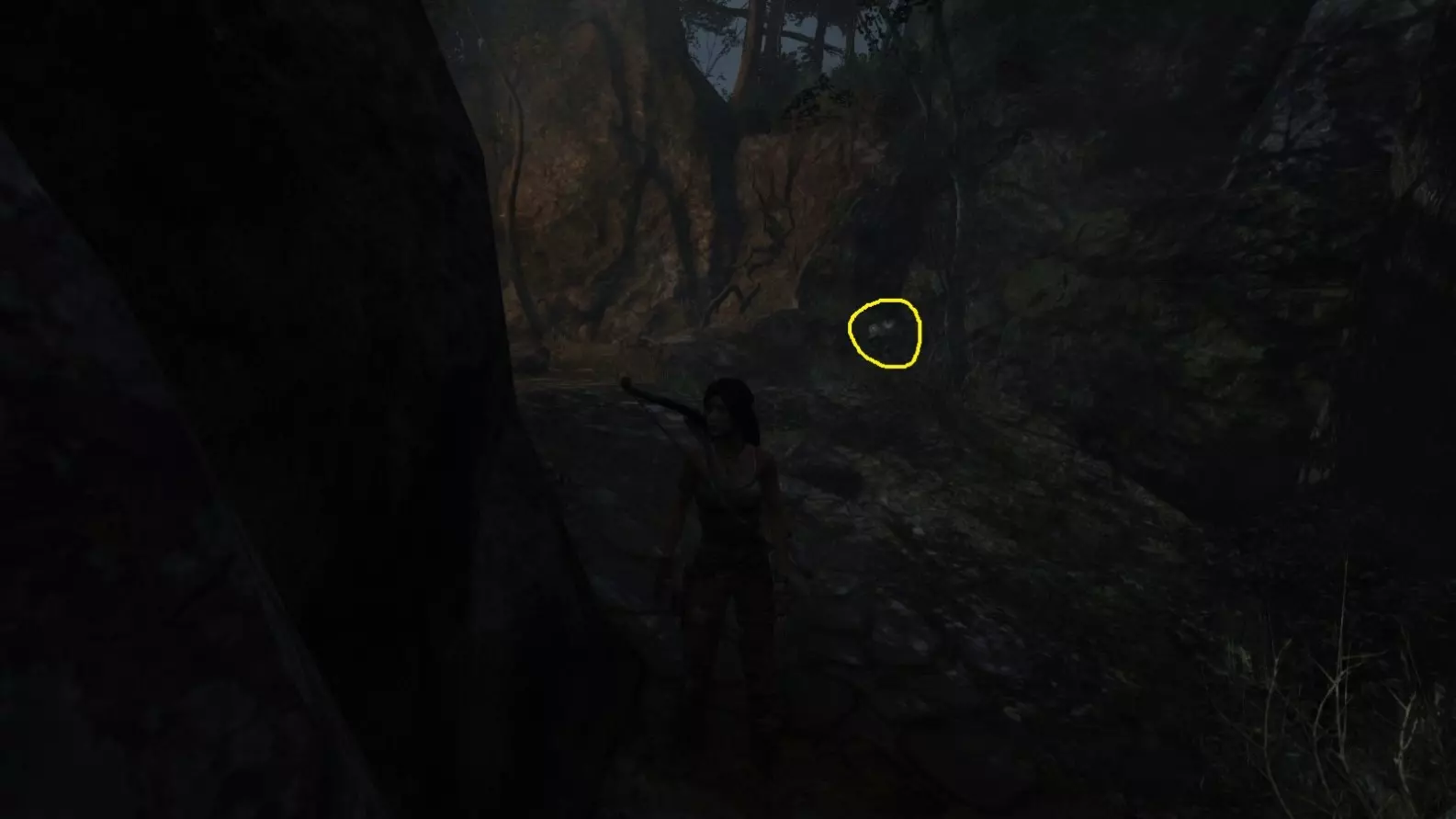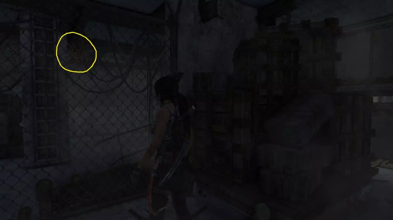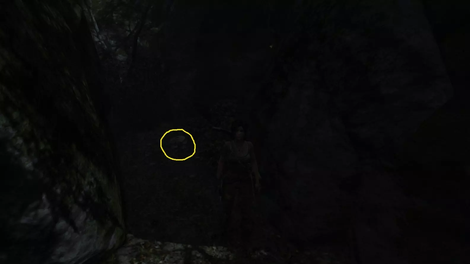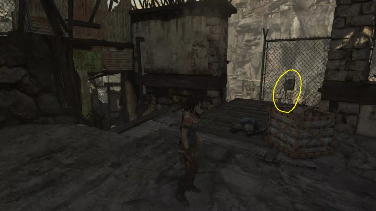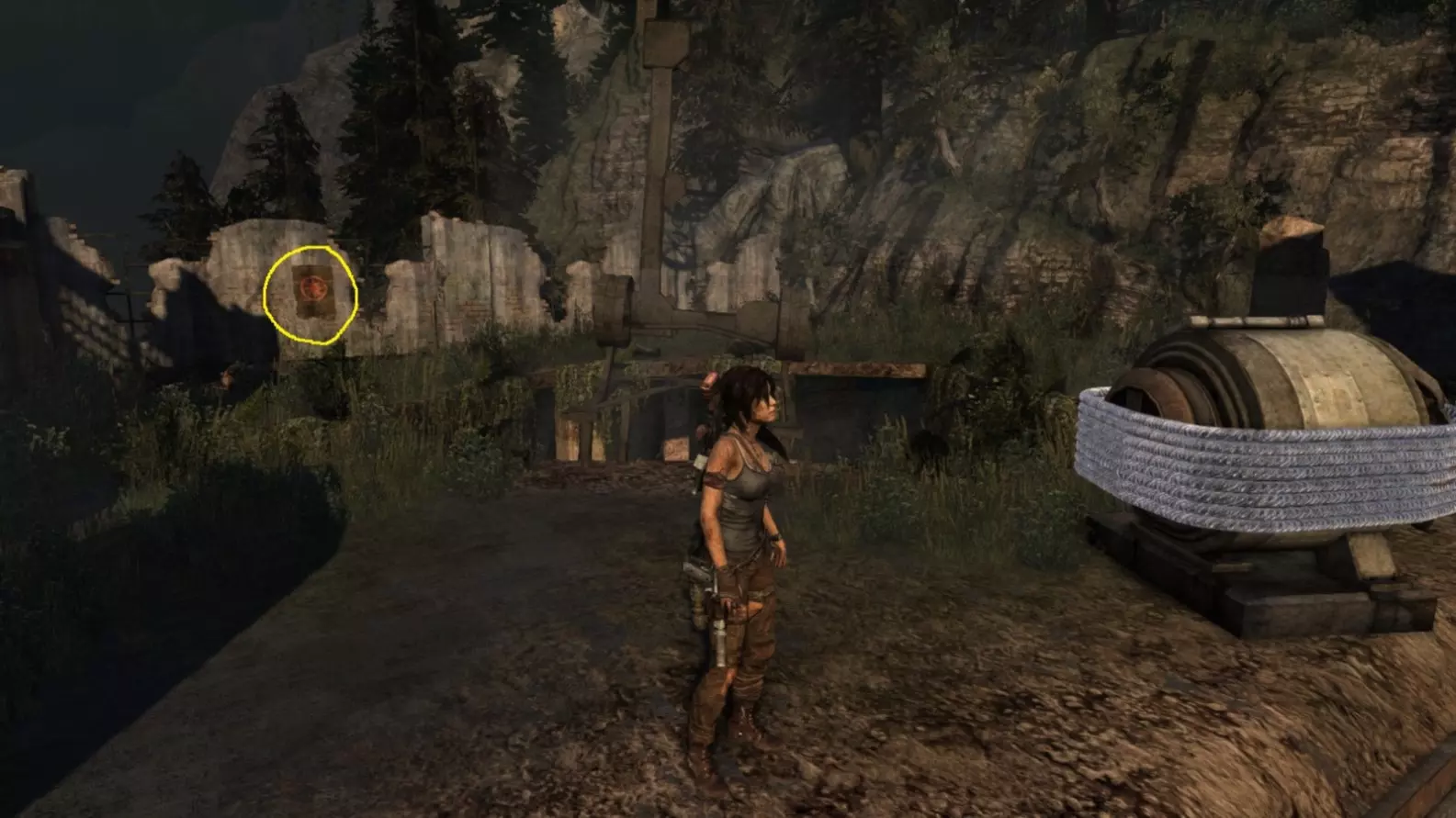劳拉在地图B点的视角。使用生存本能模式(Q键)可以更清晰地看到目标。注意:你可能会发现很难瞄准这个地雷。瞄准武器时,按下“切换肩视角”键(默认是C键),劳拉就能清晰地看到地雷了。