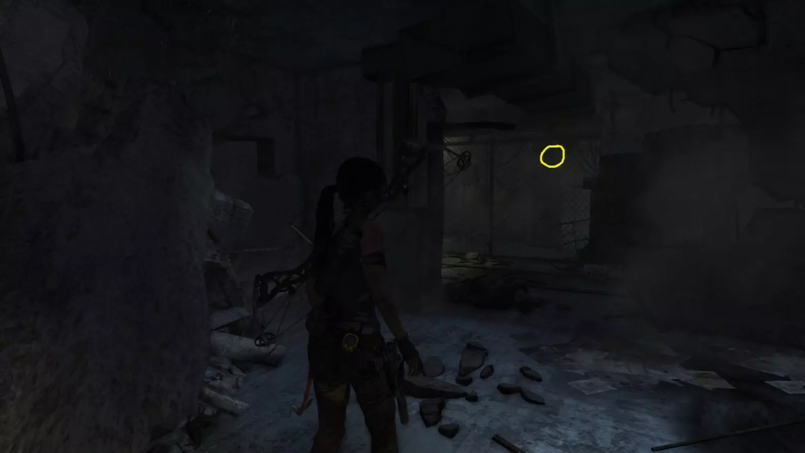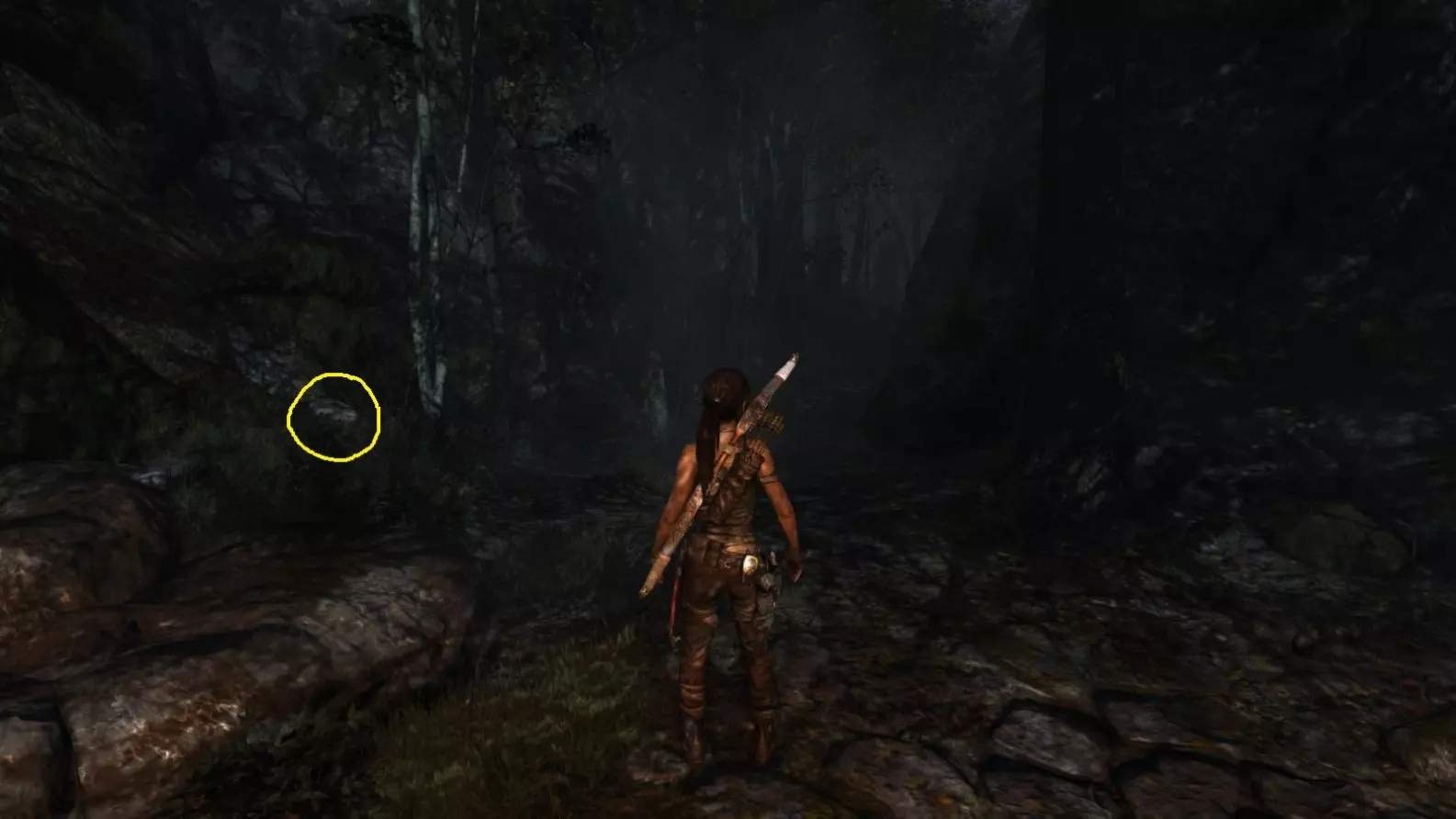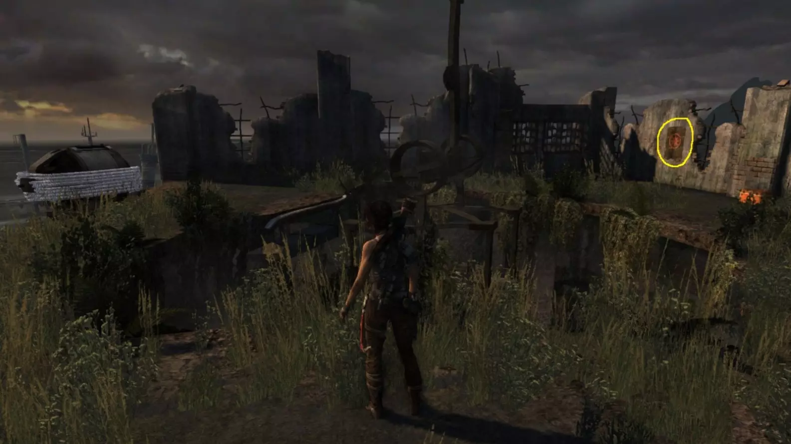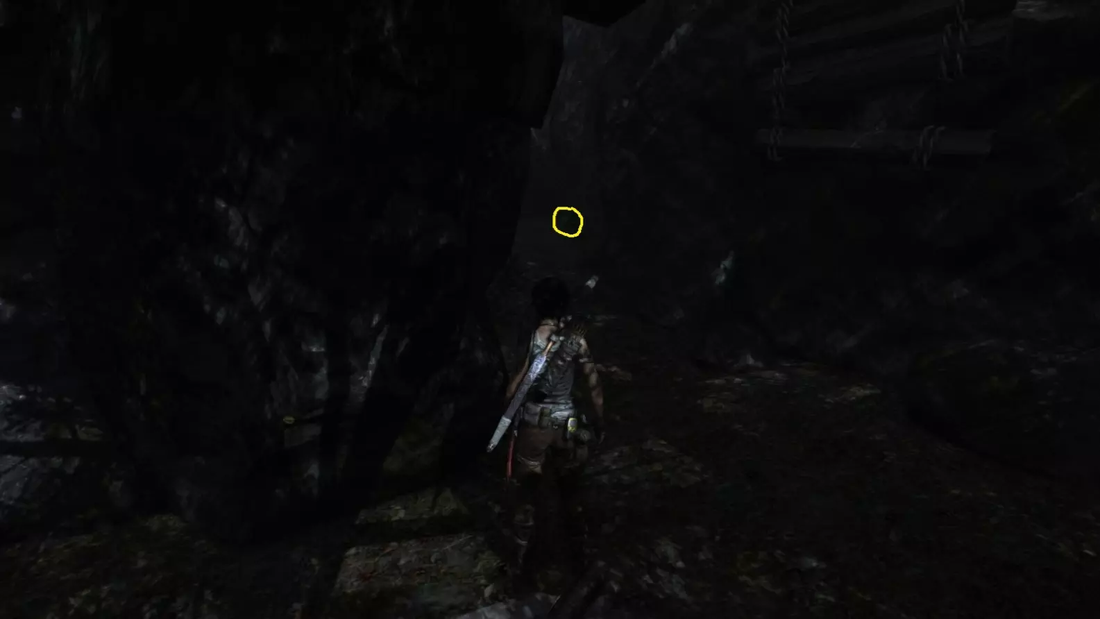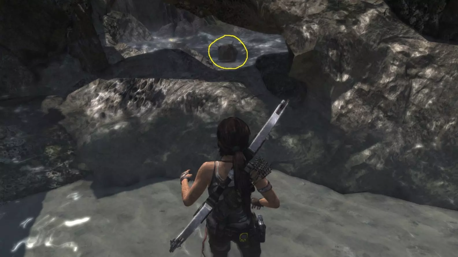 劳拉在地图B点的视角。使用生存本能模式(Q键)可以更清晰地看到目标。注意:你可能会发现很难瞄准这个地雷。瞄准武器时,按下“切换肩视角”键(默认是C键),劳拉就能清晰地看到地雷了。