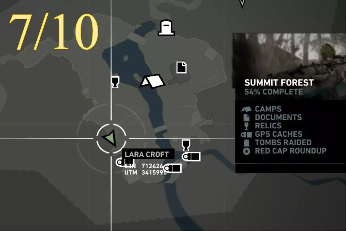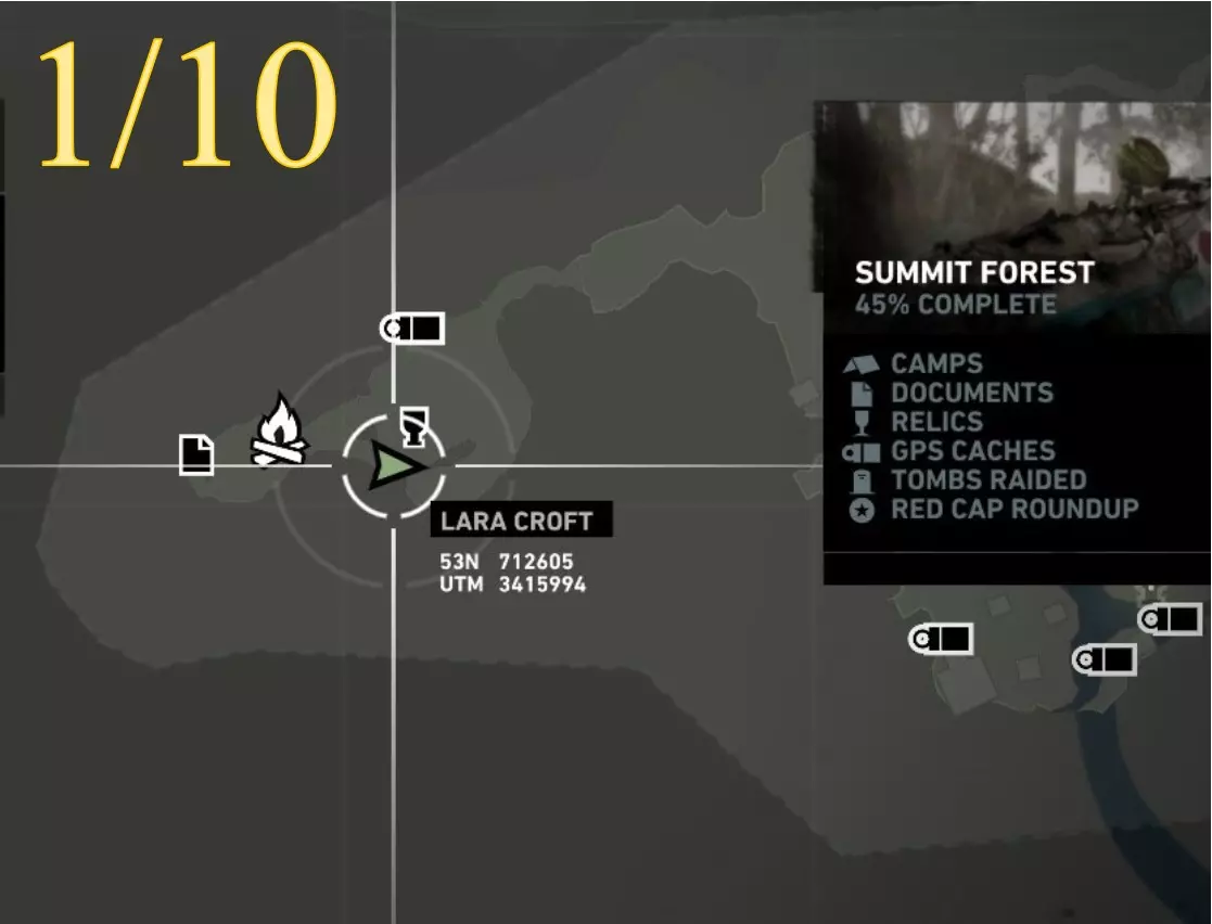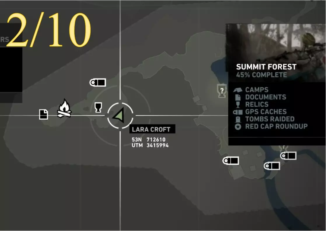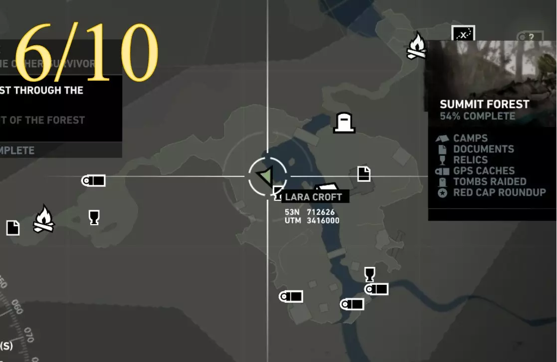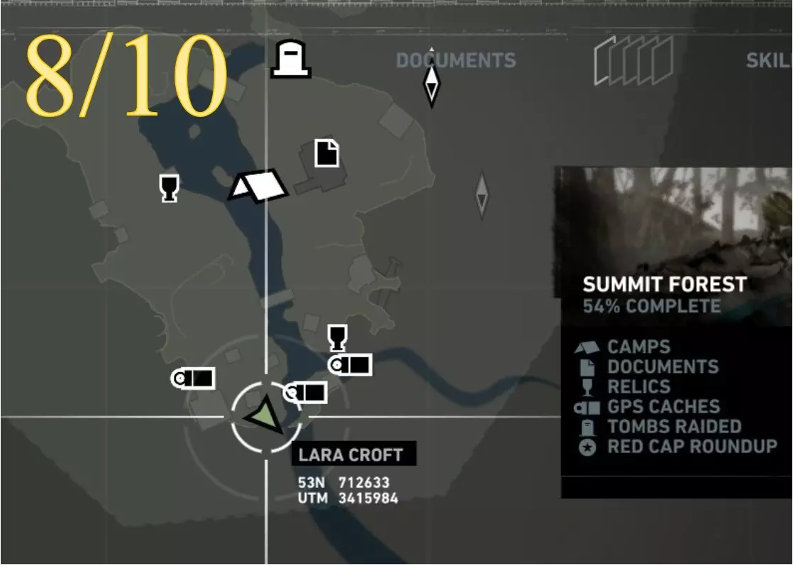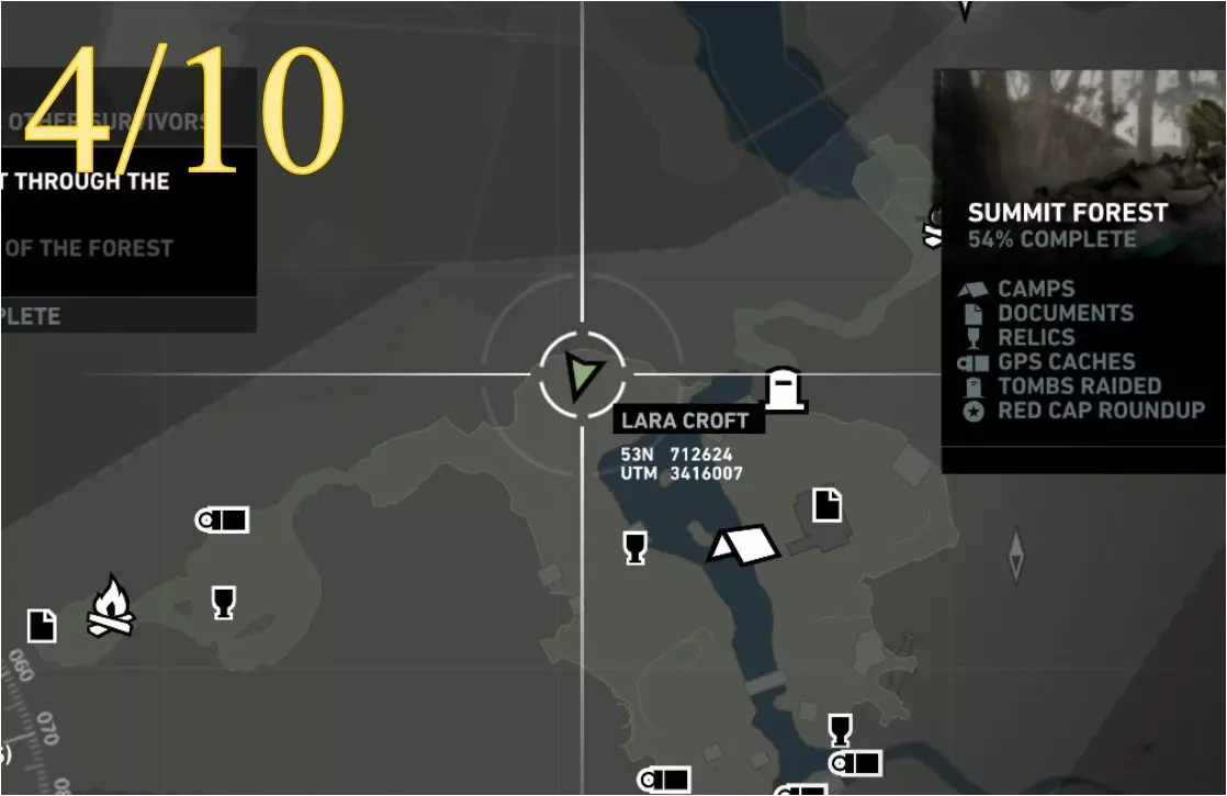 在生存本能模式(Q)下可见。劳拉正非常接近该关卡的营地。