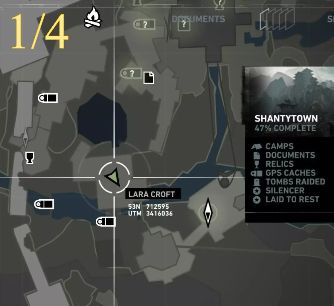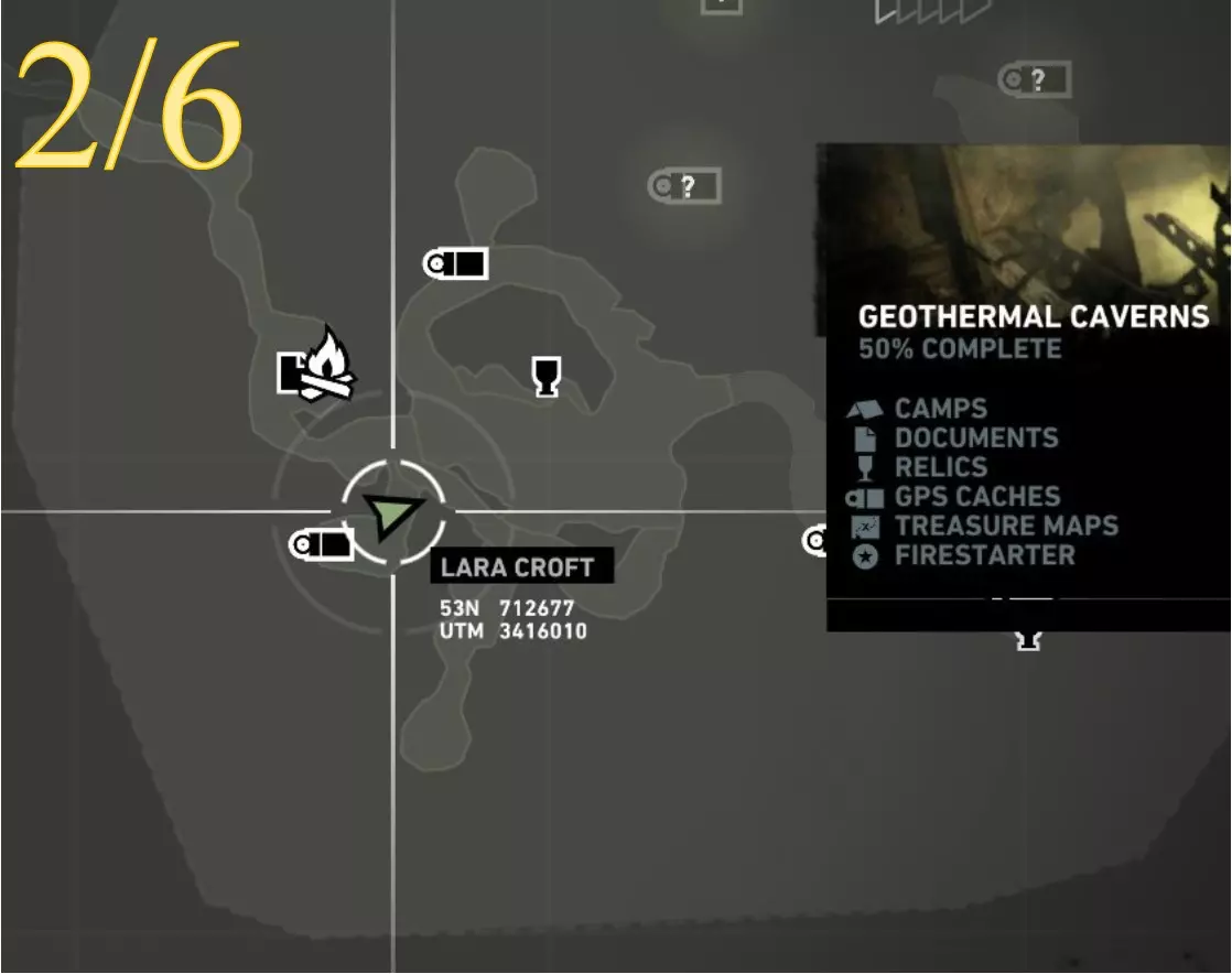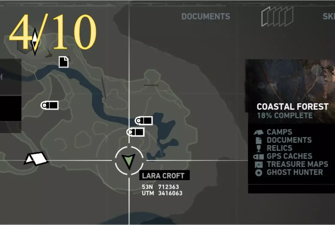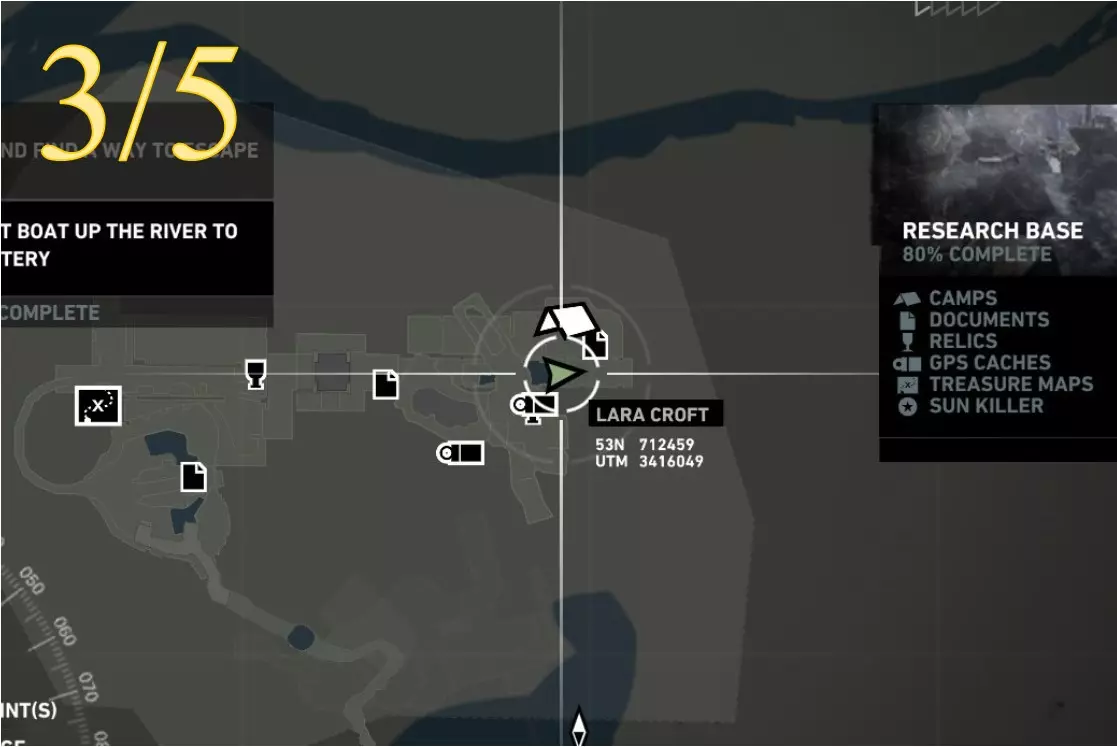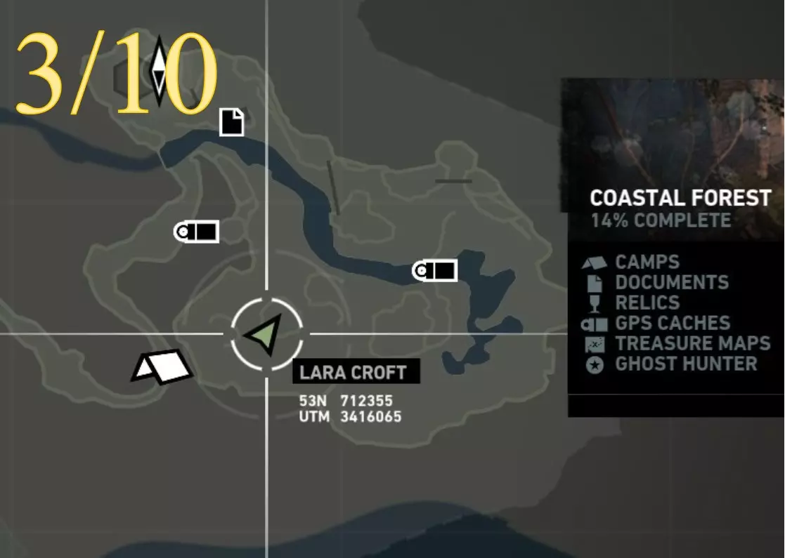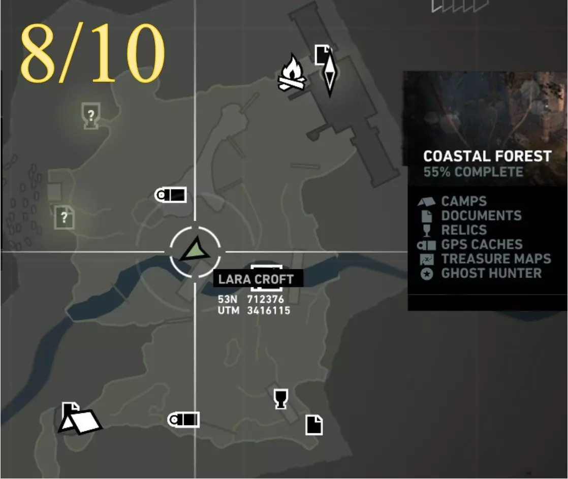 在生存本能模式(Q)下可见。劳拉正非常接近该关卡的营地。