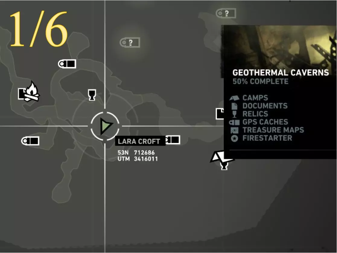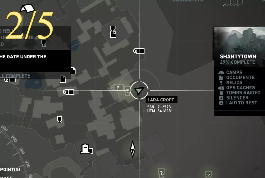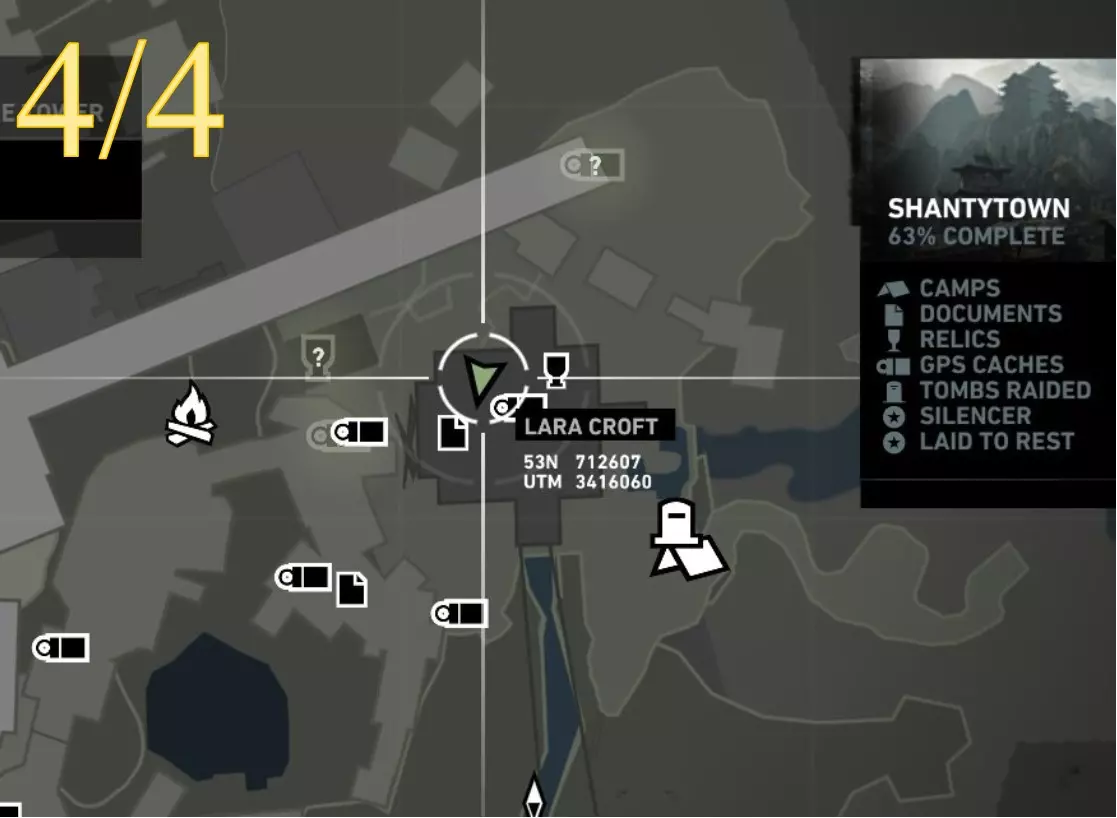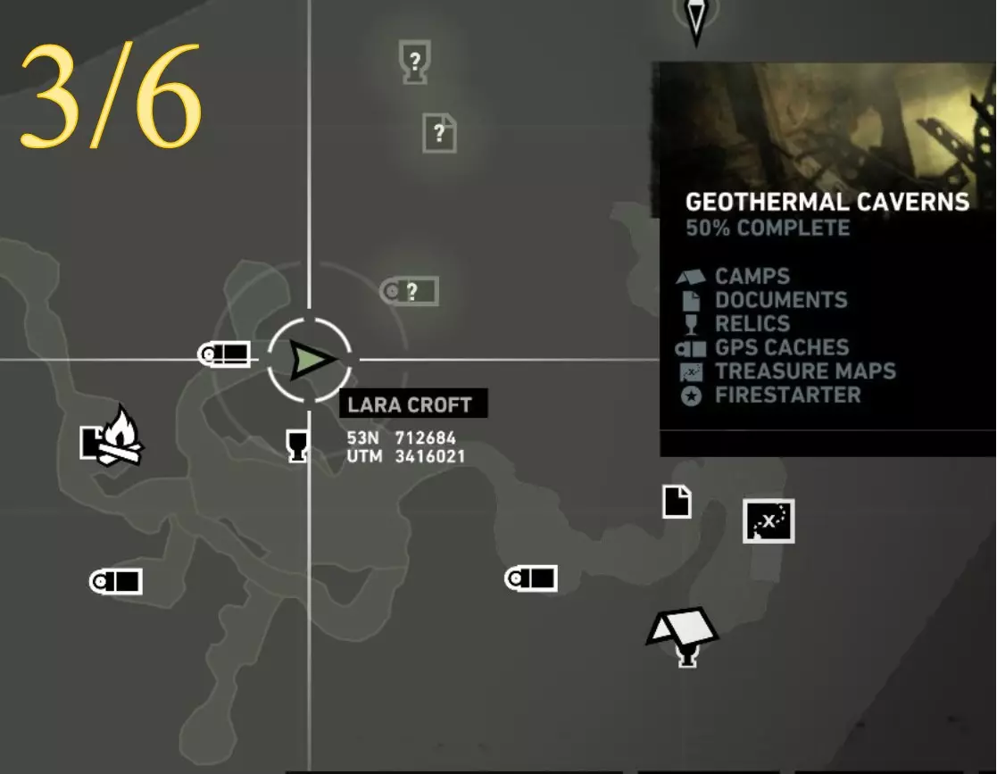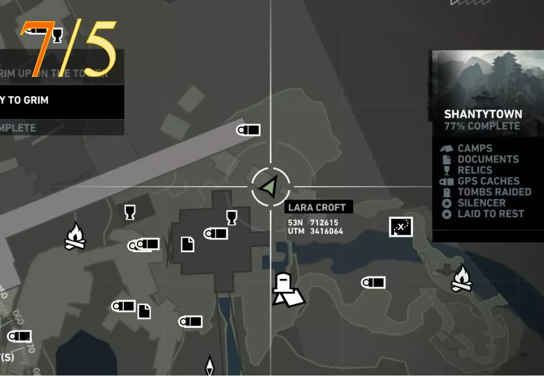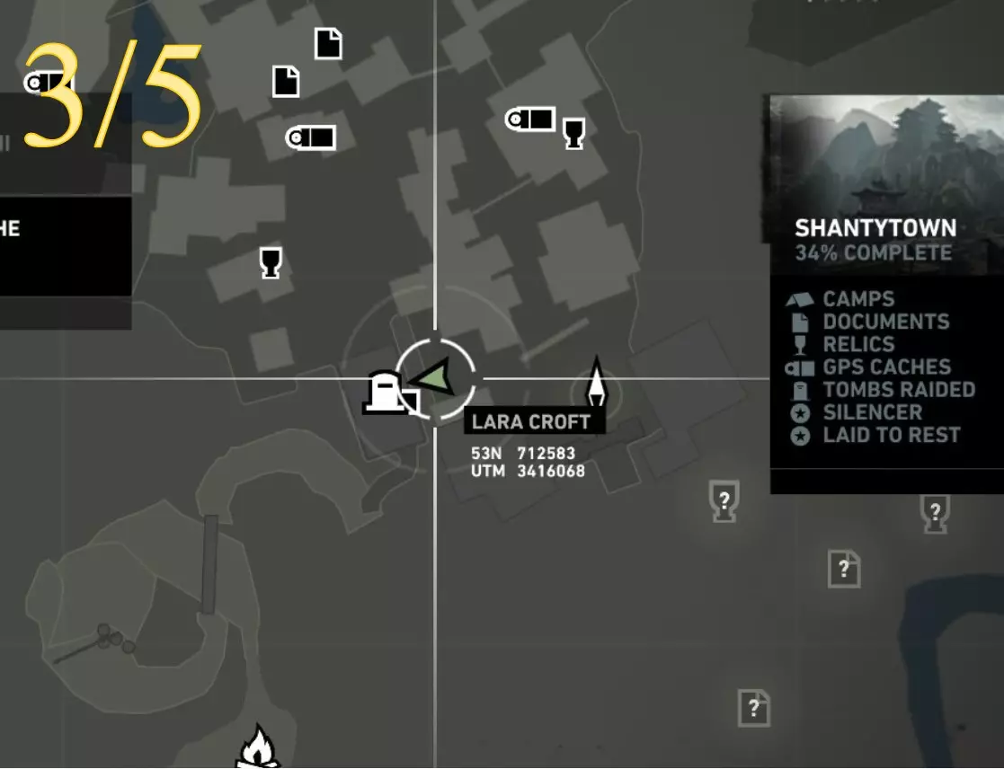 在生存本能模式(Q)下可见。劳拉正非常接近该关卡的营地。