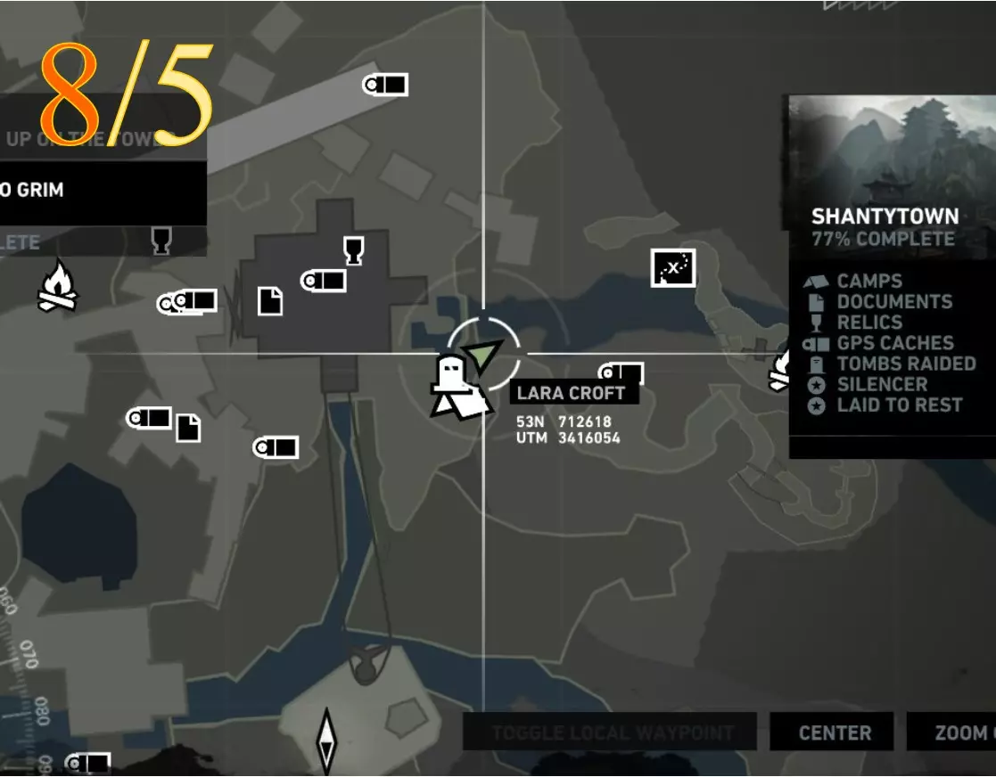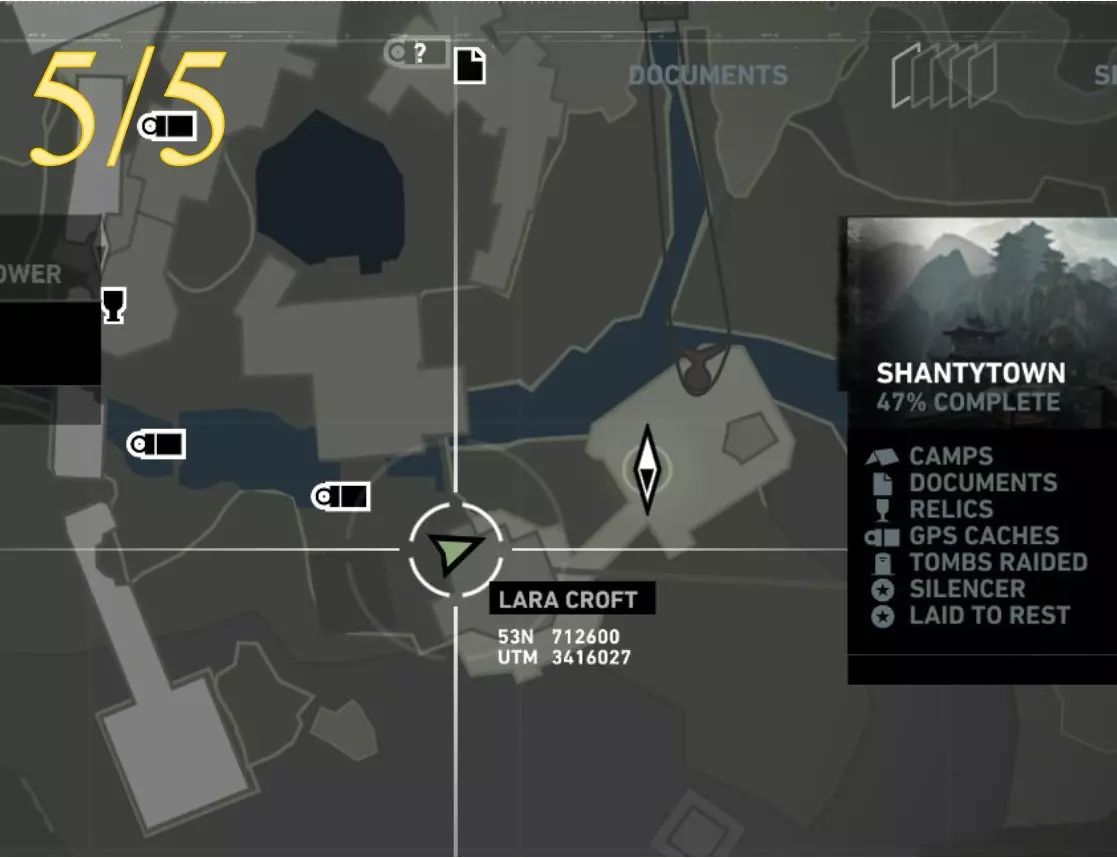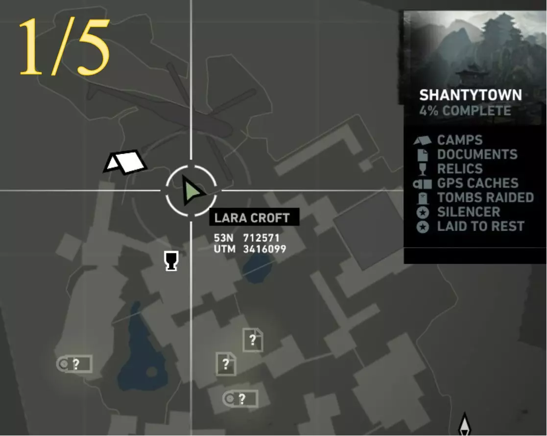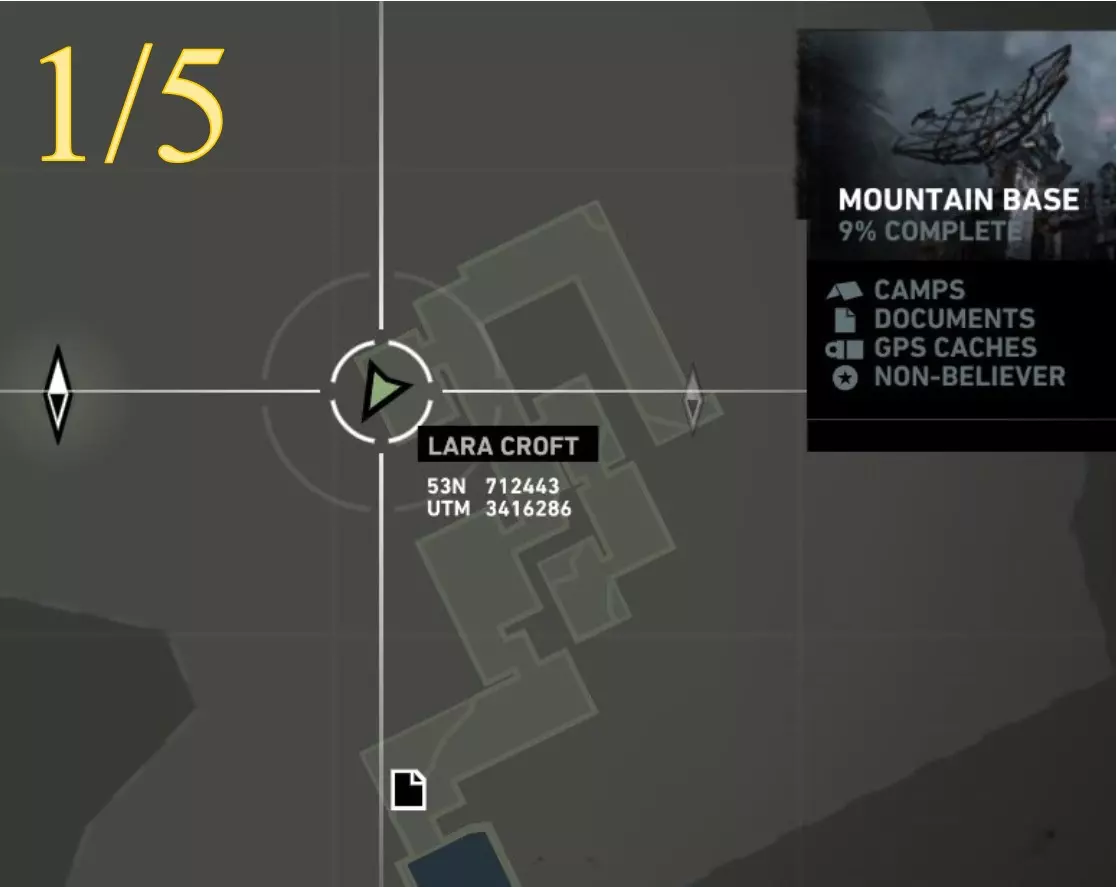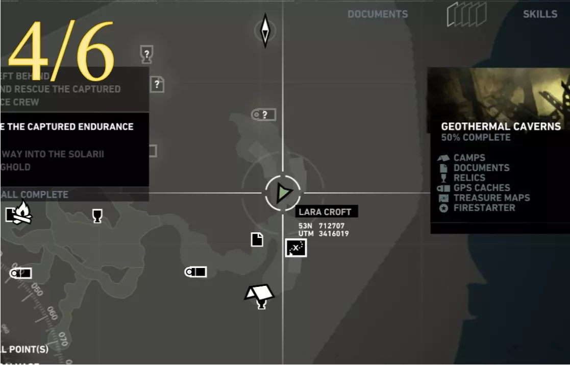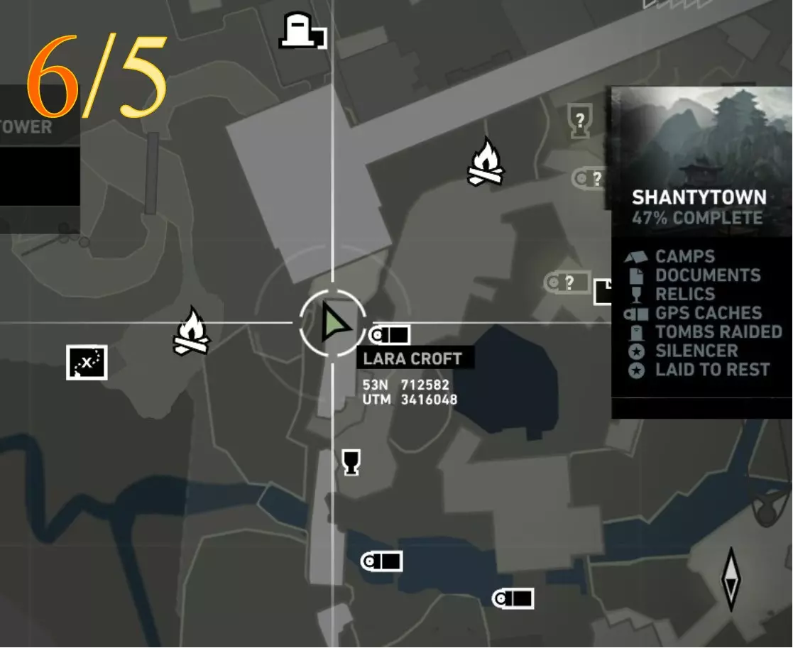 在生存本能模式(Q)下可见。劳拉正非常接近该关卡的营地。