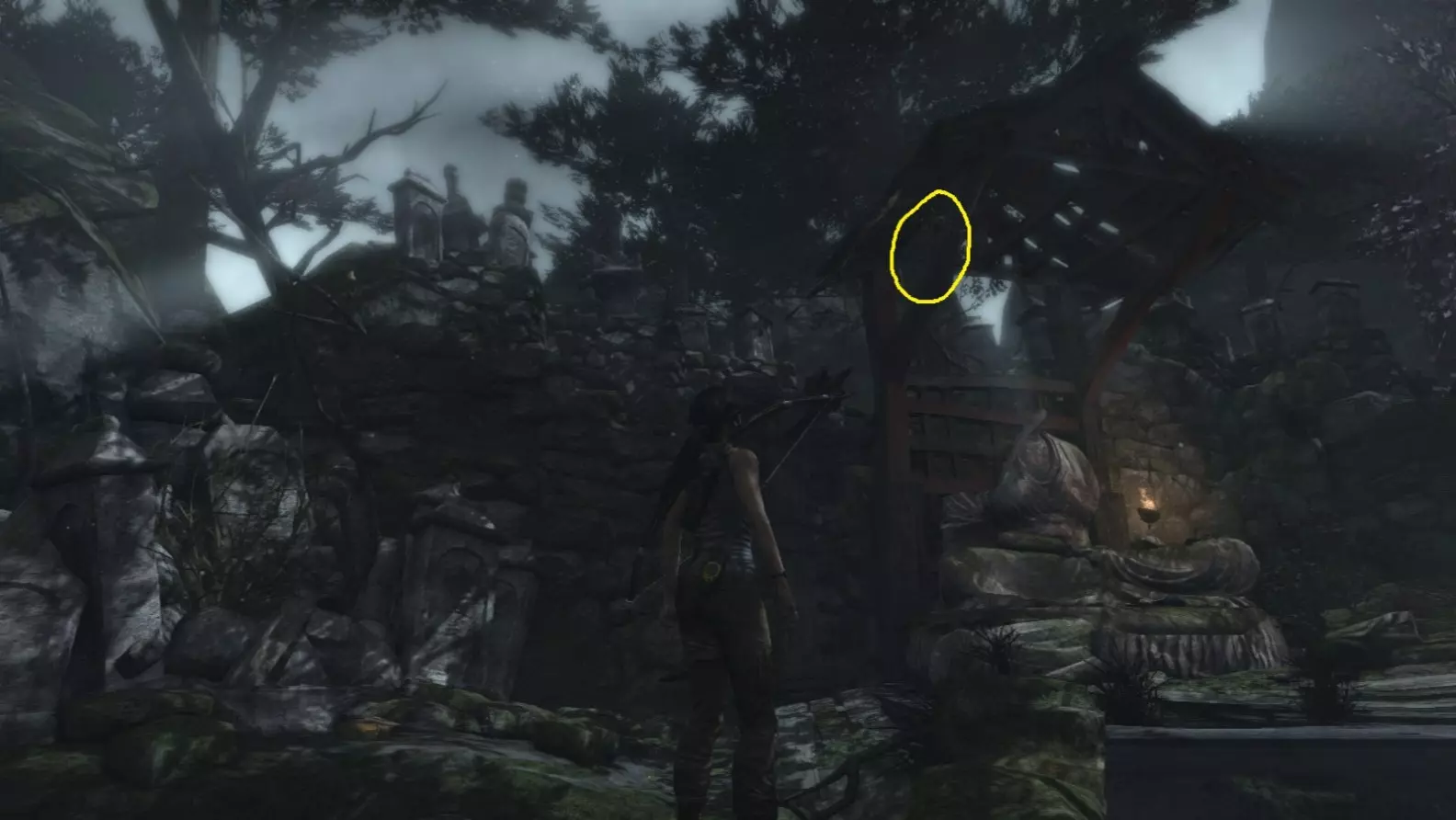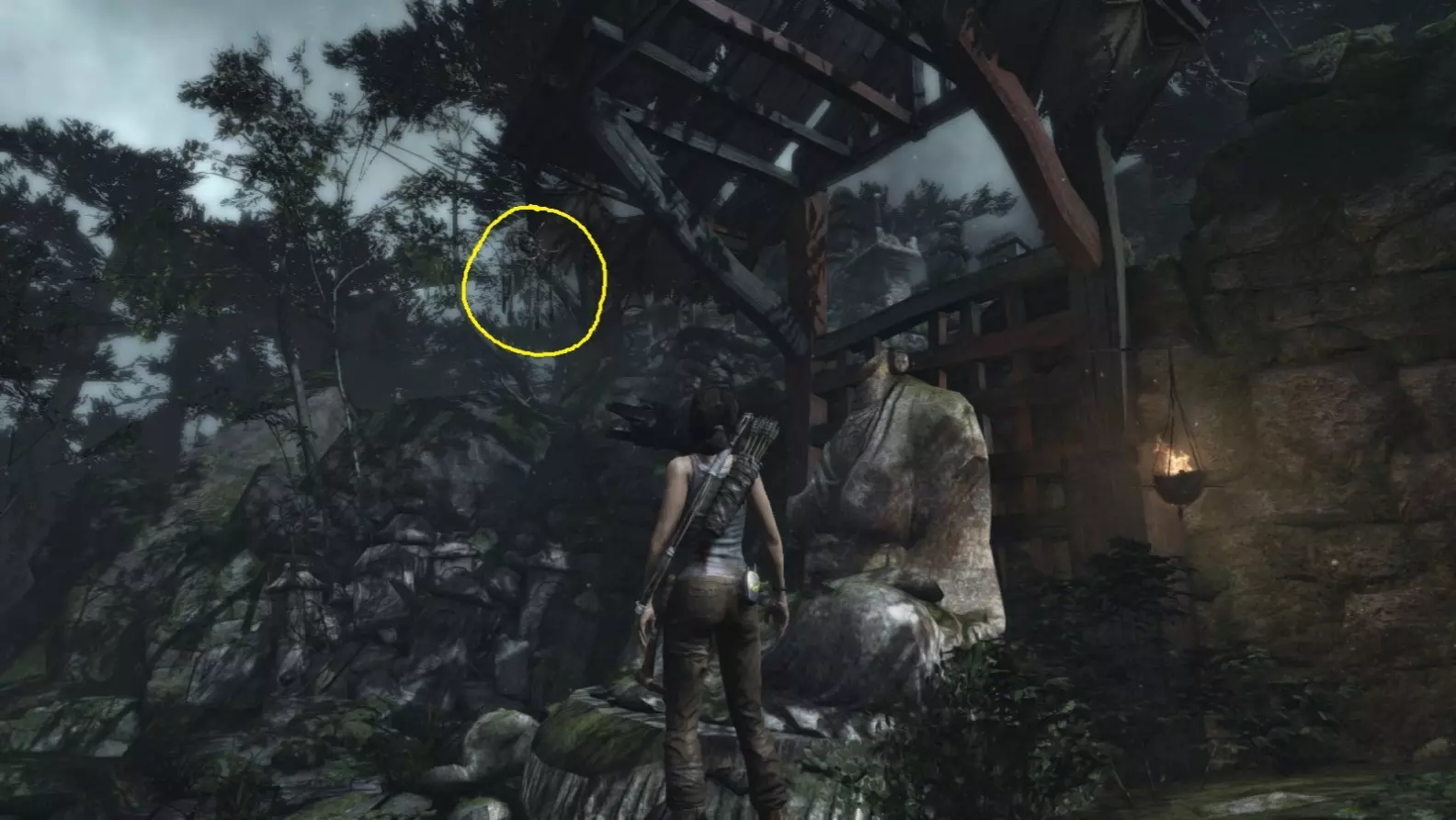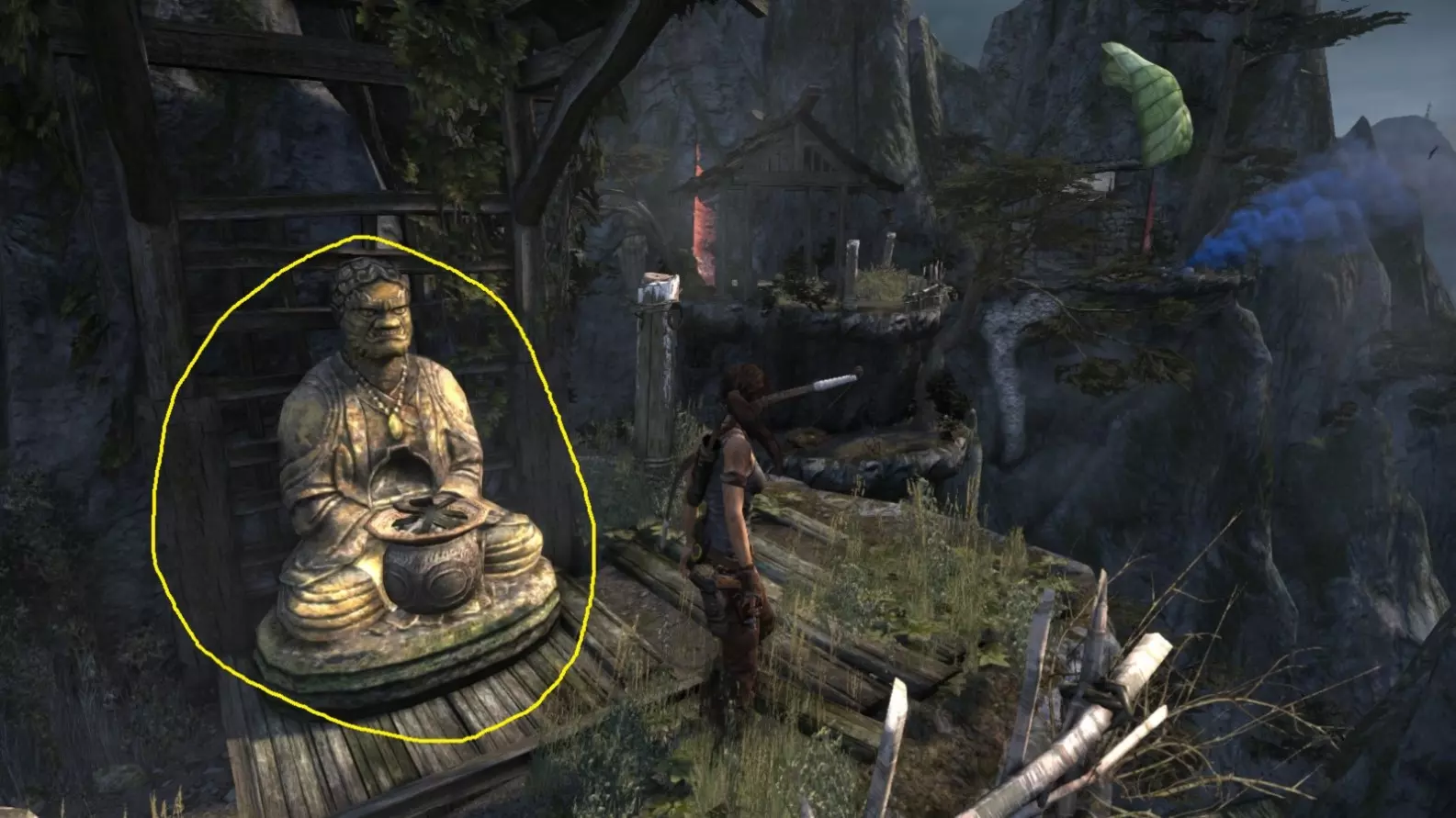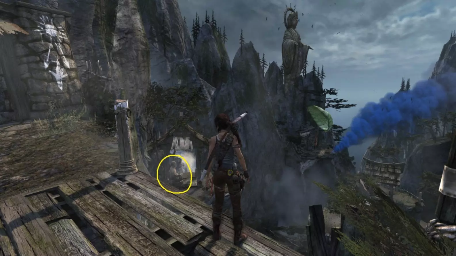 劳拉抵达雕像处,望向蓝烟飘来的方向。下一个目标:图片顶部(中央)的木质结构,那里狂风呼啸。 截图B - 光照7/10