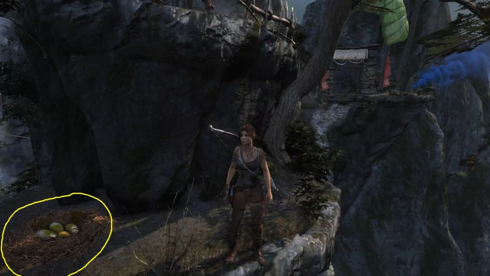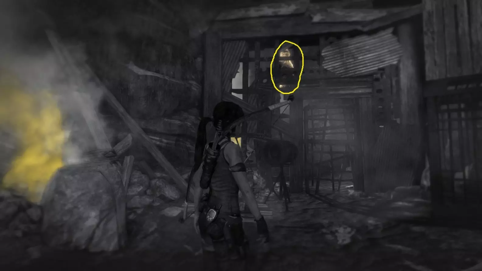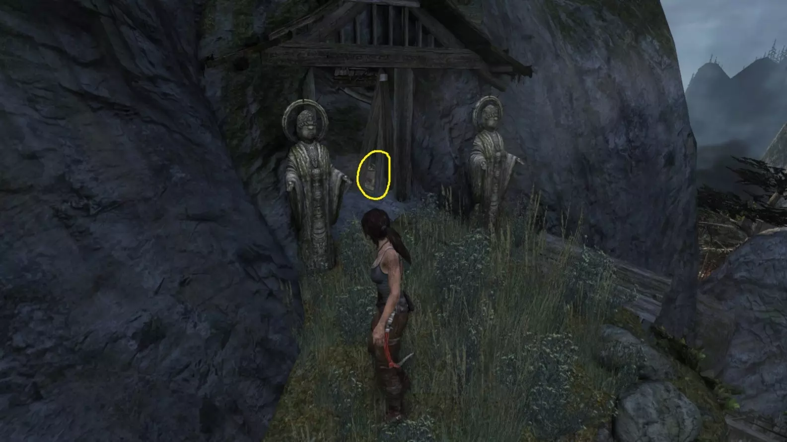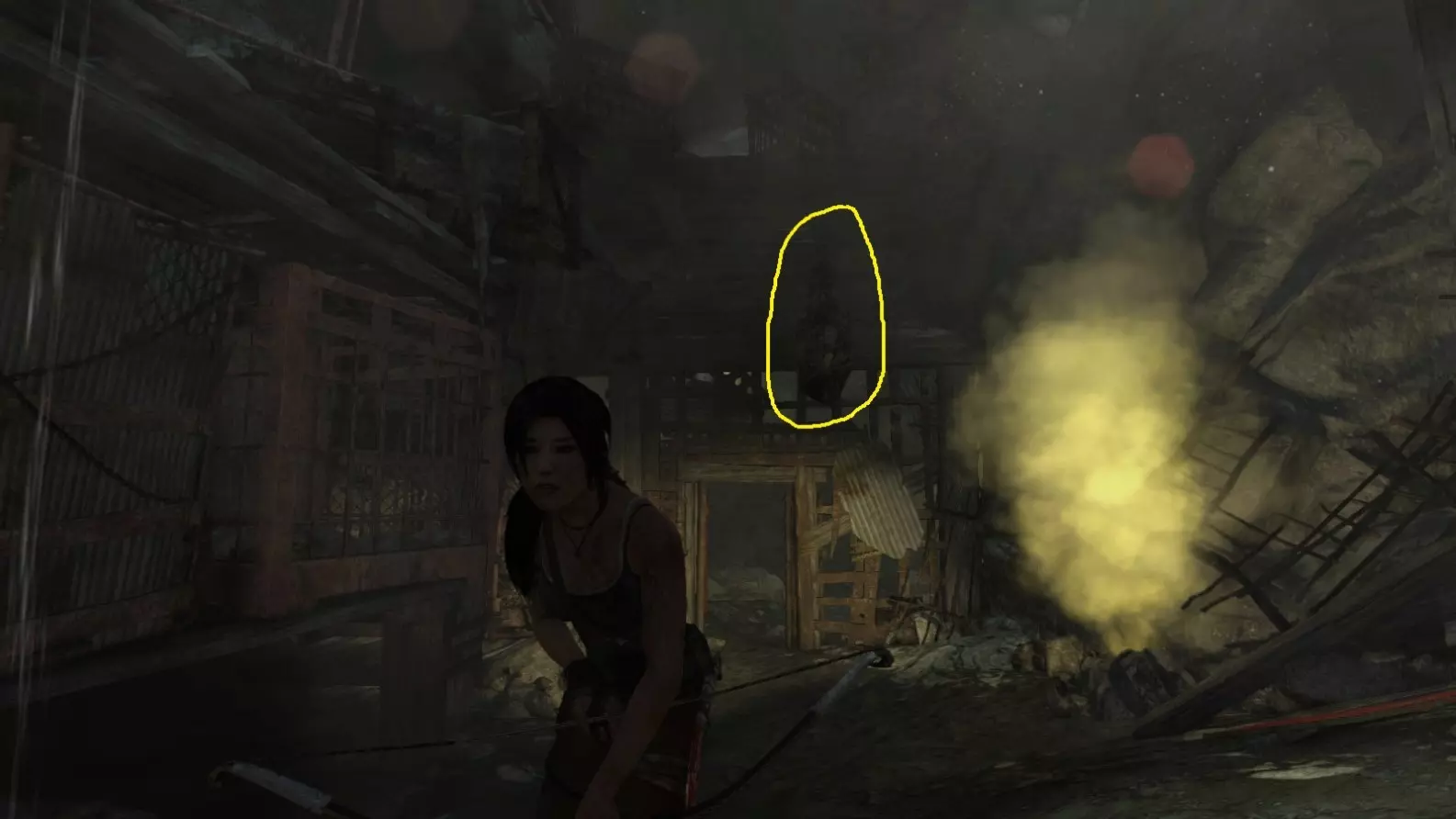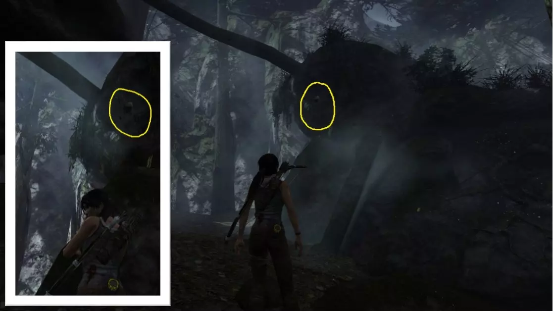 劳拉抵达雕像处,望向蓝烟飘来的方向。下一个目标:图片顶部(中央)的木质结构,那里狂风呼啸。 截图B - 光照7/10