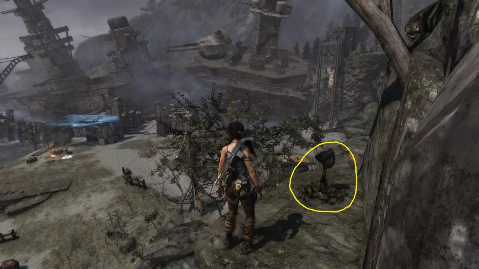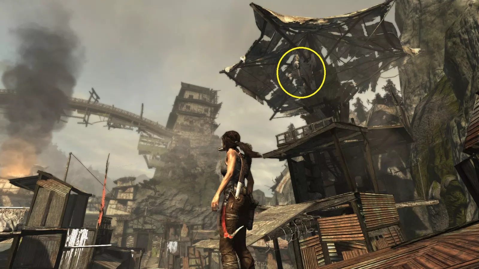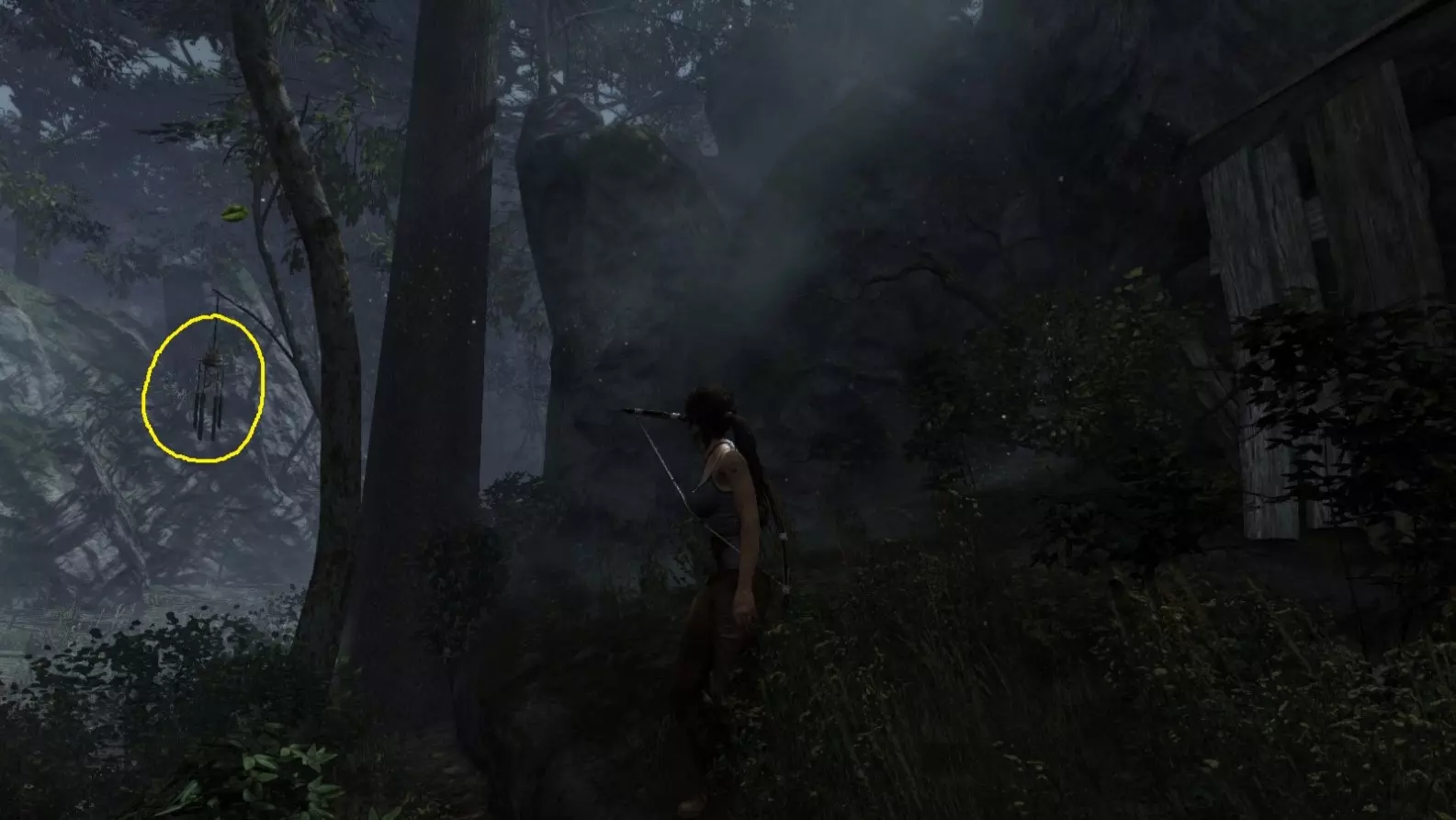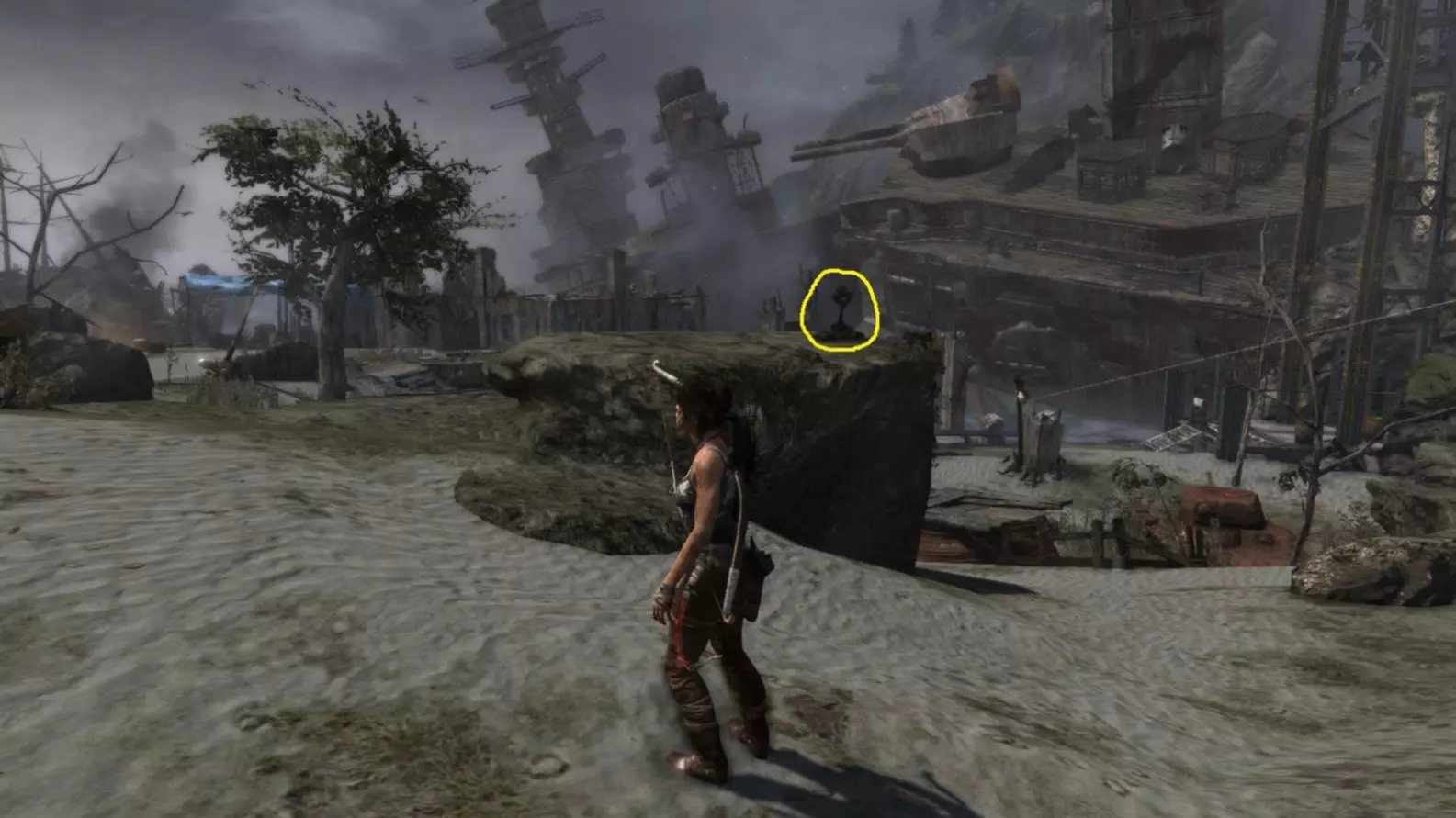 劳拉抵达雕像处,望向蓝烟飘来的方向。下一个目标:图片顶部(中央)的木质结构,那里狂风呼啸。 截图B - 光照7/10