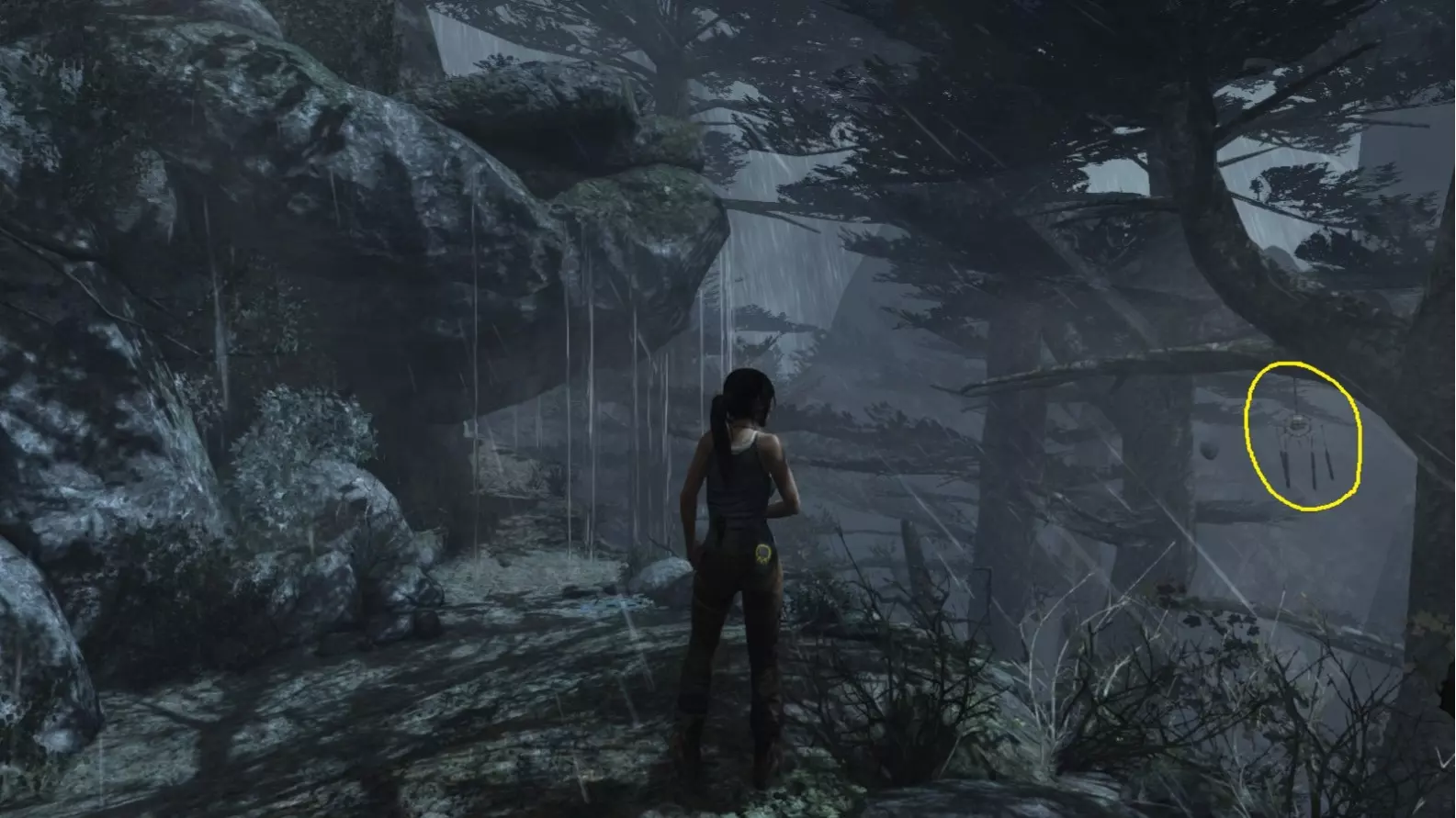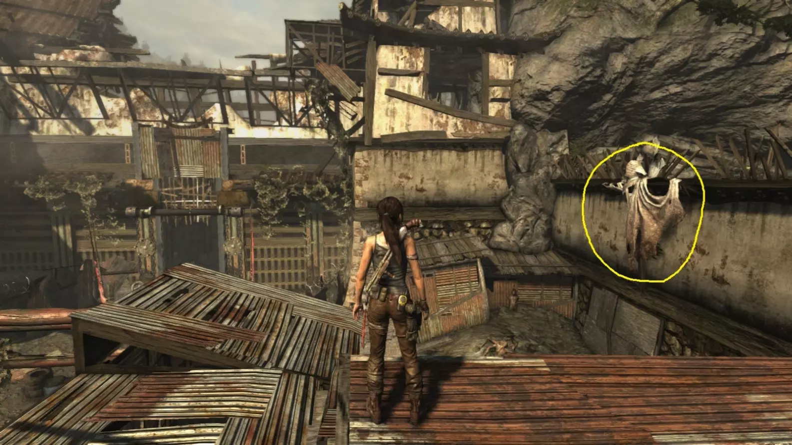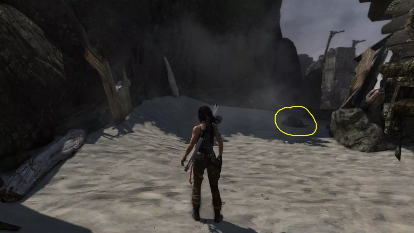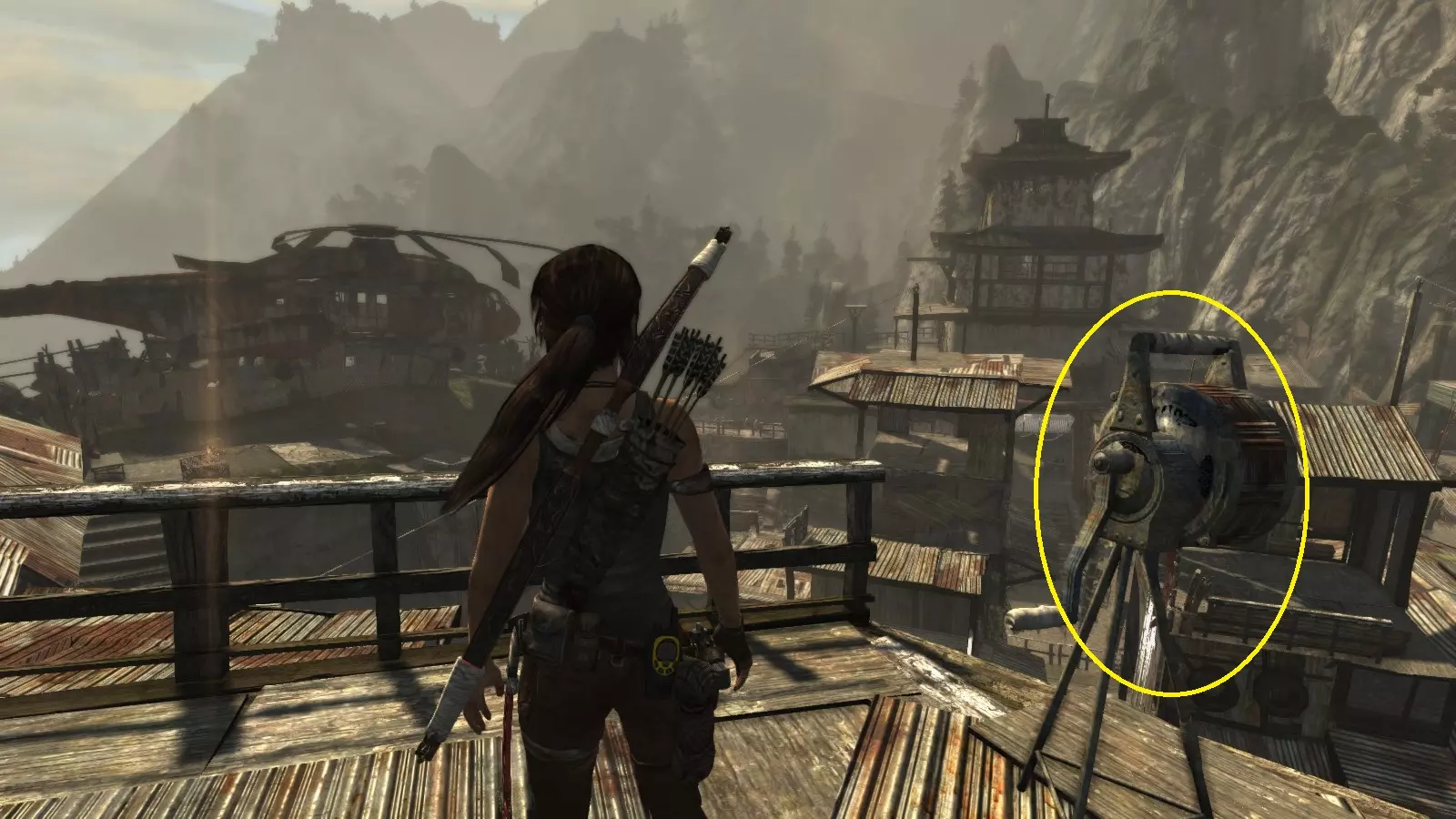 劳拉抵达雕像处,望向蓝烟飘来的方向。下一个目标:图片顶部(中央)的木质结构,那里狂风呼啸。 截图B - 光照7/10