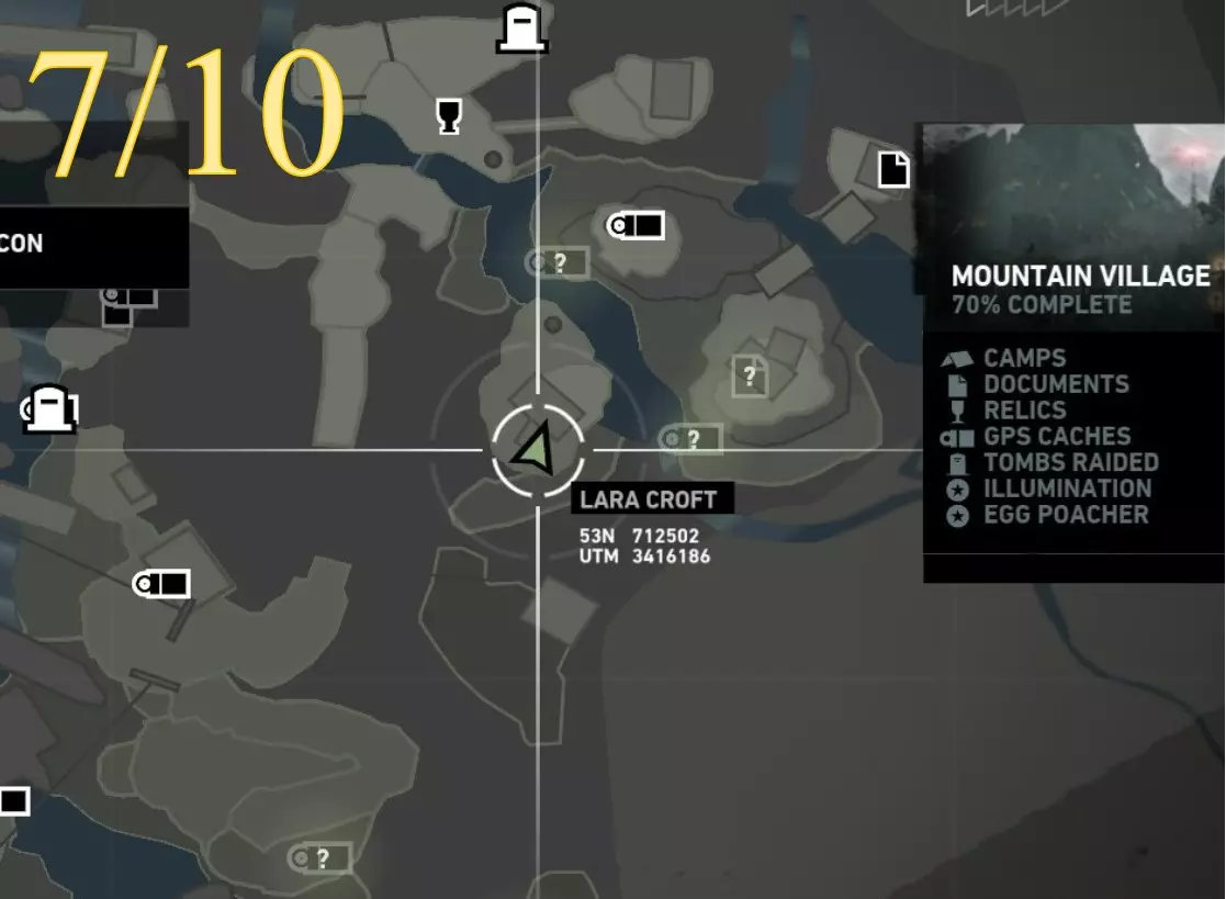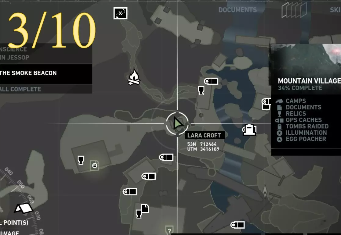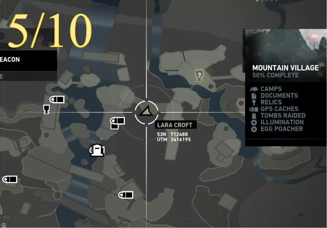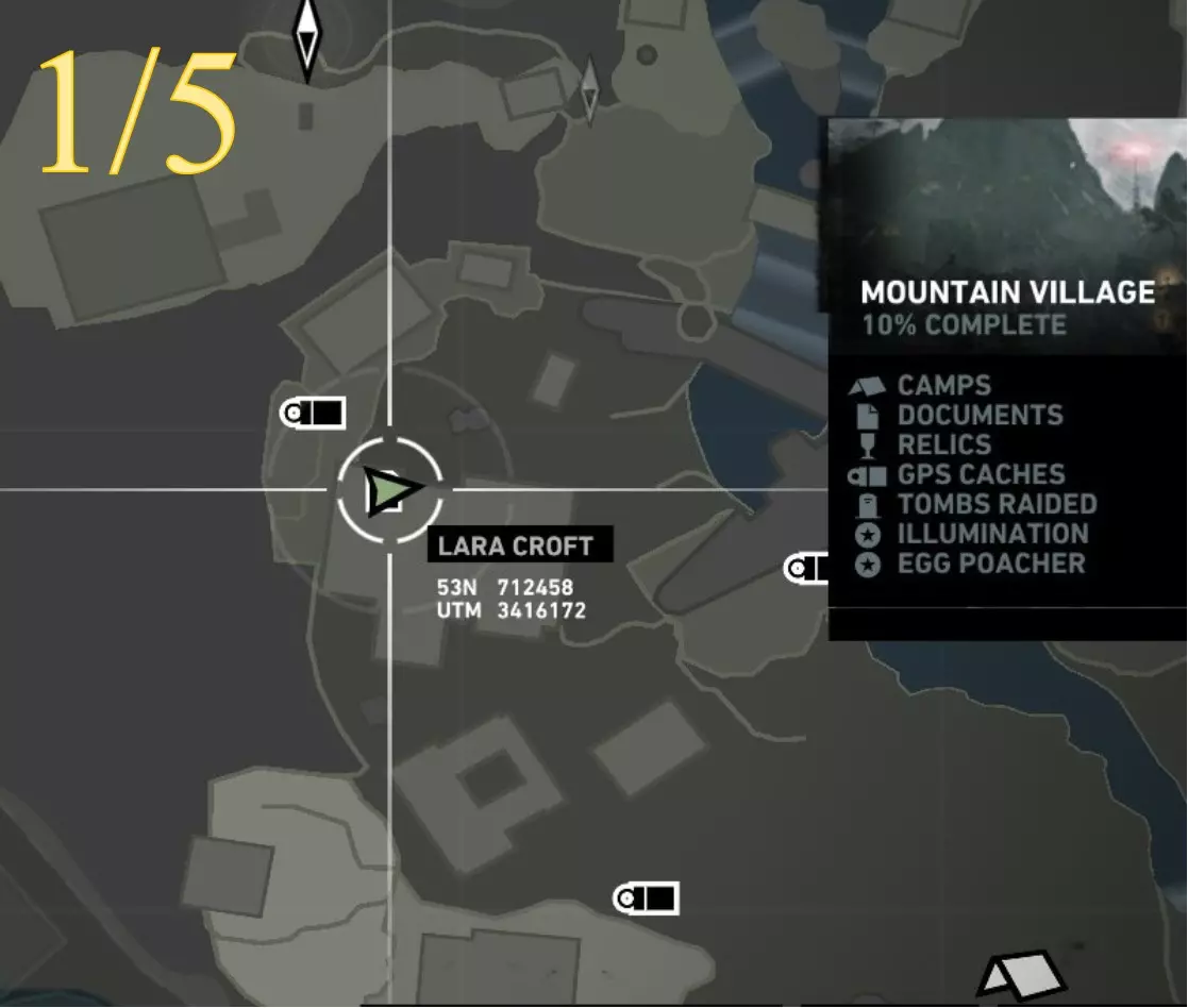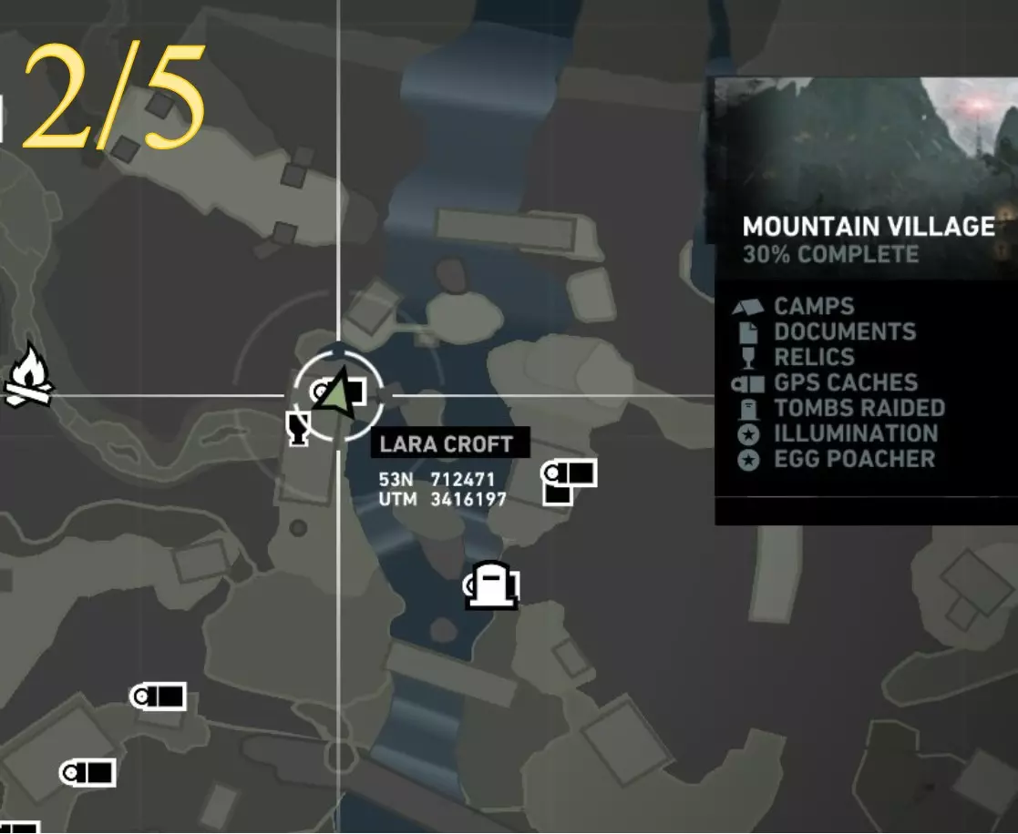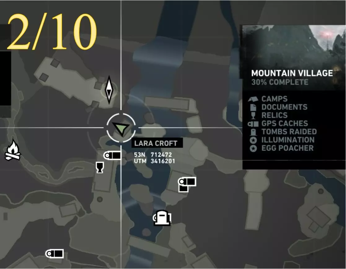 照明 - 物品9 区域:山村 最近的营地: a) 村庄俯瞰点(见地图下方重要说明) b) 村庄高地(见地图下方重要说明) 找到并点燃火盆 注意:需在劳拉到达无线电塔后才能进入 地图位置