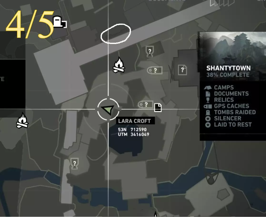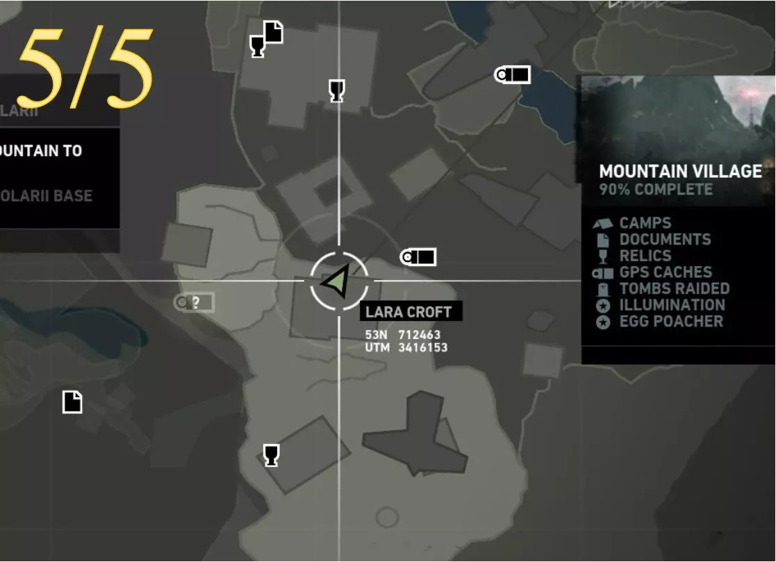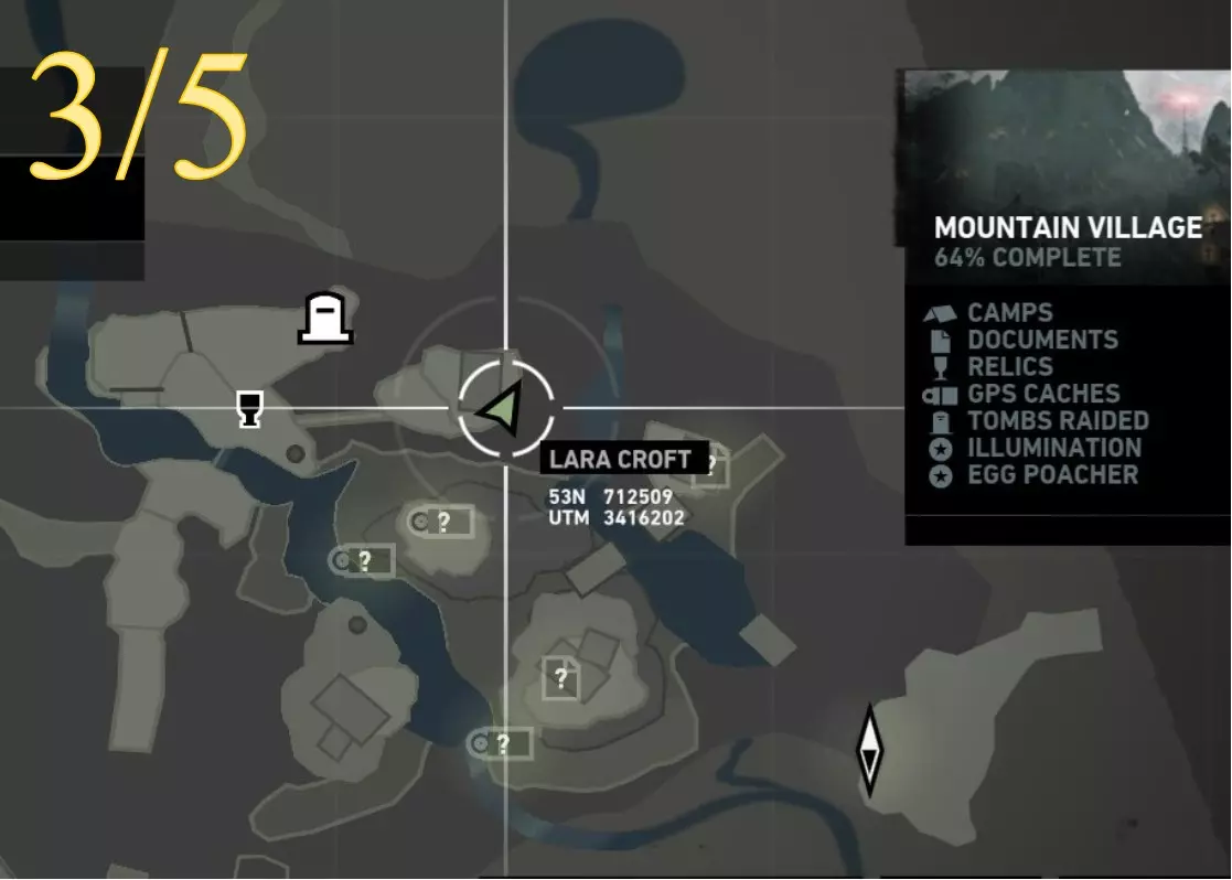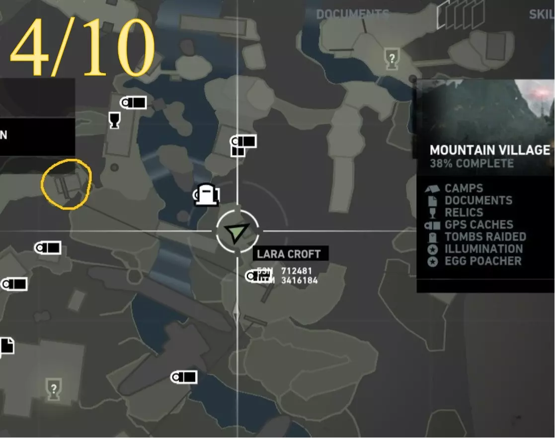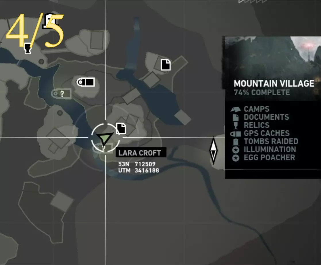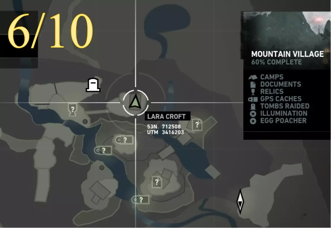 照明 - 物品9 区域:山村 最近的营地: a) 村庄俯瞰点(见地图下方重要说明) b) 村庄高地(见地图下方重要说明) 找到并点燃火盆 注意:需在劳拉到达无线电塔后才能进入 地图位置