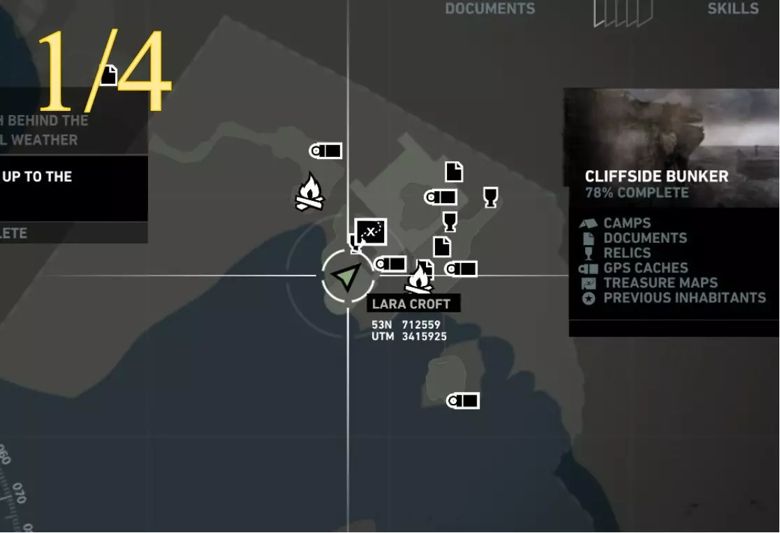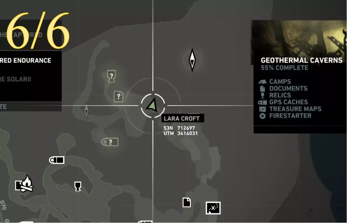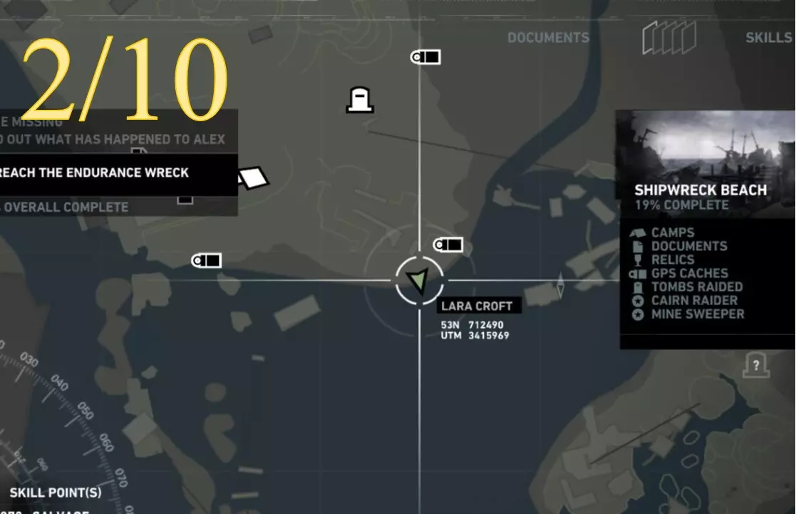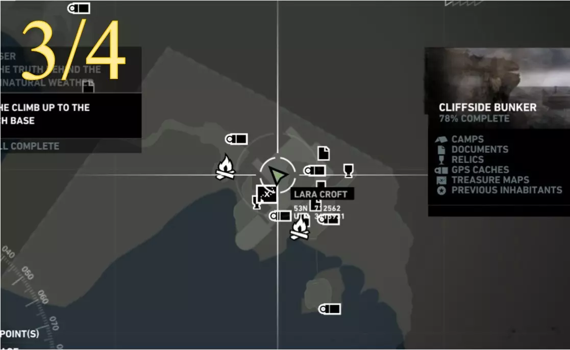 从更近处观察。 ***扫雷结束*** 挑战12:前任居住者 重要提示: 该区域没有基地(快速旅行)营地,只有日间营地。因此,若要从远处返回此处,劳拉需要快速旅行至相邻区域的基地营地:沉船海滩的幸存者营地。从那里她可以向东行进,返回悬崖地堡。
